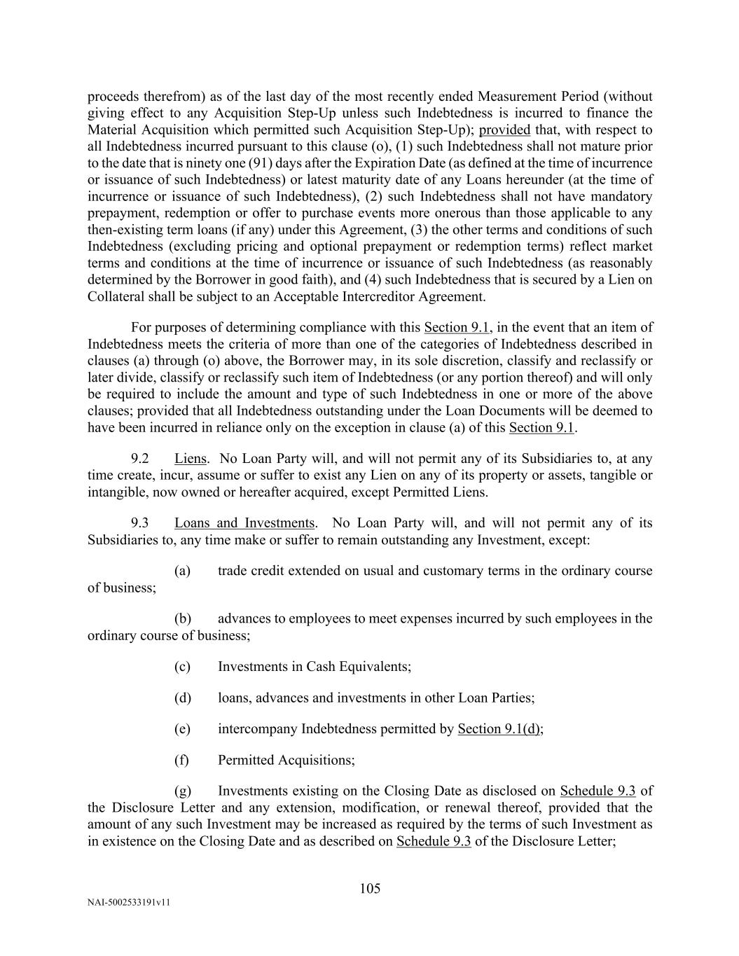 NAI-5002533191v11 105 proceeds therefrom) as of the last day of the most recently ended Measurement Period (without giving effect to any Acquisition Step-Up unless such Indebtedness is incurred to finance the Material Acquisition which permitted such Acquisition Step-Up); provided that, with respect to all Indebtedness incurred pursuant to this clause (o), (1) such Indebtedness shall not mature prior to the date that is ninety one (91) days after the Expiration Date (as defined at the time of incurrence or issuance of such Indebtedness) or latest maturity date of any Loans hereunder (at the time of incurrence or issuance of such Indebtedness), (2) such Indebtedness shall not have mandatory prepayment, redemption or offer to purchase events more onerous than those applicable to any then-existing term loans (if any) under this Agreement, (3) the other terms and conditions of such Indebtedness (excluding pricing and optional prepayment or redemption terms) reflect market terms and conditions at the time of incurrence or issuance of such Indebtedness (as reasonably determined by the Borrower in good faith), and (4) such Indebtedness that is secured by a Lien on Collateral shall be subject to an Acceptable Intercreditor Agreement. For purposes of determining compliance with this Section 9.1, in the event that an item of Indebtedness meets the criteria of more than one of the categories of Indebtedness described in clauses (a) through (o) above, the Borrower may, in its sole discretion, classify and reclassify or later divide, classify or reclassify such item of Indebtedness (or any portion thereof) and will only be required to include the amount and type of such Indebtedness in one or more of the above clauses; provided that all Indebtedness outstanding under the Loan Documents will be deemed to have been incurred in reliance only on the exception in clause (a) of this Section 9.1. 9.2 Liens. No Loan Party will, and will not permit any of its Subsidiaries to, at any time create, incur, assume or suffer to exist any Lien on any of its property or assets, tangible or intangible, now owned or hereafter acquired, except Permitted Liens. 9.3 Loans and Investments. No Loan Party will, and will not permit any of its Subsidiaries to, any time make or suffer to remain outstanding any Investment, except: (a) trade credit extended on usual and customary terms in the ordinary course of business; (b) advances to employees to meet expenses incurred by such employees in the ordinary course of business; (c) Investments in Cash Equivalents; (d) loans, advances and investments in other Loan Parties; (e) intercompany Indebtedness permitted by Section 9.1(d); (f) Permitted Acquisitions; (g) Investments existing on the Closing Date as disclosed on Schedule 9.3 of the Disclosure Letter and any extension, modification, or renewal thereof, provided that the amount of any such Investment may be increased as required by the terms of such Investment as in existence on the Closing Date and as described on Schedule 9.3 of the Disclosure Letter;