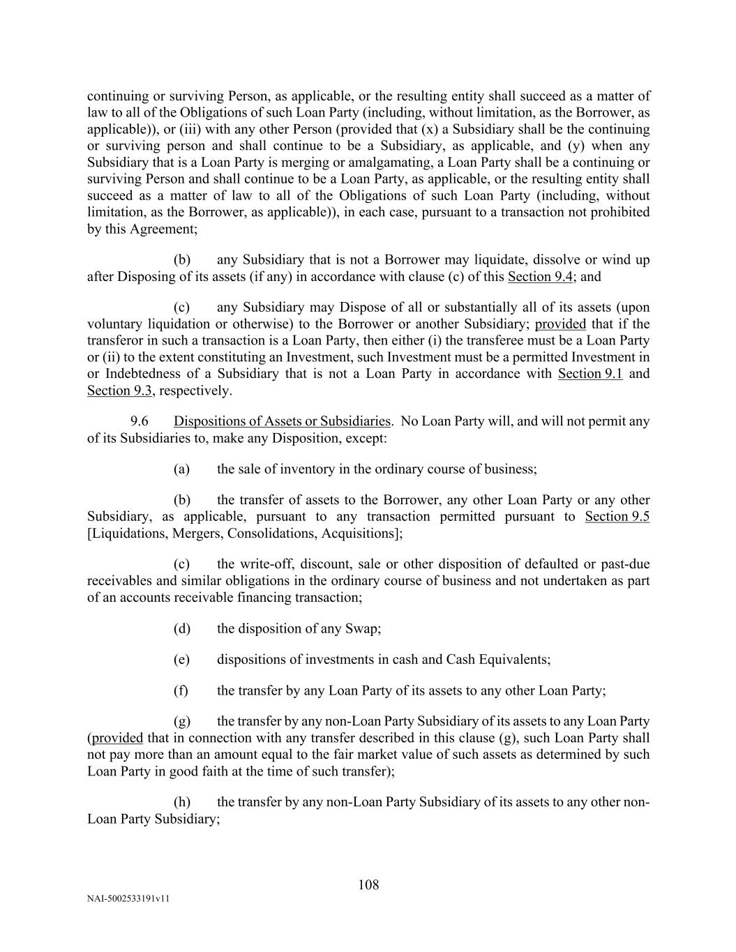 NAI-5002533191v11 108 continuing or surviving Person, as applicable, or the resulting entity shall succeed as a matter of law to all of the Obligations of such Loan Party (including, without limitation, as the Borrower, as applicable)), or (iii) with any other Person (provided that (x) a Subsidiary shall be the continuing or surviving person and shall continue to be a Subsidiary, as applicable, and (y) when any Subsidiary that is a Loan Party is merging or amalgamating, a Loan Party shall be a continuing or surviving Person and shall continue to be a Loan Party, as applicable, or the resulting entity shall succeed as a matter of law to all of the Obligations of such Loan Party (including, without limitation, as the Borrower, as applicable)), in each case, pursuant to a transaction not prohibited by this Agreement; (b) any Subsidiary that is not a Borrower may liquidate, dissolve or wind up after Disposing of its assets (if any) in accordance with clause (c) of this Section 9.4; and (c) any Subsidiary may Dispose of all or substantially all of its assets (upon voluntary liquidation or otherwise) to the Borrower or another Subsidiary; provided that if the transferor in such a transaction is a Loan Party, then either (i) the transferee must be a Loan Party or (ii) to the extent constituting an Investment, such Investment must be a permitted Investment in or Indebtedness of a Subsidiary that is not a Loan Party in accordance with Section 9.1 and Section 9.3, respectively. 9.6 Dispositions of Assets or Subsidiaries. No Loan Party will, and will not permit any of its Subsidiaries to, make any Disposition, except: (a) the sale of inventory in the ordinary course of business; (b) the transfer of assets to the Borrower, any other Loan Party or any other Subsidiary, as applicable, pursuant to any transaction permitted pursuant to Section 9.5 [Liquidations, Mergers, Consolidations, Acquisitions]; (c) the write-off, discount, sale or other disposition of defaulted or past-due receivables and similar obligations in the ordinary course of business and not undertaken as part of an accounts receivable financing transaction; (d) the disposition of any Swap; (e) dispositions of investments in cash and Cash Equivalents; (f) the transfer by any Loan Party of its assets to any other Loan Party; (g) the transfer by any non-Loan Party Subsidiary of its assets to any Loan Party (provided that in connection with any transfer described in this clause (g), such Loan Party shall not pay more than an amount equal to the fair market value of such assets as determined by such Loan Party in good faith at the time of such transfer); (h) the transfer by any non-Loan Party Subsidiary of its assets to any other non- Loan Party Subsidiary;