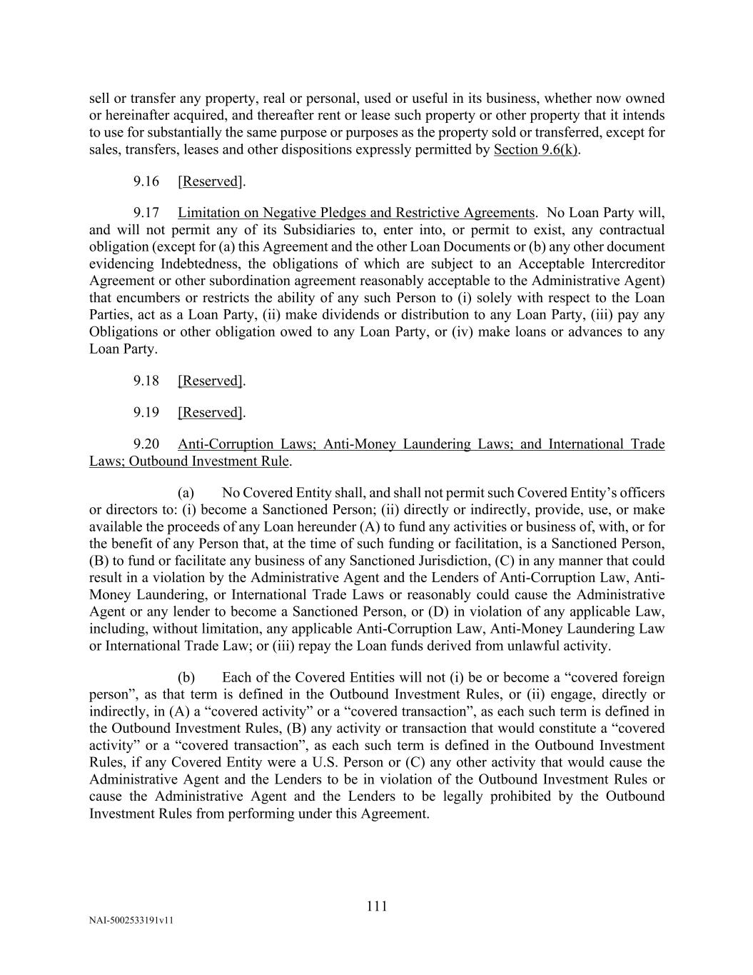 NAI-5002533191v11 111 sell or transfer any property, real or personal, used or useful in its business, whether now owned or hereinafter acquired, and thereafter rent or lease such property or other property that it intends to use for substantially the same purpose or purposes as the property sold or transferred, except for sales, transfers, leases and other dispositions expressly permitted by Section 9.6(k). 9.16 [Reserved]. 9.17 Limitation on Negative Pledges and Restrictive Agreements. No Loan Party will, and will not permit any of its Subsidiaries to, enter into, or permit to exist, any contractual obligation (except for (a) this Agreement and the other Loan Documents or (b) any other document evidencing Indebtedness, the obligations of which are subject to an Acceptable Intercreditor Agreement or other subordination agreement reasonably acceptable to the Administrative Agent) that encumbers or restricts the ability of any such Person to (i) solely with respect to the Loan Parties, act as a Loan Party, (ii) make dividends or distribution to any Loan Party, (iii) pay any Obligations or other obligation owed to any Loan Party, or (iv) make loans or advances to any Loan Party. 9.18 [Reserved]. 9.19 [Reserved]. 9.20 Anti-Corruption Laws; Anti-Money Laundering Laws; and International Trade Laws; Outbound Investment Rule. (a) No Covered Entity shall, and shall not permit such Covered Entity’s officers or directors to: (i) become a Sanctioned Person; (ii) directly or indirectly, provide, use, or make available the proceeds of any Loan hereunder (A) to fund any activities or business of, with, or for the benefit of any Person that, at the time of such funding or facilitation, is a Sanctioned Person, (B) to fund or facilitate any business of any Sanctioned Jurisdiction, (C) in any manner that could result in a violation by the Administrative Agent and the Lenders of Anti-Corruption Law, Anti- Money Laundering, or International Trade Laws or reasonably could cause the Administrative Agent or any lender to become a Sanctioned Person, or (D) in violation of any applicable Law, including, without limitation, any applicable Anti-Corruption Law, Anti-Money Laundering Law or International Trade Law; or (iii) repay the Loan funds derived from unlawful activity. (b) Each of the Covered Entities will not (i) be or become a “covered foreign person”, as that term is defined in the Outbound Investment Rules, or (ii) engage, directly or indirectly, in (A) a “covered activity” or a “covered transaction”, as each such term is defined in the Outbound Investment Rules, (B) any activity or transaction that would constitute a “covered activity” or a “covered transaction”, as each such term is defined in the Outbound Investment Rules, if any Covered Entity were a U.S. Person or (C) any other activity that would cause the Administrative Agent and the Lenders to be in violation of the Outbound Investment Rules or cause the Administrative Agent and the Lenders to be legally prohibited by the Outbound Investment Rules from performing under this Agreement.