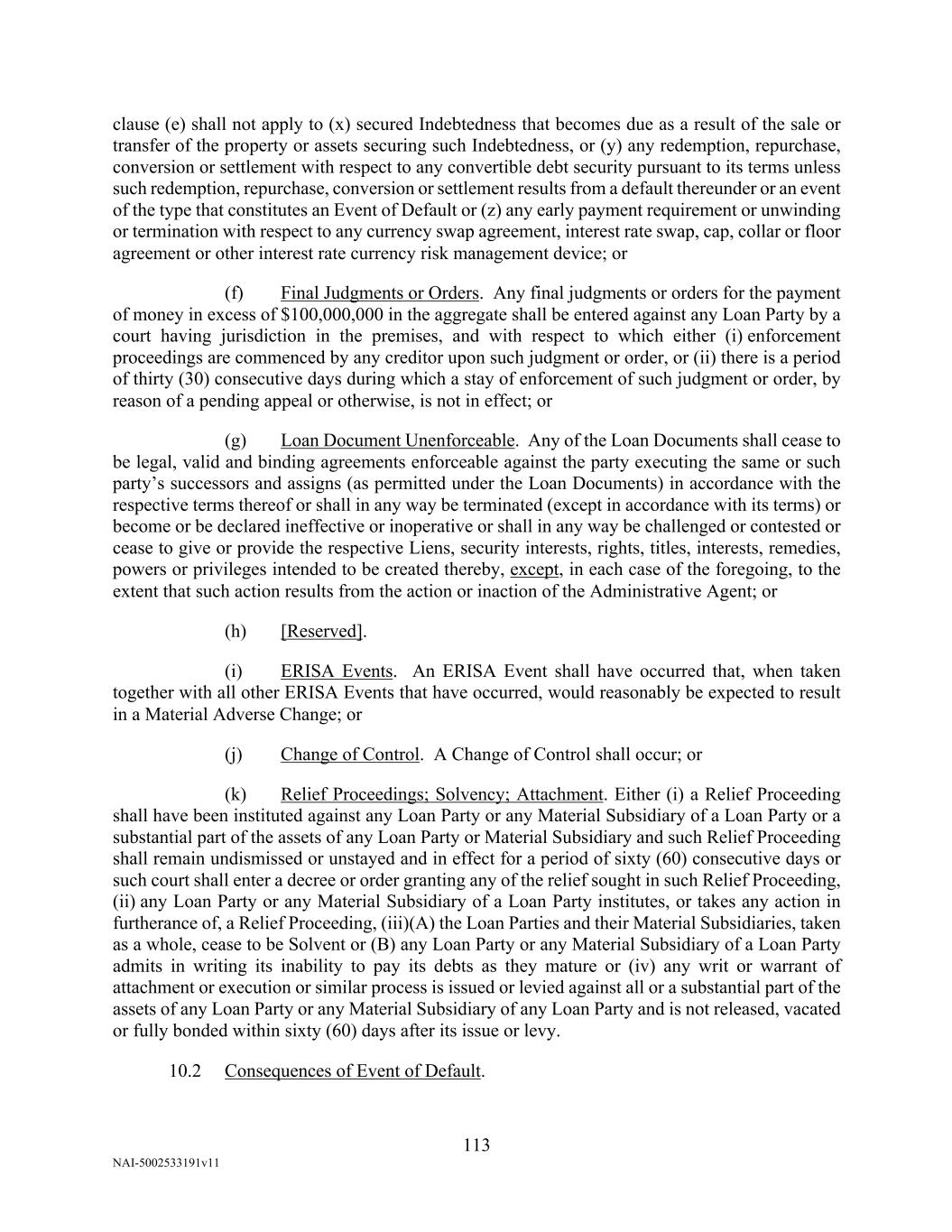 NAI-5002533191v11 113 clause (e) shall not apply to (x) secured Indebtedness that becomes due as a result of the sale or transfer of the property or assets securing such Indebtedness, or (y) any redemption, repurchase, conversion or settlement with respect to any convertible debt security pursuant to its terms unless such redemption, repurchase, conversion or settlement results from a default thereunder or an event of the type that constitutes an Event of Default or (z) any early payment requirement or unwinding or termination with respect to any currency swap agreement, interest rate swap, cap, collar or floor agreement or other interest rate currency risk management device; or (f) Final Judgments or Orders. Any final judgments or orders for the payment of money in excess of $100,000,000 in the aggregate shall be entered against any Loan Party by a court having jurisdiction in the premises, and with respect to which either (i) enforcement proceedings are commenced by any creditor upon such judgment or order, or (ii) there is a period of thirty (30) consecutive days during which a stay of enforcement of such judgment or order, by reason of a pending appeal or otherwise, is not in effect; or (g) Loan Document Unenforceable. Any of the Loan Documents shall cease to be legal, valid and binding agreements enforceable against the party executing the same or such party’s successors and assigns (as permitted under the Loan Documents) in accordance with the respective terms thereof or shall in any way be terminated (except in accordance with its terms) or become or be declared ineffective or inoperative or shall in any way be challenged or contested or cease to give or provide the respective Liens, security interests, rights, titles, interests, remedies, powers or privileges intended to be created thereby, except, in each case of the foregoing, to the extent that such action results from the action or inaction of the Administrative Agent; or (h) [Reserved]. (i) ERISA Events. An ERISA Event shall have occurred that, when taken together with all other ERISA Events that have occurred, would reasonably be expected to result in a Material Adverse Change; or (j) Change of Control. A Change of Control shall occur; or (k) Relief Proceedings; Solvency; Attachment. Either (i) a Relief Proceeding shall have been instituted against any Loan Party or any Material Subsidiary of a Loan Party or a substantial part of the assets of any Loan Party or Material Subsidiary and such Relief Proceeding shall remain undismissed or unstayed and in effect for a period of sixty (60) consecutive days or such court shall enter a decree or order granting any of the relief sought in such Relief Proceeding, (ii) any Loan Party or any Material Subsidiary of a Loan Party institutes, or takes any action in furtherance of, a Relief Proceeding, (iii)(A) the Loan Parties and their Material Subsidiaries, taken as a whole, cease to be Solvent or (B) any Loan Party or any Material Subsidiary of a Loan Party admits in writing its inability to pay its debts as they mature or (iv) any writ or warrant of attachment or execution or similar process is issued or levied against all or a substantial part of the assets of any Loan Party or any Material Subsidiary of any Loan Party and is not released, vacated or fully bonded within sixty (60) days after its issue or levy. 10.2 Consequences of Event of Default.