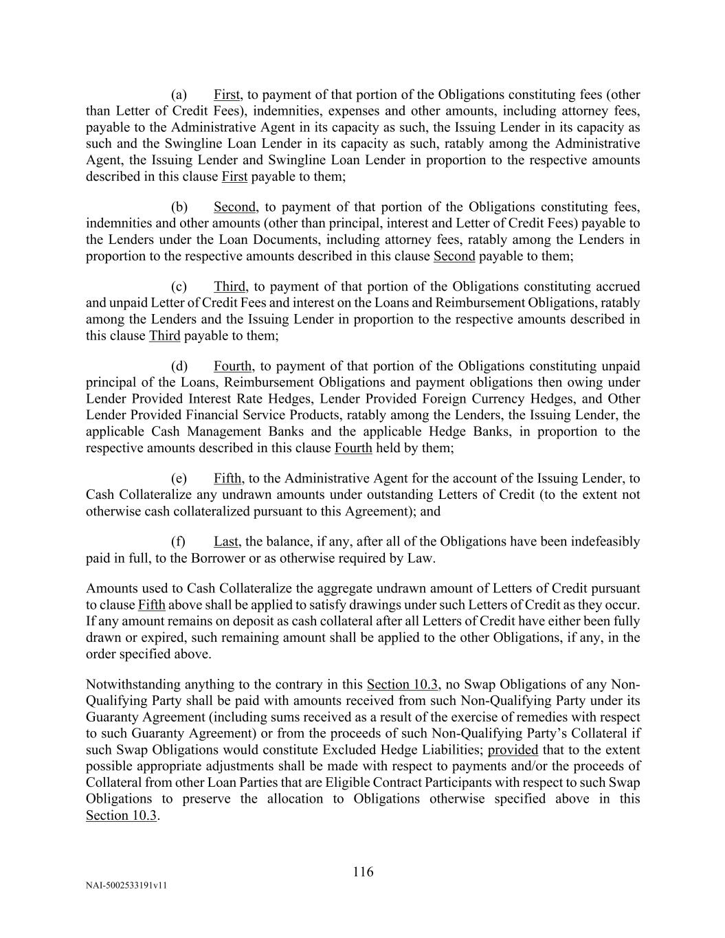 NAI-5002533191v11 116 (a) First, to payment of that portion of the Obligations constituting fees (other than Letter of Credit Fees), indemnities, expenses and other amounts, including attorney fees, payable to the Administrative Agent in its capacity as such, the Issuing Lender in its capacity as such and the Swingline Loan Lender in its capacity as such, ratably among the Administrative Agent, the Issuing Lender and Swingline Loan Lender in proportion to the respective amounts described in this clause First payable to them; (b) Second, to payment of that portion of the Obligations constituting fees, indemnities and other amounts (other than principal, interest and Letter of Credit Fees) payable to the Lenders under the Loan Documents, including attorney fees, ratably among the Lenders in proportion to the respective amounts described in this clause Second payable to them; (c) Third, to payment of that portion of the Obligations constituting accrued and unpaid Letter of Credit Fees and interest on the Loans and Reimbursement Obligations, ratably among the Lenders and the Issuing Lender in proportion to the respective amounts described in this clause Third payable to them; (d) Fourth, to payment of that portion of the Obligations constituting unpaid principal of the Loans, Reimbursement Obligations and payment obligations then owing under Lender Provided Interest Rate Hedges, Lender Provided Foreign Currency Hedges, and Other Lender Provided Financial Service Products, ratably among the Lenders, the Issuing Lender, the applicable Cash Management Banks and the applicable Hedge Banks, in proportion to the respective amounts described in this clause Fourth held by them; (e) Fifth, to the Administrative Agent for the account of the Issuing Lender, to Cash Collateralize any undrawn amounts under outstanding Letters of Credit (to the extent not otherwise cash collateralized pursuant to this Agreement); and (f) Last, the balance, if any, after all of the Obligations have been indefeasibly paid in full, to the Borrower or as otherwise required by Law. Amounts used to Cash Collateralize the aggregate undrawn amount of Letters of Credit pursuant to clause Fifth above shall be applied to satisfy drawings under such Letters of Credit as they occur. If any amount remains on deposit as cash collateral after all Letters of Credit have either been fully drawn or expired, such remaining amount shall be applied to the other Obligations, if any, in the order specified above. Notwithstanding anything to the contrary in this Section 10.3, no Swap Obligations of any Non- Qualifying Party shall be paid with amounts received from such Non-Qualifying Party under its Guaranty Agreement (including sums received as a result of the exercise of remedies with respect to such Guaranty Agreement) or from the proceeds of such Non-Qualifying Party’s Collateral if such Swap Obligations would constitute Excluded Hedge Liabilities; provided that to the extent possible appropriate adjustments shall be made with respect to payments and/or the proceeds of Collateral from other Loan Parties that are Eligible Contract Participants with respect to such Swap Obligations to preserve the allocation to Obligations otherwise specified above in this Section 10.3.