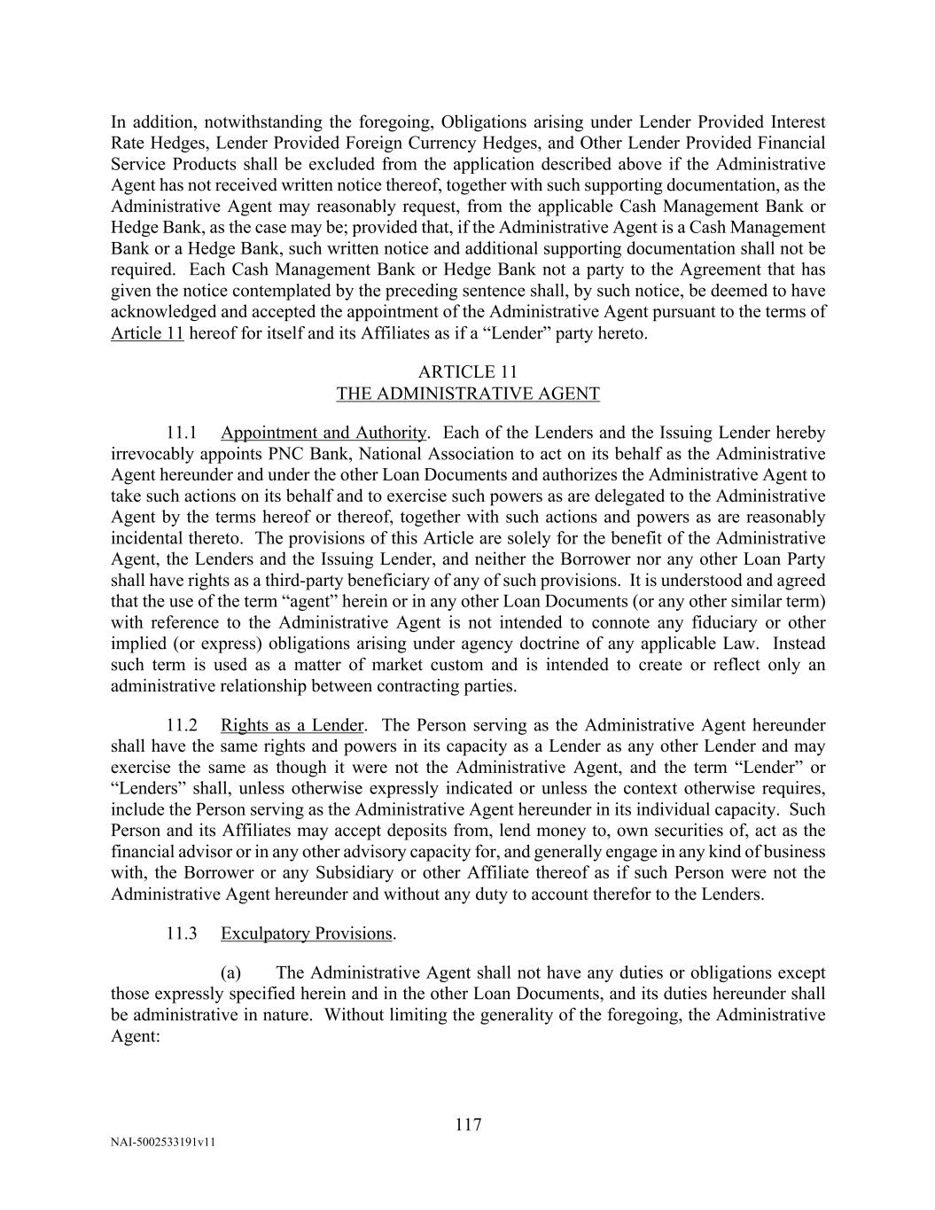 NAI-5002533191v11 117 In addition, notwithstanding the foregoing, Obligations arising under Lender Provided Interest Rate Hedges, Lender Provided Foreign Currency Hedges, and Other Lender Provided Financial Service Products shall be excluded from the application described above if the Administrative Agent has not received written notice thereof, together with such supporting documentation, as the Administrative Agent may reasonably request, from the applicable Cash Management Bank or Hedge Bank, as the case may be; provided that, if the Administrative Agent is a Cash Management Bank or a Hedge Bank, such written notice and additional supporting documentation shall not be required. Each Cash Management Bank or Hedge Bank not a party to the Agreement that has given the notice contemplated by the preceding sentence shall, by such notice, be deemed to have acknowledged and accepted the appointment of the Administrative Agent pursuant to the terms of Article 11 hereof for itself and its Affiliates as if a “Lender” party hereto. ARTICLE 11 THE ADMINISTRATIVE AGENT 11.1 Appointment and Authority. Each of the Lenders and the Issuing Lender hereby irrevocably appoints PNC Bank, National Association to act on its behalf as the Administrative Agent hereunder and under the other Loan Documents and authorizes the Administrative Agent to take such actions on its behalf and to exercise such powers as are delegated to the Administrative Agent by the terms hereof or thereof, together with such actions and powers as are reasonably incidental thereto. The provisions of this Article are solely for the benefit of the Administrative Agent, the Lenders and the Issuing Lender, and neither the Borrower nor any other Loan Party shall have rights as a third-party beneficiary of any of such provisions. It is understood and agreed that the use of the term “agent” herein or in any other Loan Documents (or any other similar term) with reference to the Administrative Agent is not intended to connote any fiduciary or other implied (or express) obligations arising under agency doctrine of any applicable Law. Instead such term is used as a matter of market custom and is intended to create or reflect only an administrative relationship between contracting parties. 11.2 Rights as a Lender. The Person serving as the Administrative Agent hereunder shall have the same rights and powers in its capacity as a Lender as any other Lender and may exercise the same as though it were not the Administrative Agent, and the term “Lender” or “Lenders” shall, unless otherwise expressly indicated or unless the context otherwise requires, include the Person serving as the Administrative Agent hereunder in its individual capacity. Such Person and its Affiliates may accept deposits from, lend money to, own securities of, act as the financial advisor or in any other advisory capacity for, and generally engage in any kind of business with, the Borrower or any Subsidiary or other Affiliate thereof as if such Person were not the Administrative Agent hereunder and without any duty to account therefor to the Lenders. 11.3 Exculpatory Provisions. (a) The Administrative Agent shall not have any duties or obligations except those expressly specified herein and in the other Loan Documents, and its duties hereunder shall be administrative in nature. Without limiting the generality of the foregoing, the Administrative Agent: