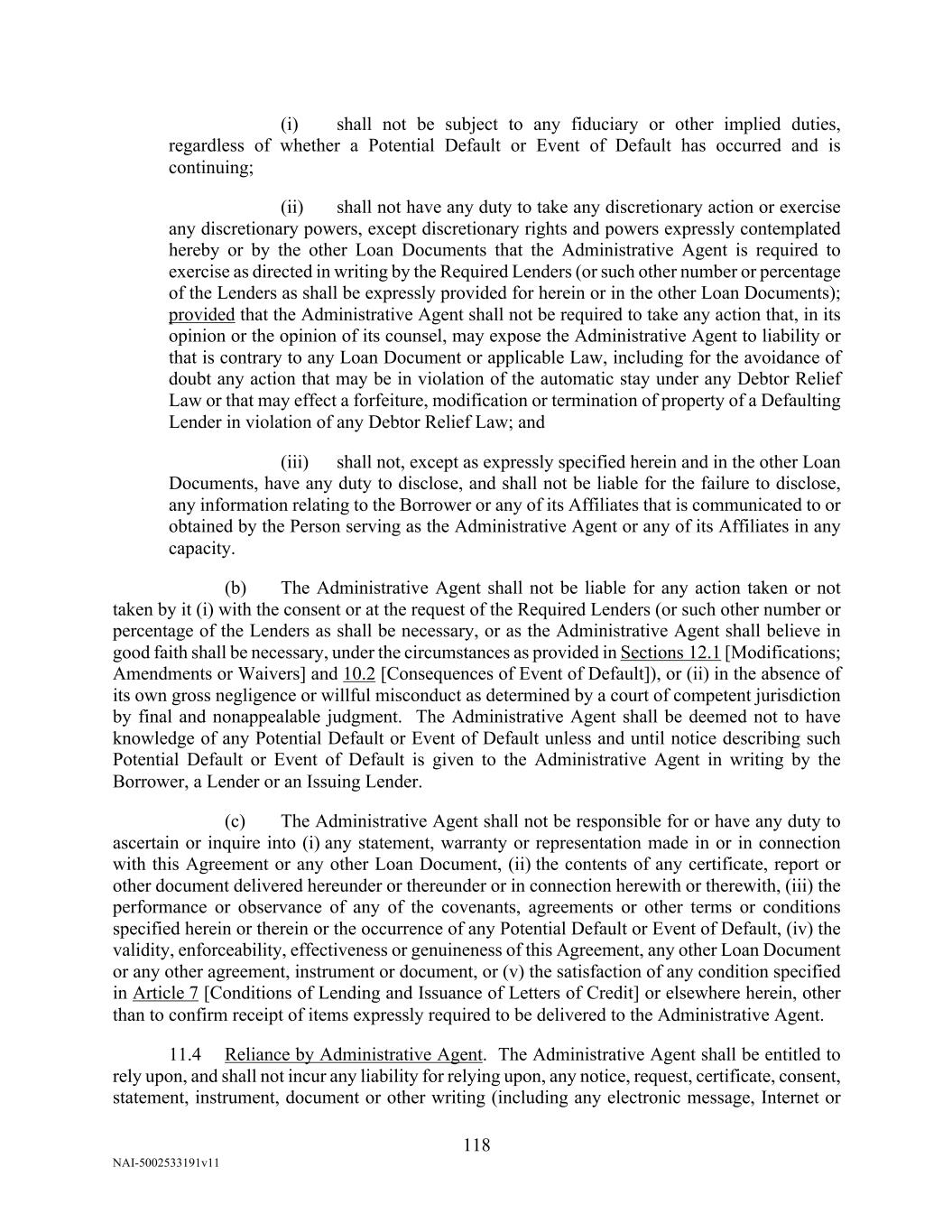 NAI-5002533191v11 118 (i) shall not be subject to any fiduciary or other implied duties, regardless of whether a Potential Default or Event of Default has occurred and is continuing; (ii) shall not have any duty to take any discretionary action or exercise any discretionary powers, except discretionary rights and powers expressly contemplated hereby or by the other Loan Documents that the Administrative Agent is required to exercise as directed in writing by the Required Lenders (or such other number or percentage of the Lenders as shall be expressly provided for herein or in the other Loan Documents); provided that the Administrative Agent shall not be required to take any action that, in its opinion or the opinion of its counsel, may expose the Administrative Agent to liability or that is contrary to any Loan Document or applicable Law, including for the avoidance of doubt any action that may be in violation of the automatic stay under any Debtor Relief Law or that may effect a forfeiture, modification or termination of property of a Defaulting Lender in violation of any Debtor Relief Law; and (iii) shall not, except as expressly specified herein and in the other Loan Documents, have any duty to disclose, and shall not be liable for the failure to disclose, any information relating to the Borrower or any of its Affiliates that is communicated to or obtained by the Person serving as the Administrative Agent or any of its Affiliates in any capacity. (b) The Administrative Agent shall not be liable for any action taken or not taken by it (i) with the consent or at the request of the Required Lenders (or such other number or percentage of the Lenders as shall be necessary, or as the Administrative Agent shall believe in good faith shall be necessary, under the circumstances as provided in Sections 12.1 [Modifications; Amendments or Waivers] and 10.2 [Consequences of Event of Default]), or (ii) in the absence of its own gross negligence or willful misconduct as determined by a court of competent jurisdiction by final and nonappealable judgment. The Administrative Agent shall be deemed not to have knowledge of any Potential Default or Event of Default unless and until notice describing such Potential Default or Event of Default is given to the Administrative Agent in writing by the Borrower, a Lender or an Issuing Lender. (c) The Administrative Agent shall not be responsible for or have any duty to ascertain or inquire into (i) any statement, warranty or representation made in or in connection with this Agreement or any other Loan Document, (ii) the contents of any certificate, report or other document delivered hereunder or thereunder or in connection herewith or therewith, (iii) the performance or observance of any of the covenants, agreements or other terms or conditions specified herein or therein or the occurrence of any Potential Default or Event of Default, (iv) the validity, enforceability, effectiveness or genuineness of this Agreement, any other Loan Document or any other agreement, instrument or document, or (v) the satisfaction of any condition specified in Article 7 [Conditions of Lending and Issuance of Letters of Credit] or elsewhere herein, other than to confirm receipt of items expressly required to be delivered to the Administrative Agent. 11.4 Reliance by Administrative Agent. The Administrative Agent shall be entitled to rely upon, and shall not incur any liability for relying upon, any notice, request, certificate, consent, statement, instrument, document or other writing (including any electronic message, Internet or