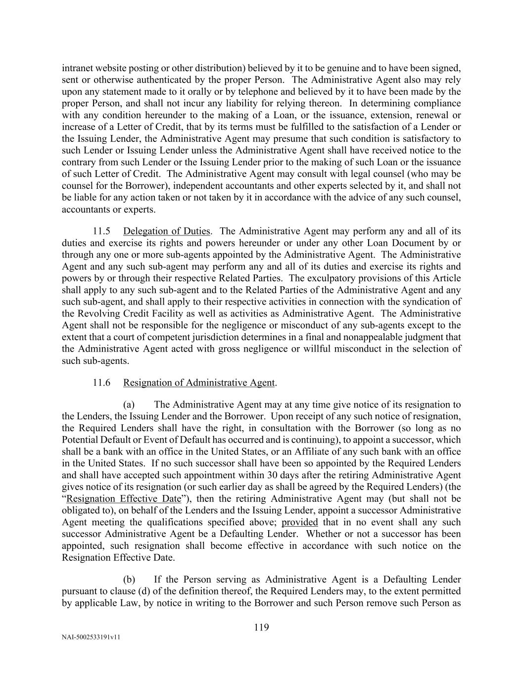 NAI-5002533191v11 119 intranet website posting or other distribution) believed by it to be genuine and to have been signed, sent or otherwise authenticated by the proper Person. The Administrative Agent also may rely upon any statement made to it orally or by telephone and believed by it to have been made by the proper Person, and shall not incur any liability for relying thereon. In determining compliance with any condition hereunder to the making of a Loan, or the issuance, extension, renewal or increase of a Letter of Credit, that by its terms must be fulfilled to the satisfaction of a Lender or the Issuing Lender, the Administrative Agent may presume that such condition is satisfactory to such Lender or Issuing Lender unless the Administrative Agent shall have received notice to the contrary from such Lender or the Issuing Lender prior to the making of such Loan or the issuance of such Letter of Credit. The Administrative Agent may consult with legal counsel (who may be counsel for the Borrower), independent accountants and other experts selected by it, and shall not be liable for any action taken or not taken by it in accordance with the advice of any such counsel, accountants or experts. 11.5 Delegation of Duties. The Administrative Agent may perform any and all of its duties and exercise its rights and powers hereunder or under any other Loan Document by or through any one or more sub-agents appointed by the Administrative Agent. The Administrative Agent and any such sub-agent may perform any and all of its duties and exercise its rights and powers by or through their respective Related Parties. The exculpatory provisions of this Article shall apply to any such sub-agent and to the Related Parties of the Administrative Agent and any such sub-agent, and shall apply to their respective activities in connection with the syndication of the Revolving Credit Facility as well as activities as Administrative Agent. The Administrative Agent shall not be responsible for the negligence or misconduct of any sub-agents except to the extent that a court of competent jurisdiction determines in a final and nonappealable judgment that the Administrative Agent acted with gross negligence or willful misconduct in the selection of such sub-agents. 11.6 Resignation of Administrative Agent. (a) The Administrative Agent may at any time give notice of its resignation to the Lenders, the Issuing Lender and the Borrower. Upon receipt of any such notice of resignation, the Required Lenders shall have the right, in consultation with the Borrower (so long as no Potential Default or Event of Default has occurred and is continuing), to appoint a successor, which shall be a bank with an office in the United States, or an Affiliate of any such bank with an office in the United States. If no such successor shall have been so appointed by the Required Lenders and shall have accepted such appointment within 30 days after the retiring Administrative Agent gives notice of its resignation (or such earlier day as shall be agreed by the Required Lenders) (the “Resignation Effective Date”), then the retiring Administrative Agent may (but shall not be obligated to), on behalf of the Lenders and the Issuing Lender, appoint a successor Administrative Agent meeting the qualifications specified above; provided that in no event shall any such successor Administrative Agent be a Defaulting Lender. Whether or not a successor has been appointed, such resignation shall become effective in accordance with such notice on the Resignation Effective Date. (b) If the Person serving as Administrative Agent is a Defaulting Lender pursuant to clause (d) of the definition thereof, the Required Lenders may, to the extent permitted by applicable Law, by notice in writing to the Borrower and such Person remove such Person as