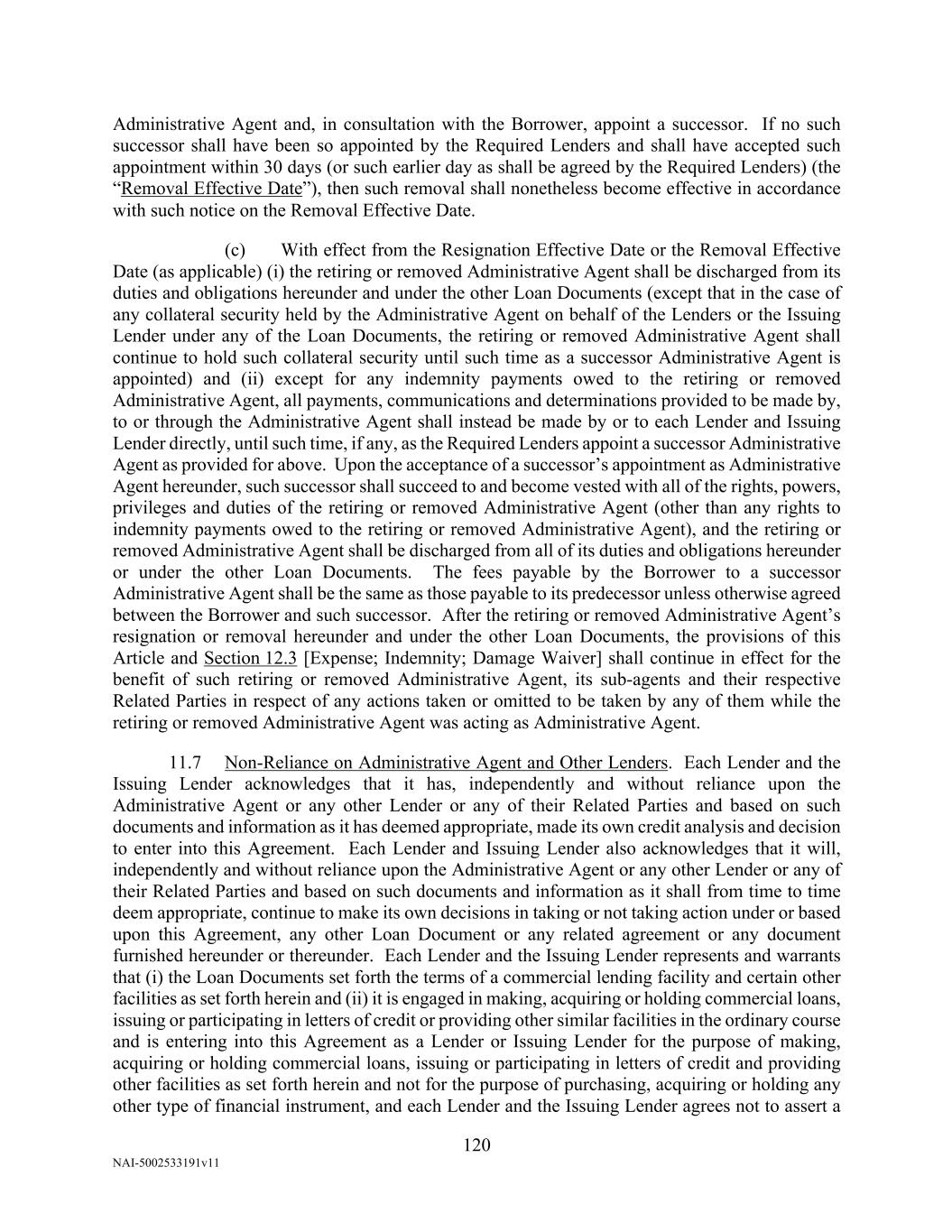 NAI-5002533191v11 120 Administrative Agent and, in consultation with the Borrower, appoint a successor. If no such successor shall have been so appointed by the Required Lenders and shall have accepted such appointment within 30 days (or such earlier day as shall be agreed by the Required Lenders) (the “Removal Effective Date”), then such removal shall nonetheless become effective in accordance with such notice on the Removal Effective Date. (c) With effect from the Resignation Effective Date or the Removal Effective Date (as applicable) (i) the retiring or removed Administrative Agent shall be discharged from its duties and obligations hereunder and under the other Loan Documents (except that in the case of any collateral security held by the Administrative Agent on behalf of the Lenders or the Issuing Lender under any of the Loan Documents, the retiring or removed Administrative Agent shall continue to hold such collateral security until such time as a successor Administrative Agent is appointed) and (ii) except for any indemnity payments owed to the retiring or removed Administrative Agent, all payments, communications and determinations provided to be made by, to or through the Administrative Agent shall instead be made by or to each Lender and Issuing Lender directly, until such time, if any, as the Required Lenders appoint a successor Administrative Agent as provided for above. Upon the acceptance of a successor’s appointment as Administrative Agent hereunder, such successor shall succeed to and become vested with all of the rights, powers, privileges and duties of the retiring or removed Administrative Agent (other than any rights to indemnity payments owed to the retiring or removed Administrative Agent), and the retiring or removed Administrative Agent shall be discharged from all of its duties and obligations hereunder or under the other Loan Documents. The fees payable by the Borrower to a successor Administrative Agent shall be the same as those payable to its predecessor unless otherwise agreed between the Borrower and such successor. After the retiring or removed Administrative Agent’s resignation or removal hereunder and under the other Loan Documents, the provisions of this Article and Section 12.3 [Expense; Indemnity; Damage Waiver] shall continue in effect for the benefit of such retiring or removed Administrative Agent, its sub-agents and their respective Related Parties in respect of any actions taken or omitted to be taken by any of them while the retiring or removed Administrative Agent was acting as Administrative Agent. 11.7 Non-Reliance on Administrative Agent and Other Lenders. Each Lender and the Issuing Lender acknowledges that it has, independently and without reliance upon the Administrative Agent or any other Lender or any of their Related Parties and based on such documents and information as it has deemed appropriate, made its own credit analysis and decision to enter into this Agreement. Each Lender and Issuing Lender also acknowledges that it will, independently and without reliance upon the Administrative Agent or any other Lender or any of their Related Parties and based on such documents and information as it shall from time to time deem appropriate, continue to make its own decisions in taking or not taking action under or based upon this Agreement, any other Loan Document or any related agreement or any document furnished hereunder or thereunder. Each Lender and the Issuing Lender represents and warrants that (i) the Loan Documents set forth the terms of a commercial lending facility and certain other facilities as set forth herein and (ii) it is engaged in making, acquiring or holding commercial loans, issuing or participating in letters of credit or providing other similar facilities in the ordinary course and is entering into this Agreement as a Lender or Issuing Lender for the purpose of making, acquiring or holding commercial loans, issuing or participating in letters of credit and providing other facilities as set forth herein and not for the purpose of purchasing, acquiring or holding any other type of financial instrument, and each Lender and the Issuing Lender agrees not to assert a