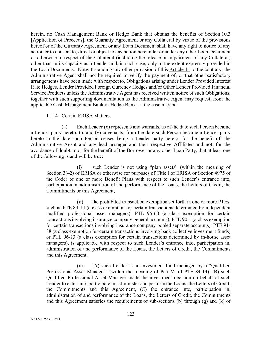 NAI-5002533191v11 123 herein, no Cash Management Bank or Hedge Bank that obtains the benefits of Section 10.3 [Application of Proceeds], the Guaranty Agreement or any Collateral by virtue of the provisions hereof or of the Guaranty Agreement or any Loan Document shall have any right to notice of any action or to consent to, direct or object to any action hereunder or under any other Loan Document or otherwise in respect of the Collateral (including the release or impairment of any Collateral) other than in its capacity as a Lender and, in such case, only to the extent expressly provided in the Loan Documents. Notwithstanding any other provision of this Article 11 to the contrary, the Administrative Agent shall not be required to verify the payment of, or that other satisfactory arrangements have been made with respect to, Obligations arising under Lender Provided Interest Rate Hedges, Lender Provided Foreign Currency Hedges and/or Other Lender Provided Financial Service Products unless the Administrative Agent has received written notice of such Obligations, together with such supporting documentation as the Administrative Agent may request, from the applicable Cash Management Bank or Hedge Bank, as the case may be. 11.14 Certain ERISA Matters. (a) Each Lender (x) represents and warrants, as of the date such Person became a Lender party hereto, to, and (y) covenants, from the date such Person became a Lender party hereto to the date such Person ceases being a Lender party hereto, for the benefit of, the Administrative Agent and any lead arranger and their respective Affiliates and not, for the avoidance of doubt, to or for the benefit of the Borrower or any other Loan Party, that at least one of the following is and will be true: (i) such Lender is not using “plan assets” (within the meaning of Section 3(42) of ERISA or otherwise for purposes of Title I of ERISA or Section 4975 of the Code) of one or more Benefit Plans with respect to such Lender’s entrance into, participation in, administration of and performance of the Loans, the Letters of Credit, the Commitments or this Agreement, (ii) the prohibited transaction exemption set forth in one or more PTEs, such as PTE 84-14 (a class exemption for certain transactions determined by independent qualified professional asset managers), PTE 95-60 (a class exemption for certain transactions involving insurance company general accounts), PTE 90-1 (a class exemption for certain transactions involving insurance company pooled separate accounts), PTE 91- 38 (a class exemption for certain transactions involving bank collective investment funds) or PTE 96-23 (a class exemption for certain transactions determined by in-house asset managers), is applicable with respect to such Lender’s entrance into, participation in, administration of and performance of the Loans, the Letters of Credit, the Commitments and this Agreement, (iii) (A) such Lender is an investment fund managed by a “Qualified Professional Asset Manager” (within the meaning of Part VI of PTE 84-14), (B) such Qualified Professional Asset Manager made the investment decision on behalf of such Lender to enter into, participate in, administer and perform the Loans, the Letters of Credit, the Commitments and this Agreement, (C) the entrance into, participation in, administration of and performance of the Loans, the Letters of Credit, the Commitments and this Agreement satisfies the requirements of sub-sections (b) through (g) and (k) of
