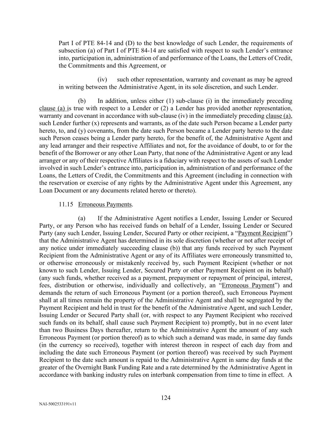 NAI-5002533191v11 124 Part I of PTE 84-14 and (D) to the best knowledge of such Lender, the requirements of subsection (a) of Part I of PTE 84-14 are satisfied with respect to such Lender’s entrance into, participation in, administration of and performance of the Loans, the Letters of Credit, the Commitments and this Agreement, or (iv) such other representation, warranty and covenant as may be agreed in writing between the Administrative Agent, in its sole discretion, and such Lender. (b) In addition, unless either (1) sub-clause (i) in the immediately preceding clause (a) is true with respect to a Lender or (2) a Lender has provided another representation, warranty and covenant in accordance with sub-clause (iv) in the immediately preceding clause (a), such Lender further (x) represents and warrants, as of the date such Person became a Lender party hereto, to, and (y) covenants, from the date such Person became a Lender party hereto to the date such Person ceases being a Lender party hereto, for the benefit of, the Administrative Agent and any lead arranger and their respective Affiliates and not, for the avoidance of doubt, to or for the benefit of the Borrower or any other Loan Party, that none of the Administrative Agent or any lead arranger or any of their respective Affiliates is a fiduciary with respect to the assets of such Lender involved in such Lender’s entrance into, participation in, administration of and performance of the Loans, the Letters of Credit, the Commitments and this Agreement (including in connection with the reservation or exercise of any rights by the Administrative Agent under this Agreement, any Loan Document or any documents related hereto or thereto). 11.15 Erroneous Payments. (a) If the Administrative Agent notifies a Lender, Issuing Lender or Secured Party, or any Person who has received funds on behalf of a Lender, Issuing Lender or Secured Party (any such Lender, Issuing Lender, Secured Party or other recipient, a “Payment Recipient”) that the Administrative Agent has determined in its sole discretion (whether or not after receipt of any notice under immediately succeeding clause (b)) that any funds received by such Payment Recipient from the Administrative Agent or any of its Affiliates were erroneously transmitted to, or otherwise erroneously or mistakenly received by, such Payment Recipient (whether or not known to such Lender, Issuing Lender, Secured Party or other Payment Recipient on its behalf) (any such funds, whether received as a payment, prepayment or repayment of principal, interest, fees, distribution or otherwise, individually and collectively, an “Erroneous Payment”) and demands the return of such Erroneous Payment (or a portion thereof), such Erroneous Payment shall at all times remain the property of the Administrative Agent and shall be segregated by the Payment Recipient and held in trust for the benefit of the Administrative Agent, and such Lender, Issuing Lender or Secured Party shall (or, with respect to any Payment Recipient who received such funds on its behalf, shall cause such Payment Recipient to) promptly, but in no event later than two Business Days thereafter, return to the Administrative Agent the amount of any such Erroneous Payment (or portion thereof) as to which such a demand was made, in same day funds (in the currency so received), together with interest thereon in respect of each day from and including the date such Erroneous Payment (or portion thereof) was received by such Payment Recipient to the date such amount is repaid to the Administrative Agent in same day funds at the greater of the Overnight Bank Funding Rate and a rate determined by the Administrative Agent in accordance with banking industry rules on interbank compensation from time to time in effect. A