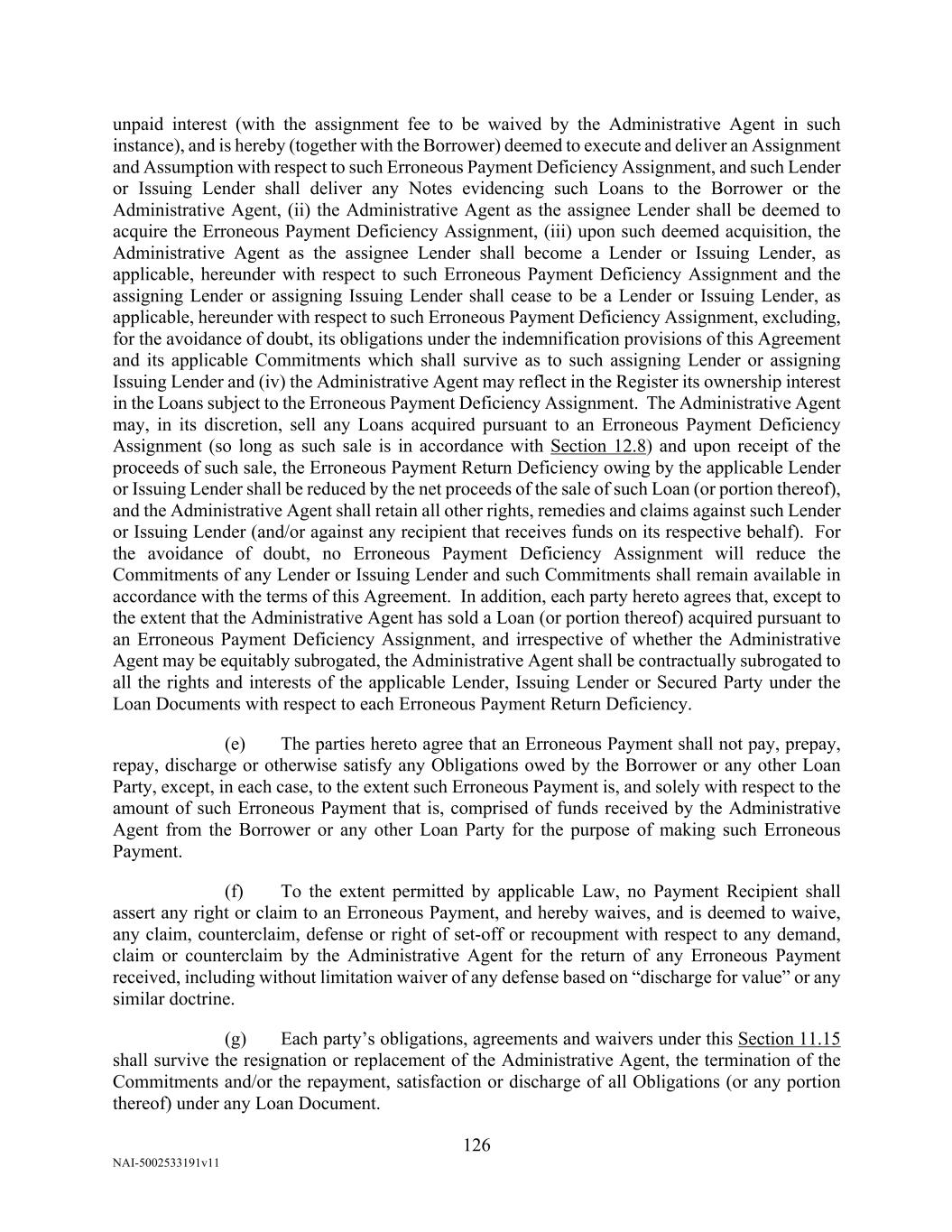 NAI-5002533191v11 126 unpaid interest (with the assignment fee to be waived by the Administrative Agent in such instance), and is hereby (together with the Borrower) deemed to execute and deliver an Assignment and Assumption with respect to such Erroneous Payment Deficiency Assignment, and such Lender or Issuing Lender shall deliver any Notes evidencing such Loans to the Borrower or the Administrative Agent, (ii) the Administrative Agent as the assignee Lender shall be deemed to acquire the Erroneous Payment Deficiency Assignment, (iii) upon such deemed acquisition, the Administrative Agent as the assignee Lender shall become a Lender or Issuing Lender, as applicable, hereunder with respect to such Erroneous Payment Deficiency Assignment and the assigning Lender or assigning Issuing Lender shall cease to be a Lender or Issuing Lender, as applicable, hereunder with respect to such Erroneous Payment Deficiency Assignment, excluding, for the avoidance of doubt, its obligations under the indemnification provisions of this Agreement and its applicable Commitments which shall survive as to such assigning Lender or assigning Issuing Lender and (iv) the Administrative Agent may reflect in the Register its ownership interest in the Loans subject to the Erroneous Payment Deficiency Assignment. The Administrative Agent may, in its discretion, sell any Loans acquired pursuant to an Erroneous Payment Deficiency Assignment (so long as such sale is in accordance with Section 12.8) and upon receipt of the proceeds of such sale, the Erroneous Payment Return Deficiency owing by the applicable Lender or Issuing Lender shall be reduced by the net proceeds of the sale of such Loan (or portion thereof), and the Administrative Agent shall retain all other rights, remedies and claims against such Lender or Issuing Lender (and/or against any recipient that receives funds on its respective behalf). For the avoidance of doubt, no Erroneous Payment Deficiency Assignment will reduce the Commitments of any Lender or Issuing Lender and such Commitments shall remain available in accordance with the terms of this Agreement. In addition, each party hereto agrees that, except to the extent that the Administrative Agent has sold a Loan (or portion thereof) acquired pursuant to an Erroneous Payment Deficiency Assignment, and irrespective of whether the Administrative Agent may be equitably subrogated, the Administrative Agent shall be contractually subrogated to all the rights and interests of the applicable Lender, Issuing Lender or Secured Party under the Loan Documents with respect to each Erroneous Payment Return Deficiency. (e) The parties hereto agree that an Erroneous Payment shall not pay, prepay, repay, discharge or otherwise satisfy any Obligations owed by the Borrower or any other Loan Party, except, in each case, to the extent such Erroneous Payment is, and solely with respect to the amount of such Erroneous Payment that is, comprised of funds received by the Administrative Agent from the Borrower or any other Loan Party for the purpose of making such Erroneous Payment. (f) To the extent permitted by applicable Law, no Payment Recipient shall assert any right or claim to an Erroneous Payment, and hereby waives, and is deemed to waive, any claim, counterclaim, defense or right of set-off or recoupment with respect to any demand, claim or counterclaim by the Administrative Agent for the return of any Erroneous Payment received, including without limitation waiver of any defense based on “discharge for value” or any similar doctrine. (g) Each party’s obligations, agreements and waivers under this Section 11.15 shall survive the resignation or replacement of the Administrative Agent, the termination of the Commitments and/or the repayment, satisfaction or discharge of all Obligations (or any portion thereof) under any Loan Document.