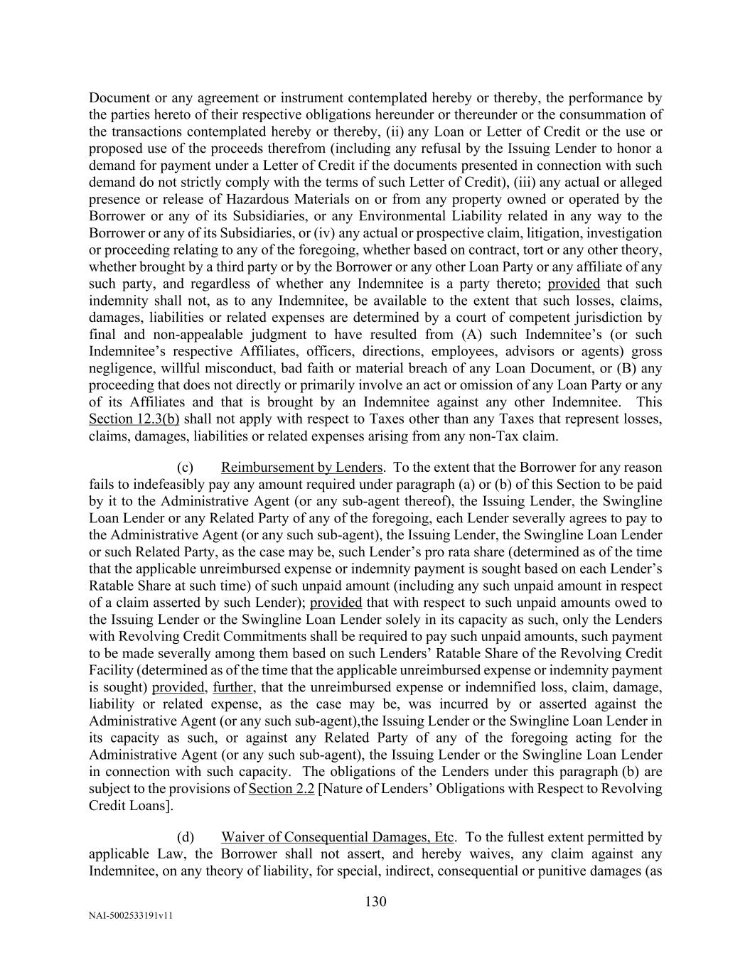 NAI-5002533191v11 130 Document or any agreement or instrument contemplated hereby or thereby, the performance by the parties hereto of their respective obligations hereunder or thereunder or the consummation of the transactions contemplated hereby or thereby, (ii) any Loan or Letter of Credit or the use or proposed use of the proceeds therefrom (including any refusal by the Issuing Lender to honor a demand for payment under a Letter of Credit if the documents presented in connection with such demand do not strictly comply with the terms of such Letter of Credit), (iii) any actual or alleged presence or release of Hazardous Materials on or from any property owned or operated by the Borrower or any of its Subsidiaries, or any Environmental Liability related in any way to the Borrower or any of its Subsidiaries, or (iv) any actual or prospective claim, litigation, investigation or proceeding relating to any of the foregoing, whether based on contract, tort or any other theory, whether brought by a third party or by the Borrower or any other Loan Party or any affiliate of any such party, and regardless of whether any Indemnitee is a party thereto; provided that such indemnity shall not, as to any Indemnitee, be available to the extent that such losses, claims, damages, liabilities or related expenses are determined by a court of competent jurisdiction by final and non-appealable judgment to have resulted from (A) such Indemnitee’s (or such Indemnitee’s respective Affiliates, officers, directions, employees, advisors or agents) gross negligence, willful misconduct, bad faith or material breach of any Loan Document, or (B) any proceeding that does not directly or primarily involve an act or omission of any Loan Party or any of its Affiliates and that is brought by an Indemnitee against any other Indemnitee. This Section 12.3(b) shall not apply with respect to Taxes other than any Taxes that represent losses, claims, damages, liabilities or related expenses arising from any non-Tax claim. (c) Reimbursement by Lenders. To the extent that the Borrower for any reason fails to indefeasibly pay any amount required under paragraph (a) or (b) of this Section to be paid by it to the Administrative Agent (or any sub-agent thereof), the Issuing Lender, the Swingline Loan Lender or any Related Party of any of the foregoing, each Lender severally agrees to pay to the Administrative Agent (or any such sub-agent), the Issuing Lender, the Swingline Loan Lender or such Related Party, as the case may be, such Lender’s pro rata share (determined as of the time that the applicable unreimbursed expense or indemnity payment is sought based on each Lender’s Ratable Share at such time) of such unpaid amount (including any such unpaid amount in respect of a claim asserted by such Lender); provided that with respect to such unpaid amounts owed to the Issuing Lender or the Swingline Loan Lender solely in its capacity as such, only the Lenders with Revolving Credit Commitments shall be required to pay such unpaid amounts, such payment to be made severally among them based on such Lenders’ Ratable Share of the Revolving Credit Facility (determined as of the time that the applicable unreimbursed expense or indemnity payment is sought) provided, further, that the unreimbursed expense or indemnified loss, claim, damage, liability or related expense, as the case may be, was incurred by or asserted against the Administrative Agent (or any such sub-agent),the Issuing Lender or the Swingline Loan Lender in its capacity as such, or against any Related Party of any of the foregoing acting for the Administrative Agent (or any such sub-agent), the Issuing Lender or the Swingline Loan Lender in connection with such capacity. The obligations of the Lenders under this paragraph (b) are subject to the provisions of Section 2.2 [Nature of Lenders’ Obligations with Respect to Revolving Credit Loans]. (d) Waiver of Consequential Damages, Etc. To the fullest extent permitted by applicable Law, the Borrower shall not assert, and hereby waives, any claim against any Indemnitee, on any theory of liability, for special, indirect, consequential or punitive damages (as