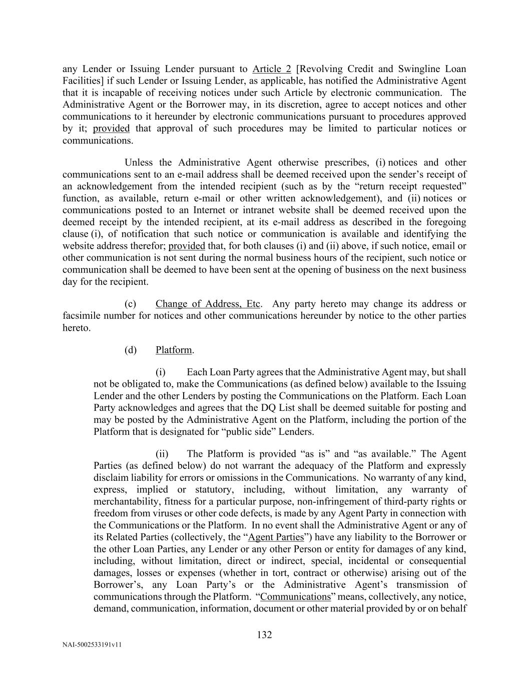 NAI-5002533191v11 132 any Lender or Issuing Lender pursuant to Article 2 [Revolving Credit and Swingline Loan Facilities] if such Lender or Issuing Lender, as applicable, has notified the Administrative Agent that it is incapable of receiving notices under such Article by electronic communication. The Administrative Agent or the Borrower may, in its discretion, agree to accept notices and other communications to it hereunder by electronic communications pursuant to procedures approved by it; provided that approval of such procedures may be limited to particular notices or communications. Unless the Administrative Agent otherwise prescribes, (i) notices and other communications sent to an e-mail address shall be deemed received upon the sender’s receipt of an acknowledgement from the intended recipient (such as by the “return receipt requested” function, as available, return e-mail or other written acknowledgement), and (ii) notices or communications posted to an Internet or intranet website shall be deemed received upon the deemed receipt by the intended recipient, at its e-mail address as described in the foregoing clause (i), of notification that such notice or communication is available and identifying the website address therefor; provided that, for both clauses (i) and (ii) above, if such notice, email or other communication is not sent during the normal business hours of the recipient, such notice or communication shall be deemed to have been sent at the opening of business on the next business day for the recipient. (c) Change of Address, Etc. Any party hereto may change its address or facsimile number for notices and other communications hereunder by notice to the other parties hereto. (d) Platform. (i) Each Loan Party agrees that the Administrative Agent may, but shall not be obligated to, make the Communications (as defined below) available to the Issuing Lender and the other Lenders by posting the Communications on the Platform. Each Loan Party acknowledges and agrees that the DQ List shall be deemed suitable for posting and may be posted by the Administrative Agent on the Platform, including the portion of the Platform that is designated for “public side” Lenders. (ii) The Platform is provided “as is” and “as available.” The Agent Parties (as defined below) do not warrant the adequacy of the Platform and expressly disclaim liability for errors or omissions in the Communications. No warranty of any kind, express, implied or statutory, including, without limitation, any warranty of merchantability, fitness for a particular purpose, non-infringement of third-party rights or freedom from viruses or other code defects, is made by any Agent Party in connection with the Communications or the Platform. In no event shall the Administrative Agent or any of its Related Parties (collectively, the “Agent Parties”) have any liability to the Borrower or the other Loan Parties, any Lender or any other Person or entity for damages of any kind, including, without limitation, direct or indirect, special, incidental or consequential damages, losses or expenses (whether in tort, contract or otherwise) arising out of the Borrower’s, any Loan Party’s or the Administrative Agent’s transmission of communications through the Platform. “Communications” means, collectively, any notice, demand, communication, information, document or other material provided by or on behalf