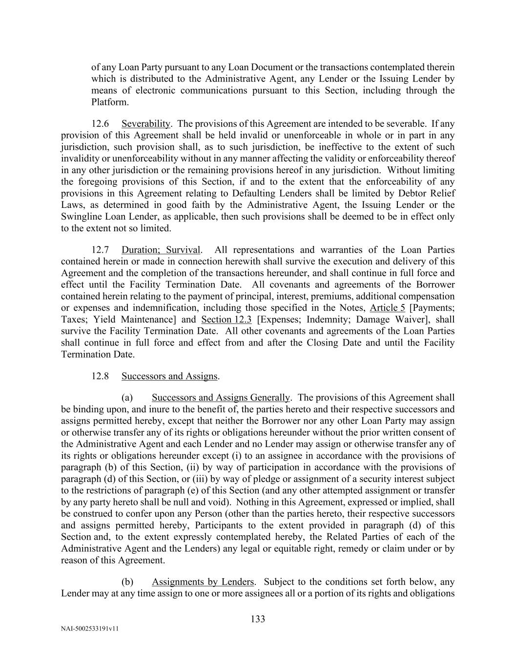 NAI-5002533191v11 133 of any Loan Party pursuant to any Loan Document or the transactions contemplated therein which is distributed to the Administrative Agent, any Lender or the Issuing Lender by means of electronic communications pursuant to this Section, including through the Platform. 12.6 Severability. The provisions of this Agreement are intended to be severable. If any provision of this Agreement shall be held invalid or unenforceable in whole or in part in any jurisdiction, such provision shall, as to such jurisdiction, be ineffective to the extent of such invalidity or unenforceability without in any manner affecting the validity or enforceability thereof in any other jurisdiction or the remaining provisions hereof in any jurisdiction. Without limiting the foregoing provisions of this Section, if and to the extent that the enforceability of any provisions in this Agreement relating to Defaulting Lenders shall be limited by Debtor Relief Laws, as determined in good faith by the Administrative Agent, the Issuing Lender or the Swingline Loan Lender, as applicable, then such provisions shall be deemed to be in effect only to the extent not so limited. 12.7 Duration; Survival. All representations and warranties of the Loan Parties contained herein or made in connection herewith shall survive the execution and delivery of this Agreement and the completion of the transactions hereunder, and shall continue in full force and effect until the Facility Termination Date. All covenants and agreements of the Borrower contained herein relating to the payment of principal, interest, premiums, additional compensation or expenses and indemnification, including those specified in the Notes, Article 5 [Payments; Taxes; Yield Maintenance] and Section 12.3 [Expenses; Indemnity; Damage Waiver], shall survive the Facility Termination Date. All other covenants and agreements of the Loan Parties shall continue in full force and effect from and after the Closing Date and until the Facility Termination Date. 12.8 Successors and Assigns. (a) Successors and Assigns Generally. The provisions of this Agreement shall be binding upon, and inure to the benefit of, the parties hereto and their respective successors and assigns permitted hereby, except that neither the Borrower nor any other Loan Party may assign or otherwise transfer any of its rights or obligations hereunder without the prior written consent of the Administrative Agent and each Lender and no Lender may assign or otherwise transfer any of its rights or obligations hereunder except (i) to an assignee in accordance with the provisions of paragraph (b) of this Section, (ii) by way of participation in accordance with the provisions of paragraph (d) of this Section, or (iii) by way of pledge or assignment of a security interest subject to the restrictions of paragraph (e) of this Section (and any other attempted assignment or transfer by any party hereto shall be null and void). Nothing in this Agreement, expressed or implied, shall be construed to confer upon any Person (other than the parties hereto, their respective successors and assigns permitted hereby, Participants to the extent provided in paragraph (d) of this Section and, to the extent expressly contemplated hereby, the Related Parties of each of the Administrative Agent and the Lenders) any legal or equitable right, remedy or claim under or by reason of this Agreement. (b) Assignments by Lenders. Subject to the conditions set forth below, any Lender may at any time assign to one or more assignees all or a portion of its rights and obligations