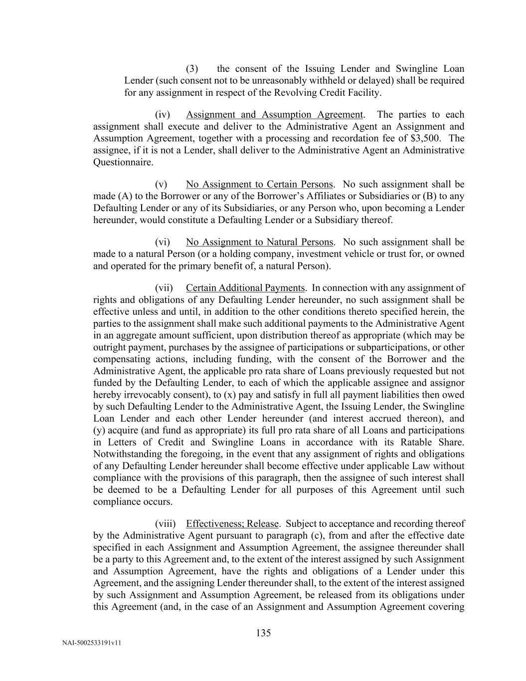 NAI-5002533191v11 135 (3) the consent of the Issuing Lender and Swingline Loan Lender (such consent not to be unreasonably withheld or delayed) shall be required for any assignment in respect of the Revolving Credit Facility. (iv) Assignment and Assumption Agreement. The parties to each assignment shall execute and deliver to the Administrative Agent an Assignment and Assumption Agreement, together with a processing and recordation fee of $3,500. The assignee, if it is not a Lender, shall deliver to the Administrative Agent an Administrative Questionnaire. (v) No Assignment to Certain Persons. No such assignment shall be made (A) to the Borrower or any of the Borrower’s Affiliates or Subsidiaries or (B) to any Defaulting Lender or any of its Subsidiaries, or any Person who, upon becoming a Lender hereunder, would constitute a Defaulting Lender or a Subsidiary thereof. (vi) No Assignment to Natural Persons. No such assignment shall be made to a natural Person (or a holding company, investment vehicle or trust for, or owned and operated for the primary benefit of, a natural Person). (vii) Certain Additional Payments. In connection with any assignment of rights and obligations of any Defaulting Lender hereunder, no such assignment shall be effective unless and until, in addition to the other conditions thereto specified herein, the parties to the assignment shall make such additional payments to the Administrative Agent in an aggregate amount sufficient, upon distribution thereof as appropriate (which may be outright payment, purchases by the assignee of participations or subparticipations, or other compensating actions, including funding, with the consent of the Borrower and the Administrative Agent, the applicable pro rata share of Loans previously requested but not funded by the Defaulting Lender, to each of which the applicable assignee and assignor hereby irrevocably consent), to (x) pay and satisfy in full all payment liabilities then owed by such Defaulting Lender to the Administrative Agent, the Issuing Lender, the Swingline Loan Lender and each other Lender hereunder (and interest accrued thereon), and (y) acquire (and fund as appropriate) its full pro rata share of all Loans and participations in Letters of Credit and Swingline Loans in accordance with its Ratable Share. Notwithstanding the foregoing, in the event that any assignment of rights and obligations of any Defaulting Lender hereunder shall become effective under applicable Law without compliance with the provisions of this paragraph, then the assignee of such interest shall be deemed to be a Defaulting Lender for all purposes of this Agreement until such compliance occurs. (viii) Effectiveness; Release. Subject to acceptance and recording thereof by the Administrative Agent pursuant to paragraph (c), from and after the effective date specified in each Assignment and Assumption Agreement, the assignee thereunder shall be a party to this Agreement and, to the extent of the interest assigned by such Assignment and Assumption Agreement, have the rights and obligations of a Lender under this Agreement, and the assigning Lender thereunder shall, to the extent of the interest assigned by such Assignment and Assumption Agreement, be released from its obligations under this Agreement (and, in the case of an Assignment and Assumption Agreement covering