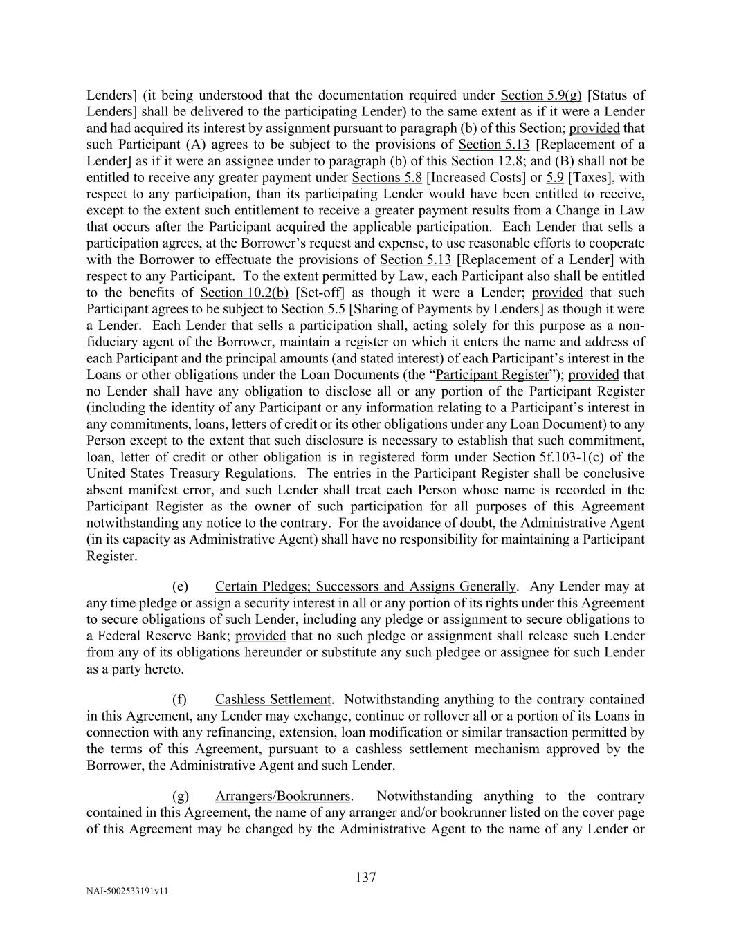 NAI-5002533191v11 137 Lenders] (it being understood that the documentation required under Section 5.9(g) [Status of Lenders] shall be delivered to the participating Lender) to the same extent as if it were a Lender and had acquired its interest by assignment pursuant to paragraph (b) of this Section; provided that such Participant (A) agrees to be subject to the provisions of Section 5.13 [Replacement of a Lender] as if it were an assignee under to paragraph (b) of this Section 12.8; and (B) shall not be entitled to receive any greater payment under Sections 5.8 [Increased Costs] or 5.9 [Taxes], with respect to any participation, than its participating Lender would have been entitled to receive, except to the extent such entitlement to receive a greater payment results from a Change in Law that occurs after the Participant acquired the applicable participation. Each Lender that sells a participation agrees, at the Borrower’s request and expense, to use reasonable efforts to cooperate with the Borrower to effectuate the provisions of Section 5.13 [Replacement of a Lender] with respect to any Participant. To the extent permitted by Law, each Participant also shall be entitled to the benefits of Section 10.2(b) [Set-off] as though it were a Lender; provided that such Participant agrees to be subject to Section 5.5 [Sharing of Payments by Lenders] as though it were a Lender. Each Lender that sells a participation shall, acting solely for this purpose as a non- fiduciary agent of the Borrower, maintain a register on which it enters the name and address of each Participant and the principal amounts (and stated interest) of each Participant’s interest in the Loans or other obligations under the Loan Documents (the “Participant Register”); provided that no Lender shall have any obligation to disclose all or any portion of the Participant Register (including the identity of any Participant or any information relating to a Participant’s interest in any commitments, loans, letters of credit or its other obligations under any Loan Document) to any Person except to the extent that such disclosure is necessary to establish that such commitment, loan, letter of credit or other obligation is in registered form under Section 5f.103-1(c) of the United States Treasury Regulations. The entries in the Participant Register shall be conclusive absent manifest error, and such Lender shall treat each Person whose name is recorded in the Participant Register as the owner of such participation for all purposes of this Agreement notwithstanding any notice to the contrary. For the avoidance of doubt, the Administrative Agent (in its capacity as Administrative Agent) shall have no responsibility for maintaining a Participant Register. (e) Certain Pledges; Successors and Assigns Generally. Any Lender may at any time pledge or assign a security interest in all or any portion of its rights under this Agreement to secure obligations of such Lender, including any pledge or assignment to secure obligations to a Federal Reserve Bank; provided that no such pledge or assignment shall release such Lender from any of its obligations hereunder or substitute any such pledgee or assignee for such Lender as a party hereto. (f) Cashless Settlement. Notwithstanding anything to the contrary contained in this Agreement, any Lender may exchange, continue or rollover all or a portion of its Loans in connection with any refinancing, extension, loan modification or similar transaction permitted by the terms of this Agreement, pursuant to a cashless settlement mechanism approved by the Borrower, the Administrative Agent and such Lender. (g) Arrangers/Bookrunners. Notwithstanding anything to the contrary contained in this Agreement, the name of any arranger and/or bookrunner listed on the cover page of this Agreement may be changed by the Administrative Agent to the name of any Lender or