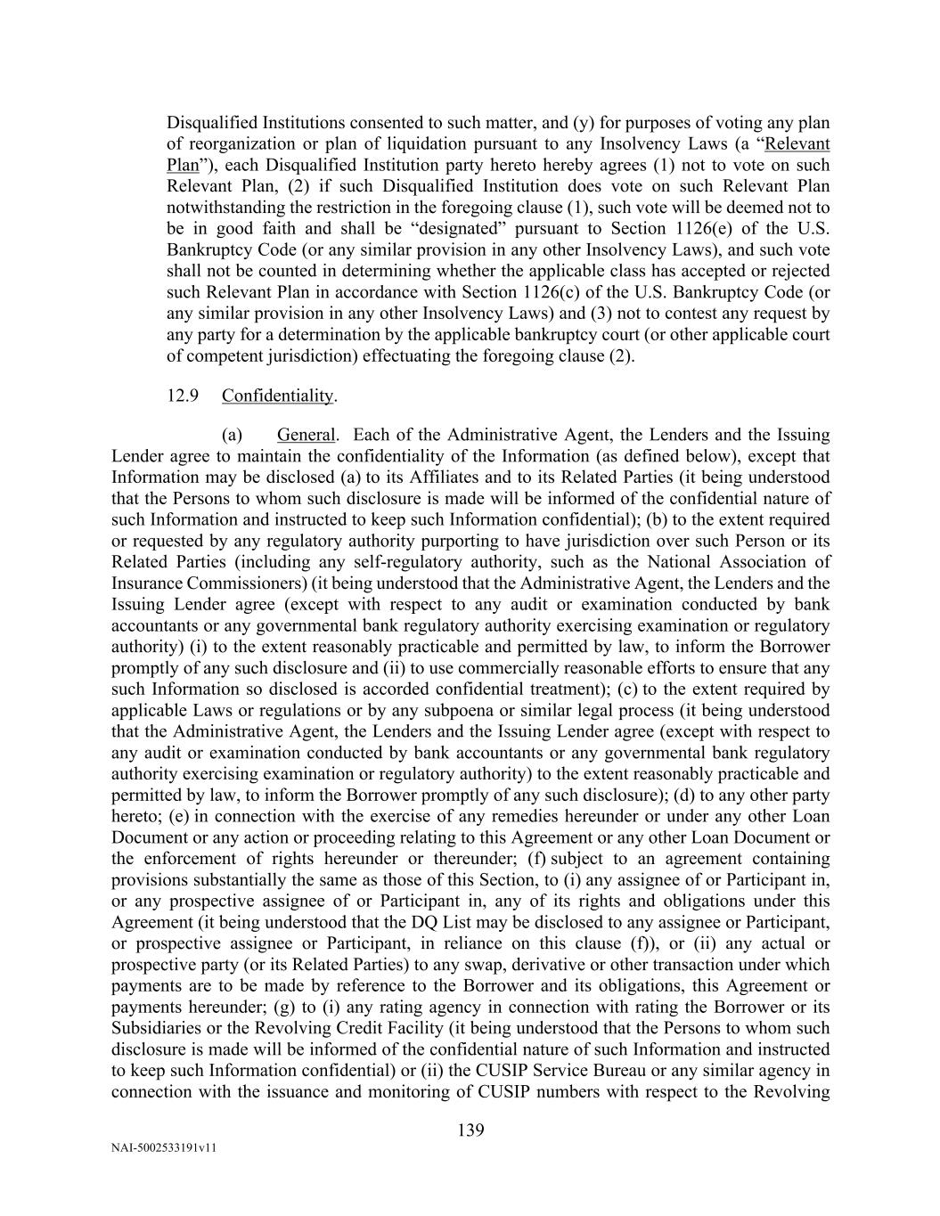 NAI-5002533191v11 139 Disqualified Institutions consented to such matter, and (y) for purposes of voting any plan of reorganization or plan of liquidation pursuant to any Insolvency Laws (a “Relevant Plan”), each Disqualified Institution party hereto hereby agrees (1) not to vote on such Relevant Plan, (2) if such Disqualified Institution does vote on such Relevant Plan notwithstanding the restriction in the foregoing clause (1), such vote will be deemed not to be in good faith and shall be “designated” pursuant to Section 1126(e) of the U.S. Bankruptcy Code (or any similar provision in any other Insolvency Laws), and such vote shall not be counted in determining whether the applicable class has accepted or rejected such Relevant Plan in accordance with Section 1126(c) of the U.S. Bankruptcy Code (or any similar provision in any other Insolvency Laws) and (3) not to contest any request by any party for a determination by the applicable bankruptcy court (or other applicable court of competent jurisdiction) effectuating the foregoing clause (2). 12.9 Confidentiality. (a) General. Each of the Administrative Agent, the Lenders and the Issuing Lender agree to maintain the confidentiality of the Information (as defined below), except that Information may be disclosed (a) to its Affiliates and to its Related Parties (it being understood that the Persons to whom such disclosure is made will be informed of the confidential nature of such Information and instructed to keep such Information confidential); (b) to the extent required or requested by any regulatory authority purporting to have jurisdiction over such Person or its Related Parties (including any self-regulatory authority, such as the National Association of Insurance Commissioners) (it being understood that the Administrative Agent, the Lenders and the Issuing Lender agree (except with respect to any audit or examination conducted by bank accountants or any governmental bank regulatory authority exercising examination or regulatory authority) (i) to the extent reasonably practicable and permitted by law, to inform the Borrower promptly of any such disclosure and (ii) to use commercially reasonable efforts to ensure that any such Information so disclosed is accorded confidential treatment); (c) to the extent required by applicable Laws or regulations or by any subpoena or similar legal process (it being understood that the Administrative Agent, the Lenders and the Issuing Lender agree (except with respect to any audit or examination conducted by bank accountants or any governmental bank regulatory authority exercising examination or regulatory authority) to the extent reasonably practicable and permitted by law, to inform the Borrower promptly of any such disclosure); (d) to any other party hereto; (e) in connection with the exercise of any remedies hereunder or under any other Loan Document or any action or proceeding relating to this Agreement or any other Loan Document or the enforcement of rights hereunder or thereunder; (f) subject to an agreement containing provisions substantially the same as those of this Section, to (i) any assignee of or Participant in, or any prospective assignee of or Participant in, any of its rights and obligations under this Agreement (it being understood that the DQ List may be disclosed to any assignee or Participant, or prospective assignee or Participant, in reliance on this clause (f)), or (ii) any actual or prospective party (or its Related Parties) to any swap, derivative or other transaction under which payments are to be made by reference to the Borrower and its obligations, this Agreement or payments hereunder; (g) to (i) any rating agency in connection with rating the Borrower or its Subsidiaries or the Revolving Credit Facility (it being understood that the Persons to whom such disclosure is made will be informed of the confidential nature of such Information and instructed to keep such Information confidential) or (ii) the CUSIP Service Bureau or any similar agency in connection with the issuance and monitoring of CUSIP numbers with respect to the Revolving