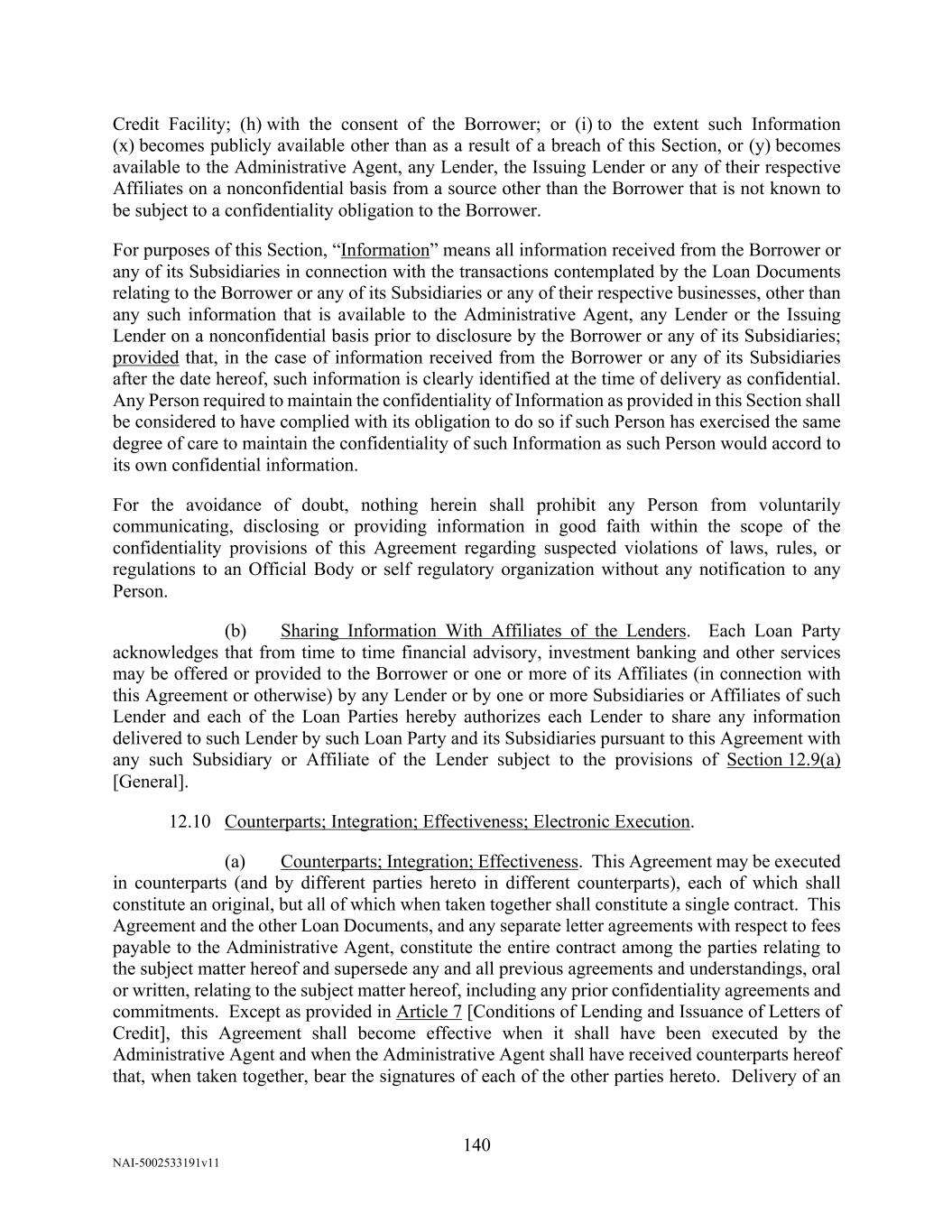 NAI-5002533191v11 140 Credit Facility; (h) with the consent of the Borrower; or (i) to the extent such Information (x) becomes publicly available other than as a result of a breach of this Section, or (y) becomes available to the Administrative Agent, any Lender, the Issuing Lender or any of their respective Affiliates on a nonconfidential basis from a source other than the Borrower that is not known to be subject to a confidentiality obligation to the Borrower. For purposes of this Section, “Information” means all information received from the Borrower or any of its Subsidiaries in connection with the transactions contemplated by the Loan Documents relating to the Borrower or any of its Subsidiaries or any of their respective businesses, other than any such information that is available to the Administrative Agent, any Lender or the Issuing Lender on a nonconfidential basis prior to disclosure by the Borrower or any of its Subsidiaries; provided that, in the case of information received from the Borrower or any of its Subsidiaries after the date hereof, such information is clearly identified at the time of delivery as confidential. Any Person required to maintain the confidentiality of Information as provided in this Section shall be considered to have complied with its obligation to do so if such Person has exercised the same degree of care to maintain the confidentiality of such Information as such Person would accord to its own confidential information. For the avoidance of doubt, nothing herein shall prohibit any Person from voluntarily communicating, disclosing or providing information in good faith within the scope of the confidentiality provisions of this Agreement regarding suspected violations of laws, rules, or regulations to an Official Body or self regulatory organization without any notification to any Person. (b) Sharing Information With Affiliates of the Lenders. Each Loan Party acknowledges that from time to time financial advisory, investment banking and other services may be offered or provided to the Borrower or one or more of its Affiliates (in connection with this Agreement or otherwise) by any Lender or by one or more Subsidiaries or Affiliates of such Lender and each of the Loan Parties hereby authorizes each Lender to share any information delivered to such Lender by such Loan Party and its Subsidiaries pursuant to this Agreement with any such Subsidiary or Affiliate of the Lender subject to the provisions of Section 12.9(a) [General]. 12.10 Counterparts; Integration; Effectiveness; Electronic Execution. (a) Counterparts; Integration; Effectiveness. This Agreement may be executed in counterparts (and by different parties hereto in different counterparts), each of which shall constitute an original, but all of which when taken together shall constitute a single contract. This Agreement and the other Loan Documents, and any separate letter agreements with respect to fees payable to the Administrative Agent, constitute the entire contract among the parties relating to the subject matter hereof and supersede any and all previous agreements and understandings, oral or written, relating to the subject matter hereof, including any prior confidentiality agreements and commitments. Except as provided in Article 7 [Conditions of Lending and Issuance of Letters of Credit], this Agreement shall become effective when it shall have been executed by the Administrative Agent and when the Administrative Agent shall have received counterparts hereof that, when taken together, bear the signatures of each of the other parties hereto. Delivery of an