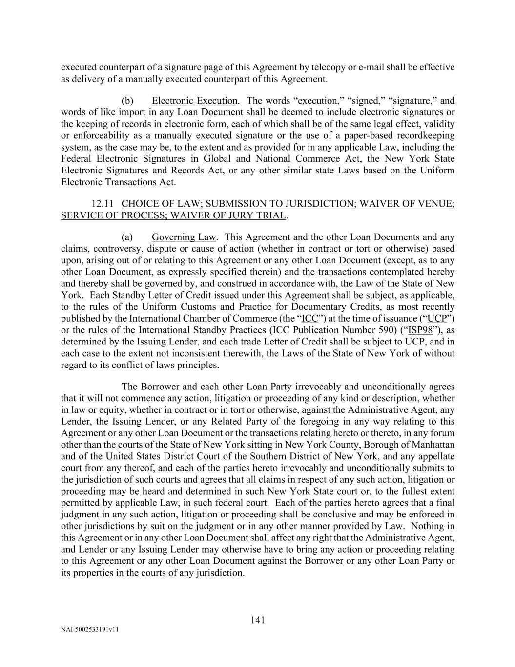 NAI-5002533191v11 141 executed counterpart of a signature page of this Agreement by telecopy or e-mail shall be effective as delivery of a manually executed counterpart of this Agreement. (b) Electronic Execution. The words “execution,” “signed,” “signature,” and words of like import in any Loan Document shall be deemed to include electronic signatures or the keeping of records in electronic form, each of which shall be of the same legal effect, validity or enforceability as a manually executed signature or the use of a paper-based recordkeeping system, as the case may be, to the extent and as provided for in any applicable Law, including the Federal Electronic Signatures in Global and National Commerce Act, the New York State Electronic Signatures and Records Act, or any other similar state Laws based on the Uniform Electronic Transactions Act. 12.11 CHOICE OF LAW; SUBMISSION TO JURISDICTION; WAIVER OF VENUE; SERVICE OF PROCESS; WAIVER OF JURY TRIAL. (a) Governing Law. This Agreement and the other Loan Documents and any claims, controversy, dispute or cause of action (whether in contract or tort or otherwise) based upon, arising out of or relating to this Agreement or any other Loan Document (except, as to any other Loan Document, as expressly specified therein) and the transactions contemplated hereby and thereby shall be governed by, and construed in accordance with, the Law of the State of New York. Each Standby Letter of Credit issued under this Agreement shall be subject, as applicable, to the rules of the Uniform Customs and Practice for Documentary Credits, as most recently published by the International Chamber of Commerce (the “ICC”) at the time of issuance (“UCP”) or the rules of the International Standby Practices (ICC Publication Number 590) (“ISP98”), as determined by the Issuing Lender, and each trade Letter of Credit shall be subject to UCP, and in each case to the extent not inconsistent therewith, the Laws of the State of New York of without regard to its conflict of laws principles. The Borrower and each other Loan Party irrevocably and unconditionally agrees that it will not commence any action, litigation or proceeding of any kind or description, whether in law or equity, whether in contract or in tort or otherwise, against the Administrative Agent, any Lender, the Issuing Lender, or any Related Party of the foregoing in any way relating to this Agreement or any other Loan Document or the transactions relating hereto or thereto, in any forum other than the courts of the State of New York sitting in New York County, Borough of Manhattan and of the United States District Court of the Southern District of New York, and any appellate court from any thereof, and each of the parties hereto irrevocably and unconditionally submits to the jurisdiction of such courts and agrees that all claims in respect of any such action, litigation or proceeding may be heard and determined in such New York State court or, to the fullest extent permitted by applicable Law, in such federal court. Each of the parties hereto agrees that a final judgment in any such action, litigation or proceeding shall be conclusive and may be enforced in other jurisdictions by suit on the judgment or in any other manner provided by Law. Nothing in this Agreement or in any other Loan Document shall affect any right that the Administrative Agent, and Lender or any Issuing Lender may otherwise have to bring any action or proceeding relating to this Agreement or any other Loan Document against the Borrower or any other Loan Party or its properties in the courts of any jurisdiction.