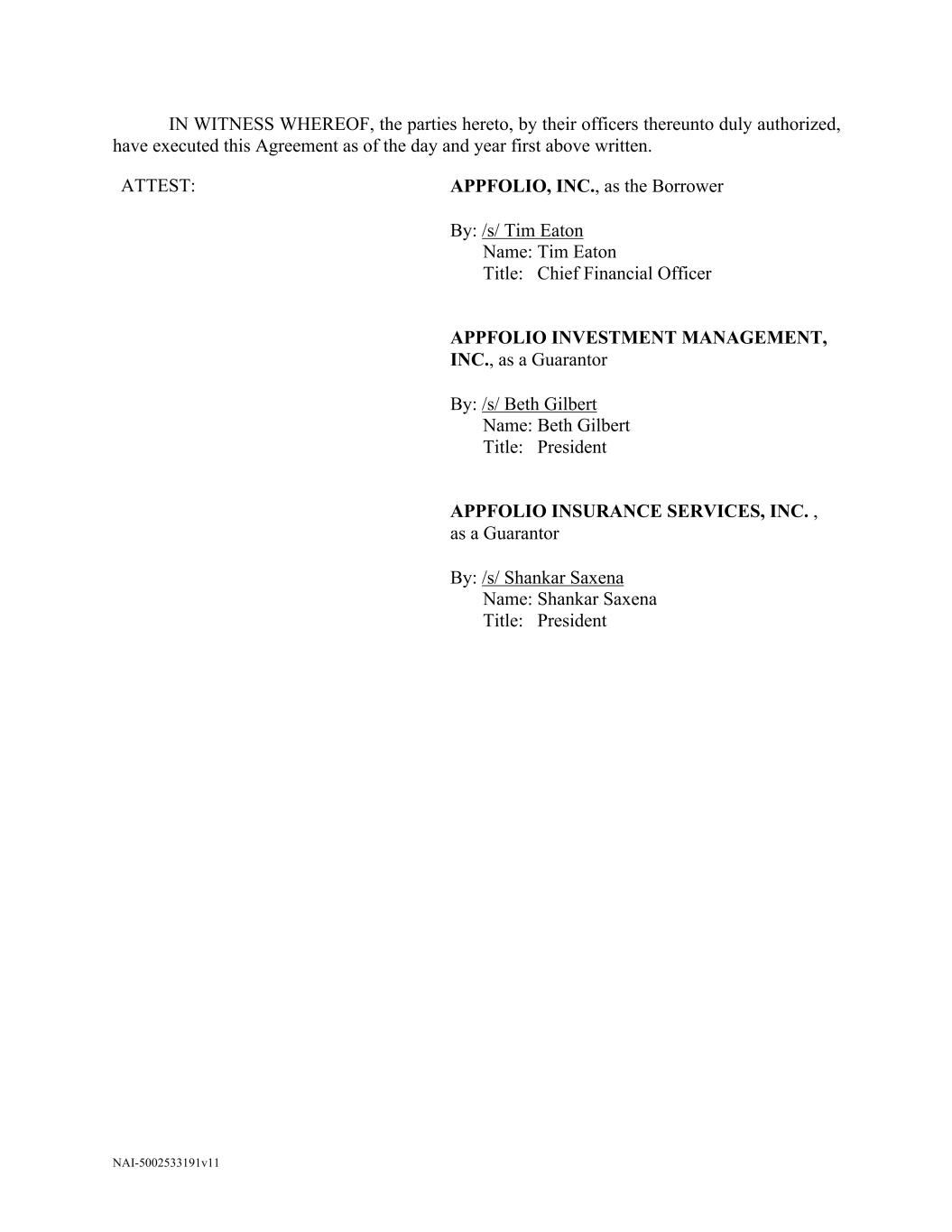 NAI-5002533191v11 IN WITNESS WHEREOF, the parties hereto, by their officers thereunto duly authorized, have executed this Agreement as of the day and year first above written. ATTEST: APPFOLIO, INC., as the Borrower By: /s/ Tim Eaton Name: Tim Eaton Title: Chief Financial Officer APPFOLIO INVESTMENT MANAGEMENT, INC., as a Guarantor By: /s/ Beth Gilbert Name: Beth Gilbert Title: President APPFOLIO INSURANCE SERVICES, INC. , as a Guarantor By: /s/ Shankar Saxena Name: Shankar Saxena Title: President