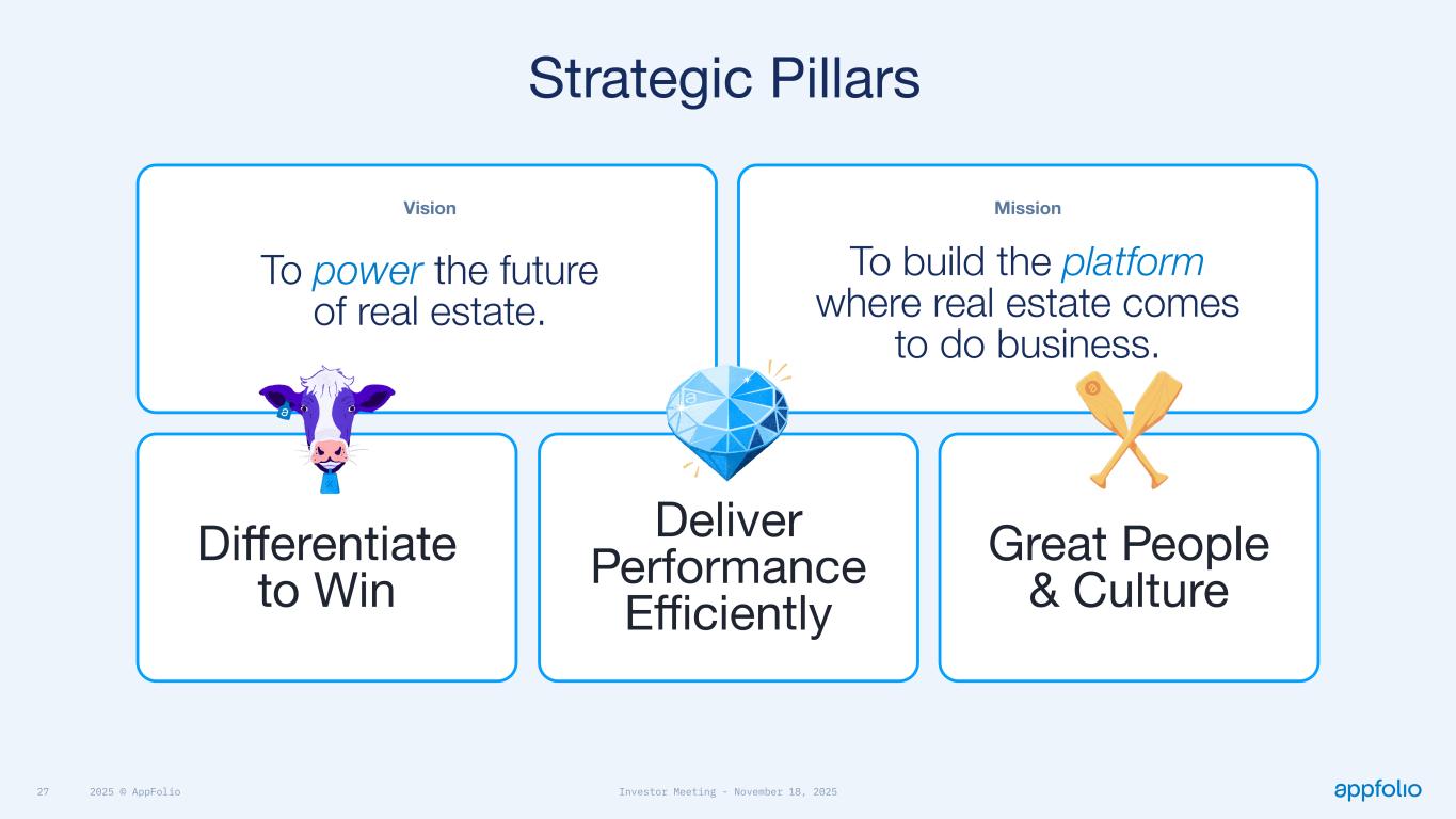 27 2025 © AppFolio Investor Meeting - November 18, 2025 Differentiate to Win Great People & Culture Deliver Performance Efficiently Strategic Pillars To power the future of real estate. Vision To build the platform where real estate comes to do business. Mission