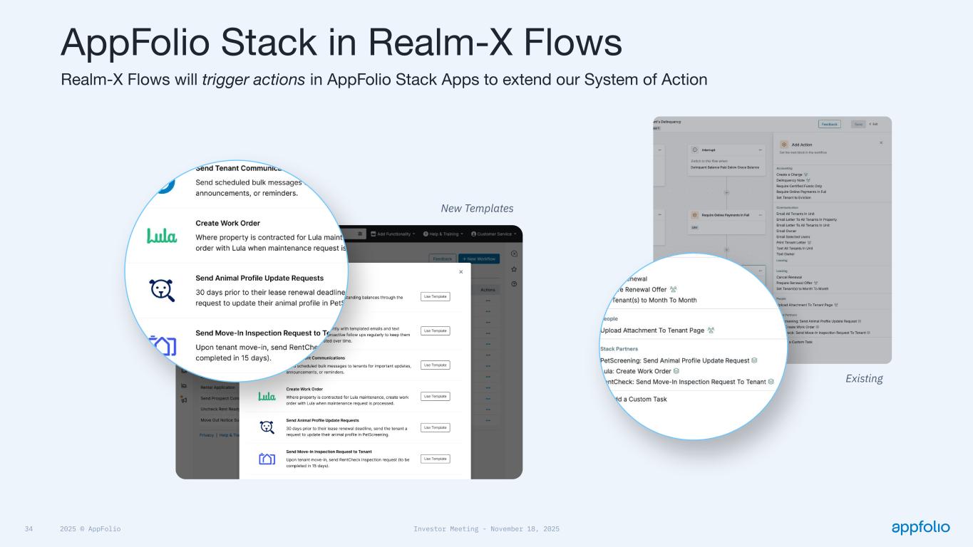 33 2025 © AppFolio Investor Meeting - November 18, 2025 4M+ Units Connected 84 Partners 8 Product Categories Investor Resident Broker Vendor Property Manager Data & Security System of Growth System of Record System of Action AppFolio Stack™ & APIs AppFolio Realm™ Platform | AI-Native Architecture | Performance