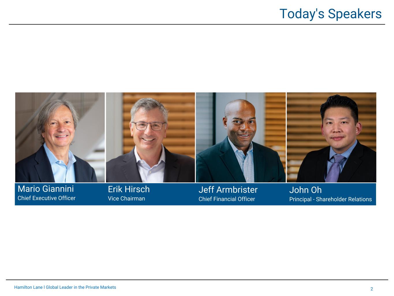 2Hamilton Lane l Global Leader in the Private Markets Today's Speakers Erik Hirsch Vice Chairman Jeff Armbrister Chief Financial Officer John Oh Principal - Shareholder Relations Mario Giannini Chief Executive Officer