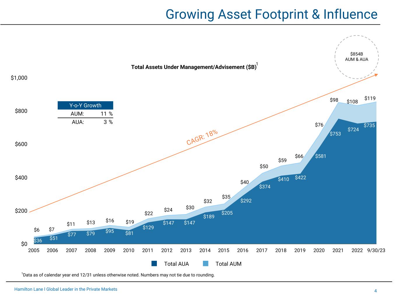 3Hamilton Lane l Global Leader in the Private Markets Period Highlights Business Performance Financial Results Dividend • Assets under management and fee-earning assets under management were $119 billion and $61 billion, respectively, as of September 30, 2023, increases of 11% and 17%, respectively, compared to September 30, 2022 • Management and advisory fees increased 20% compared to the six months ended September 30, 2022 USD in millions except per share amounts Q2 FY24 QTD Q2 FY24 YTD vs. Q2 FY23 YTD Management and advisory fees $109.2 $214.6 20 % GAAP net income $42.0 $73.0 7 % GAAP EPS $1.11 $1.92 2 % Adjusted net income1 $47.8 $98.6 (6) % Non-GAAP EPS1 $0.89 $1.83 (6) % Fee Related Earnings1 $46.9 $92.0 20 % Adjusted EBITDA1 $62.3 $123.2 (13) % • Declared a quarterly dividend of $0.445 per share of Class A common stock to record holders at the close of business on December 15, 2023 1Adjusted net income, non-GAAP earnings per share, Fee Related Earnings and Adjusted EBITDA are non-GAAP financial measures. For the reconciliations of our non-GAAP financial measures to the most directly comparable GAAP financial measures and for the reasons we believe the non-GAAP measures provide useful information, see pages 20 and 21 of this presentation.