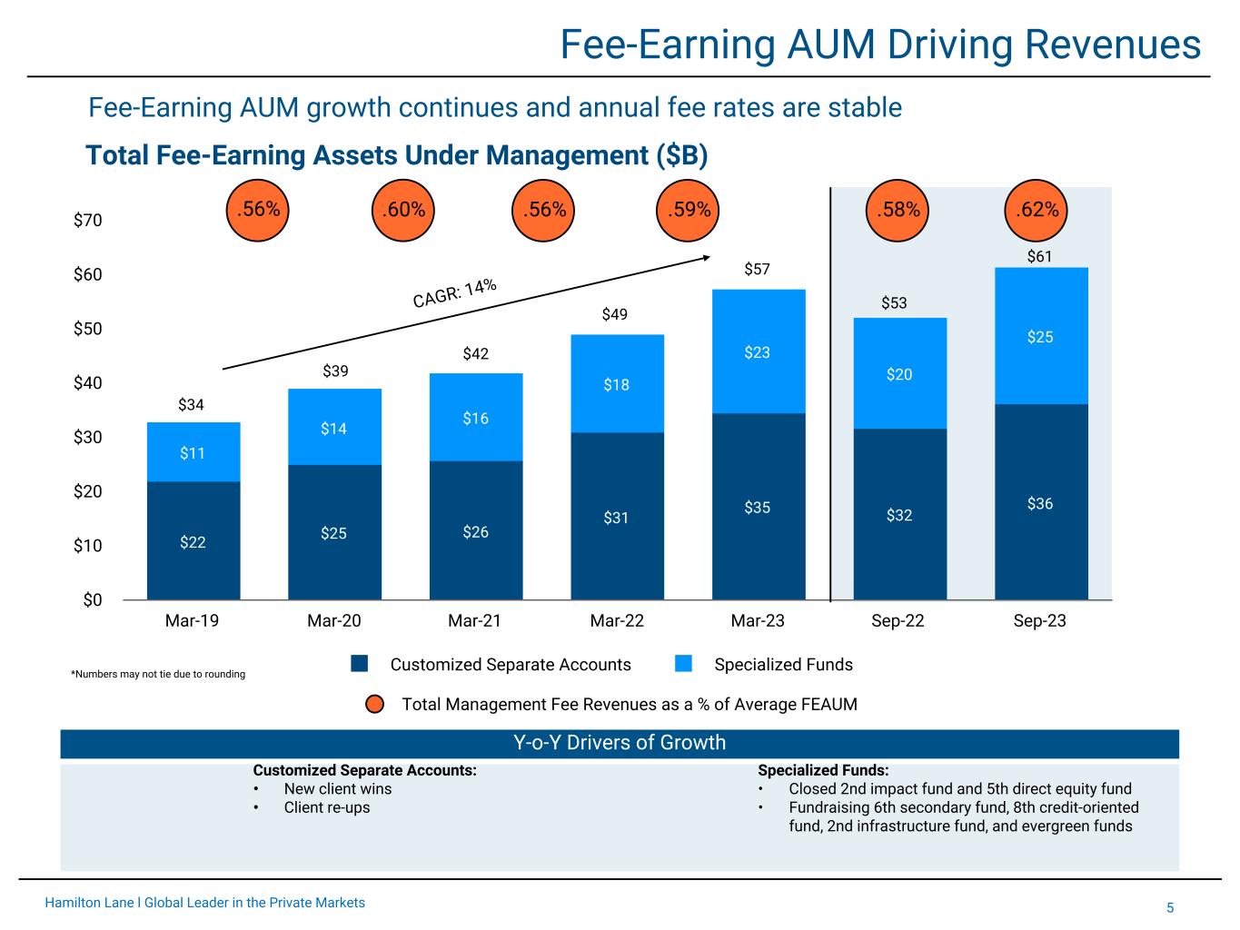 4Hamilton Lane l Global Leader in the Private Markets Total Assets Under Management/Advisement ($B) Total AUA Total AUM 2005 2006 2007 2008 2009 2010 2011 2012 2013 2014 2015 2016 2017 2018 2019 2020 2021 2022 9/30/23 $0 $200 $400 $600 $800 $1,000 Y-o-Y Growth AUM: 11 % AUA: 3 % $854B AUM & AUA Growing Asset Footprint & Influence 1 CAGR: 18% 1Data as of calendar year end 12/31 unless otherwise noted. Numbers may not tie due to rounding. $6 $7 $11 $13 $16 $19 $22 $24 $30 $32 $35 $40 $50 $59 $66 $76 $98 $108 $36 $51 $77 $79 $95 $81 $129 $147 $147 $189 $205 $292 $374 $410 $422 $581 $753 $724 $735 $119
