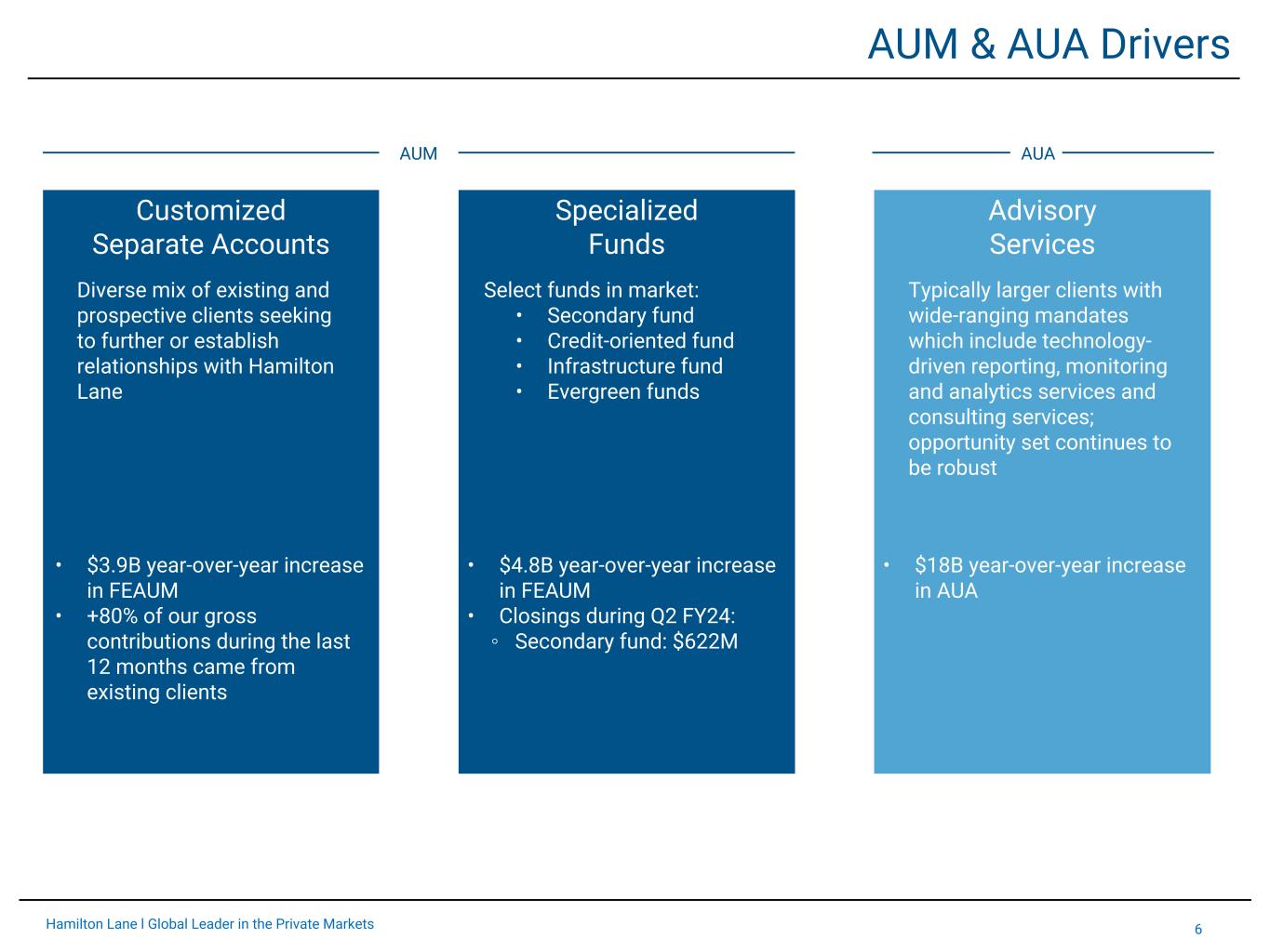 5Hamilton Lane l Global Leader in the Private Markets Total Fee-Earning Assets Under Management ($B) $22 $25 $26 $31 $35 $32 $36 $11 $14 $16 $18 $23 $20 $25 Customized Separate Accounts Specialized Funds Mar-19 Mar-20 Mar-21 Mar-22 Mar-23 Sep-22 Sep-23 $0 $10 $20 $30 $40 $50 $60 $70 Fee-Earning AUM growth continues and annual fee rates are stable CAGR: 14% Total Management Fee Revenues as a % of Average FEAUM Fee-Earning AUM Driving Revenues *Numbers may not tie due to rounding Y-o-Y Drivers of Growth Customized Separate Accounts: • New client wins • Client re-ups Specialized Funds: • Closed 2nd impact fund and 5th direct equity fund • Fundraising 6th secondary fund, 8th credit-oriented fund, 2nd infrastructure fund, and evergreen funds .62%.56% .60% .56% .58% $42 $53 $57 $34 $39 $49 $61 .59%