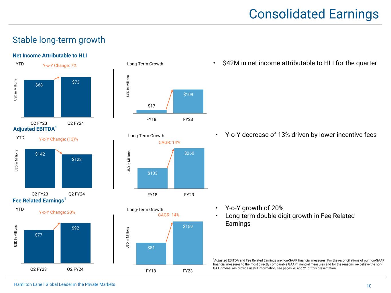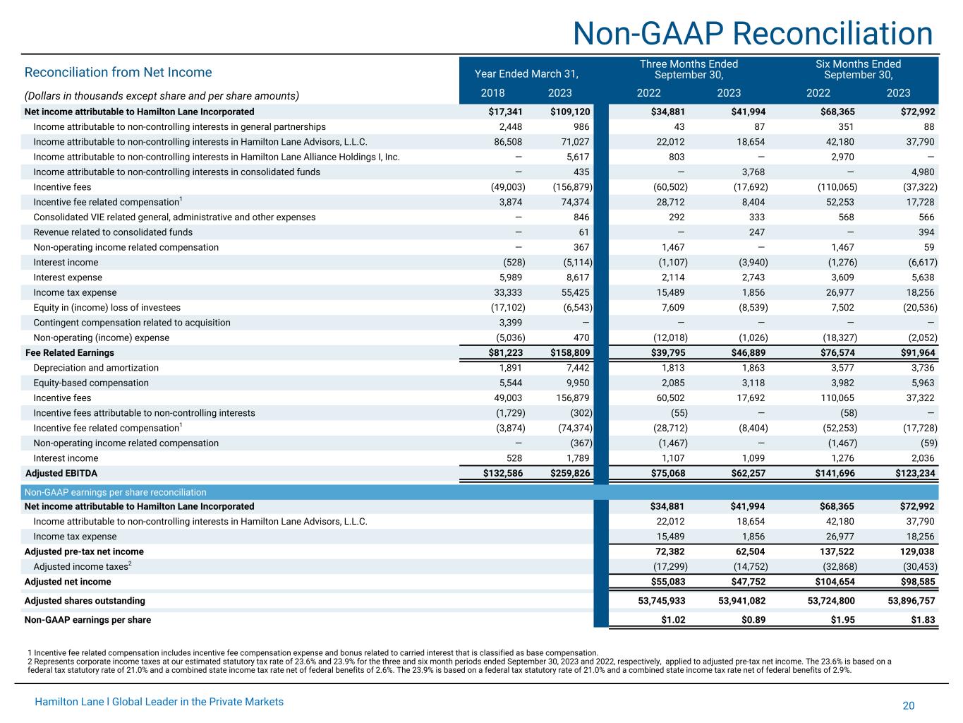 20Hamilton Lane l Global Leader in the Private Markets Non-GAAP Reconciliation Reconciliation from Net Income Year Ended March 31, Three Months Ended September 30, Six Months Ended September 30, (Dollars in thousands except share and per share amounts) 2018 2023 2022 2023 2022 2023 Net income attributable to Hamilton Lane Incorporated $17,341 $109,120 $34,881 $41,994 $68,365 $72,992 Income attributable to non-controlling interests in general partnerships 2,448 986 43 87 351 88 Income attributable to non-controlling interests in Hamilton Lane Advisors, L.L.C. 86,508 71,027 22,012 18,654 42,180 37,790 Income attributable to non-controlling interests in Hamilton Lane Alliance Holdings I, Inc. — 5,617 803 — 2,970 — Income attributable to non-controlling interests in consolidated funds — 435 — 3,768 — 4,980 Incentive fees (49,003) (156,879) (60,502) (17,692) (110,065) (37,322) Incentive fee related compensation1 3,874 74,374 28,712 8,404 52,253 17,728 Consolidated VIE related general, administrative and other expenses — 846 292 333 568 566 Revenue related to consolidated funds — 61 — 247 — 394 Non-operating income related compensation — 367 1,467 — 1,467 59 Interest income (528) (5,114) (1,107) (3,940) (1,276) (6,617) Interest expense 5,989 8,617 2,114 2,743 3,609 5,638 Income tax expense 33,333 55,425 15,489 1,856 26,977 18,256 Equity in (income) loss of investees (17,102) (6,543) 7,609 (8,539) 7,502 (20,536) Contingent compensation related to acquisition 3,399 — — — — — Non-operating (income) expense (5,036) 470 (12,018) (1,026) (18,327) (2,052) Fee Related Earnings $81,223 $158,809 $39,795 $46,889 $76,574 $91,964 Depreciation and amortization 1,891 7,442 1,813 1,863 3,577 3,736 Equity-based compensation 5,544 9,950 2,085 3,118 3,982 5,963 Incentive fees 49,003 156,879 60,502 17,692 110,065 37,322 Incentive fees attributable to non-controlling interests (1,729) (302) (55) — (58) — Incentive fee related compensation1 (3,874) (74,374) (28,712) (8,404) (52,253) (17,728) Non-operating income related compensation — (367) (1,467) — (1,467) (59) Interest income 528 1,789 1,107 1,099 1,276 2,036 Adjusted EBITDA $132,586 $259,826 $75,068 $62,257 $141,696 $123,234 Non-GAAP earnings per share reconciliation Net income attributable to Hamilton Lane Incorporated $34,881 $41,994 $68,365 $72,992 Income attributable to non-controlling interests in Hamilton Lane Advisors, L.L.C. 22,012 18,654 42,180 37,790 Income tax expense 15,489 1,856 26,977 18,256 Adjusted pre-tax net income 72,382 62,504 137,522 129,038 Adjusted income taxes2 (17,299) (14,752) (32,868) (30,453) Adjusted net income $55,083 $47,752 $104,654 $98,585 Adjusted shares outstanding 53,745,933 53,941,082 53,724,800 53,896,757 Non-GAAP earnings per share $1.02 $0.89 $1.95 $1.83 1 Incentive fee related compensation includes incentive fee compensation expense and bonus related to carried interest that is classified as base compensation. 2 Represents corporate income taxes at our estimated statutory tax rate of 23.6% and 23.9% for the three and six month periods ended September 30, 2023 and 2022, respectively, applied to adjusted pre-tax net income. The 23.6% is based on a federal tax statutory rate of 21.0% and a combined state income tax rate net of federal benefits of 2.6%. The 23.9% is based on a federal tax statutory rate of 21.0% and a combined state income tax rate net of federal benefits of 2.9%.