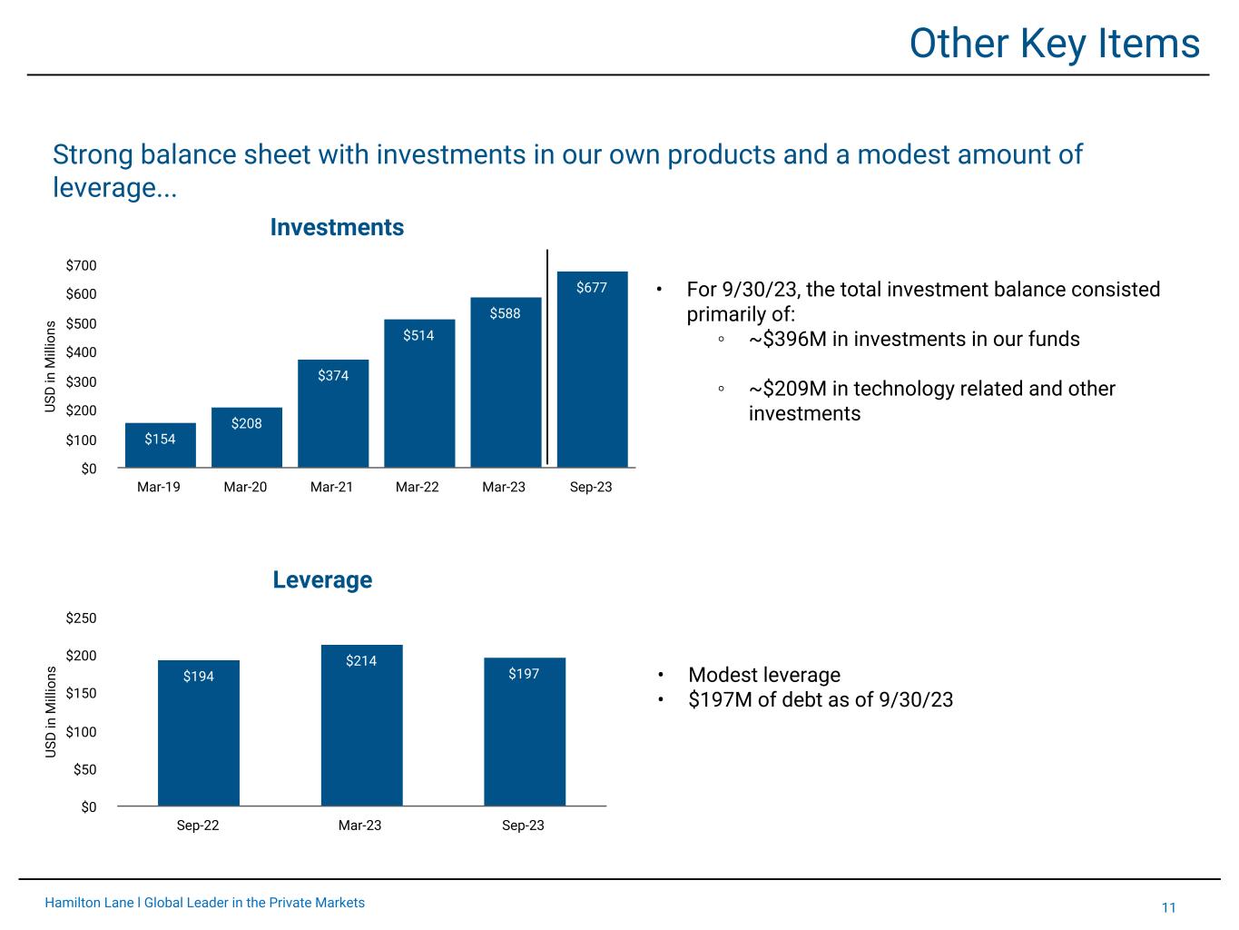10Hamilton Lane l Global Leader in the Private Markets US D in M ill io ns $142 $123 Q2 FY23 Q2 FY24 US D in M ill io ns $77 $92 Q2 FY23 Q2 FY24 Net Income Attributable to HLI US D in M ill io ns $68 $73 Q2 FY23 Q2 FY24 Adjusted EBITDA1 Consolidated Earnings Stable long-term growth YTD Y-o-Y Change: 7% • Y-o-Y decrease of 13% driven by lower incentive fees • Y-o-Y growth of 20% • Long-term double digit growth in Fee Related Earnings • $42M in net income attributable to HLI for the quarter 1Adjusted EBITDA and Fee Related Earnings are non-GAAP financial measures. For the reconciliations of our non-GAAP financial measures to the most directly comparable GAAP financial measures and for the reasons we believe the non- GAAP measures provide useful information, see pages 20 and 21 of this presentation. YTD Y-o-Y Change: (13)% Fee Related Earnings1 YTD Y-o-Y Change: 20% US D in M ill io ns $17 $109 FY18 FY23 Long-Term Growth US D in M ill io ns $133 $260 FY18 FY23 Long-Term Growth US D in M ill io ns $81 $159 FY18 FY23 Long-Term Growth CAGR: 14% CAGR: 14%