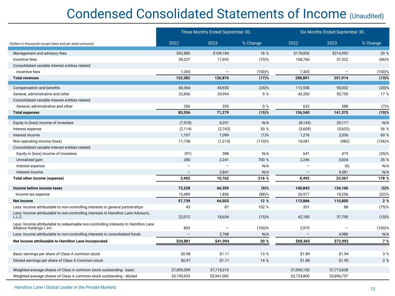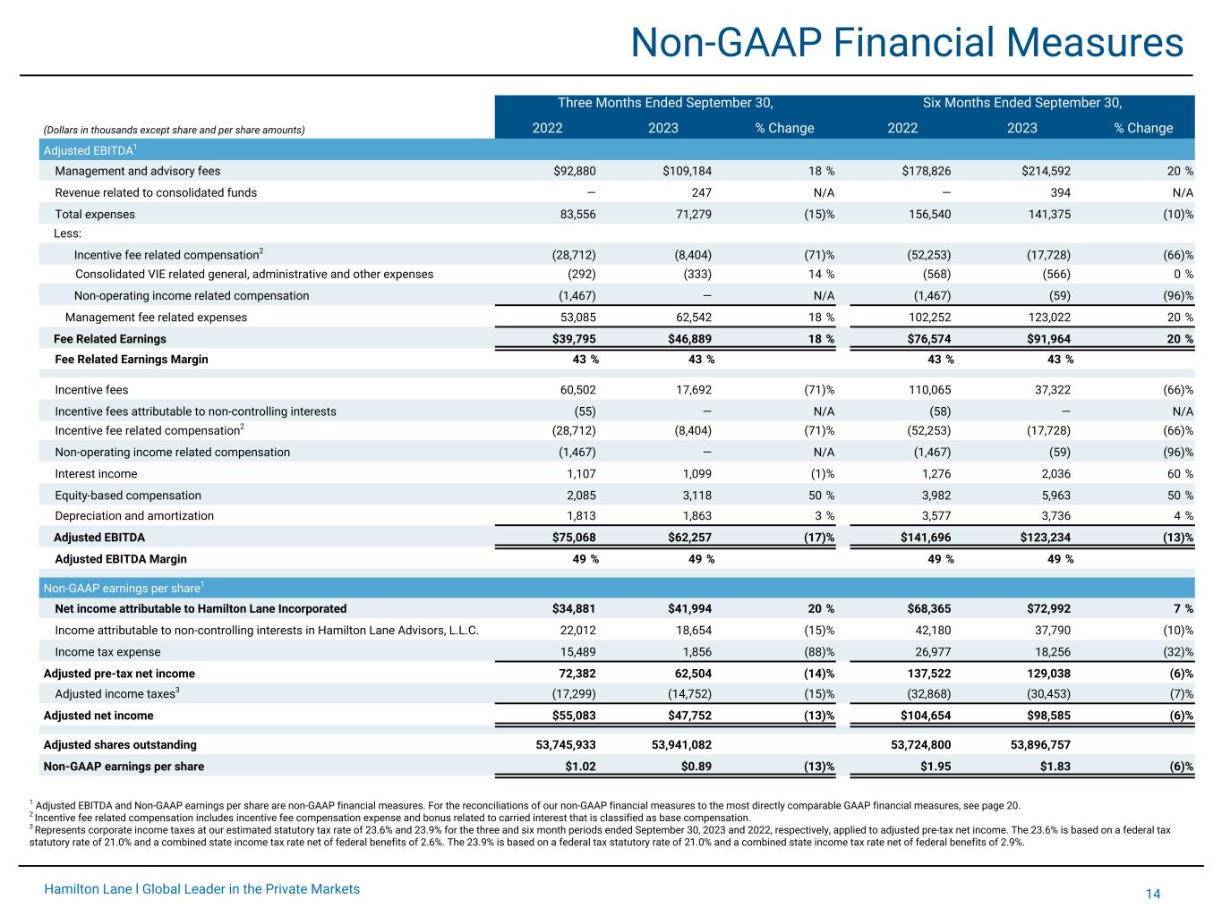 13Hamilton Lane l Global Leader in the Private Markets Condensed Consolidated Statements of Income (Unaudited) Three Months Ended September 30, Six Months Ended September 30, (Dollars in thousands except share and per share amounts) 2022 2023 % Change 2022 2023 % Change Management and advisory fees $92,880 $109,184 18 % $178,826 $214,592 20 % Incentive fees 59,237 17,692 (70) % 108,760 37,322 (66) % Consolidated variable interest entities related: Incentive fees 1,265 — (100) % 1,305 — (100) % Total revenues 153,382 126,876 (17) % 288,891 251,914 (13) % Compensation and benefits 60,364 45,930 (24) % 112,558 90,032 (20) % General, administrative and other 22,836 24,994 9 % 43,350 50,755 17 % Consolidated variable interest entities related: General, administrative and other 356 355 0 % 632 588 (7) % Total expenses 83,556 71,279 (15) % 156,540 141,375 (10) % Equity in (loss) income of investees (7,518) 8,251 N/A (8,143) 20,117 N/A Interest expense (2,114) (2,743) 30 % (3,609) (5,632) 56 % Interest income 1,107 1,099 (1) % 1,276 2,036 60 % Non-operating income (loss) 11,738 (1,215) (110) % 16,081 (982) (106) % Consolidated variable interest entities related: Equity in (loss) income of investees (91) 288 N/A 641 419 (35) % Unrealized gain 280 2,241 700 % 2,246 3,034 35 % Interest expense — — N/A — (6) N/A Interest income — 2,841 N/A — 4,581 N/A Total other income (expense) 3,402 10,762 216 % 8,492 23,567 178 % Income before income taxes 73,228 66,359 (9) % 140,843 134,106 (5) % Income tax expense 15,489 1,856 (88) % 26,977 18,256 (32) % Net income 57,739 64,503 12 % 113,866 115,850 2 % Less: Income attributable to non-controlling interests in general partnerships 43 87 102 % 351 88 (75) % Less: Income attributable to non-controlling interests in Hamilton Lane Advisors, L.L.C. 22,012 18,654 (15) % 42,180 37,790 (10) % Less: Income attributable to redeemable non-controlling interests in Hamilton Lane Alliance Holdings I, Inc. 803 — (100) % 2,970 — (100) % Less: Income attributable to non-controlling interests in consolidated funds — 3,768 N/A — 4,980 N/A Net income attributable to Hamilton Lane Incorporated $34,881 $41,994 20 % $68,365 $72,992 7 % Basic earnings per share of Class A common stock $0.98 $1.11 13 % $1.89 $1.94 3 % Diluted earnings per share of Class A Common stock $0.97 $1.11 14 % $1.88 $1.92 2 % Weighted-average shares of Class A common stock outstanding - basic 37,009,309 37,718,210 37,000,150 37,713,038 Weighted-average shares of Class A common stock outstanding - diluted 53,745,933 53,941,082 53,724,800 53,896,757