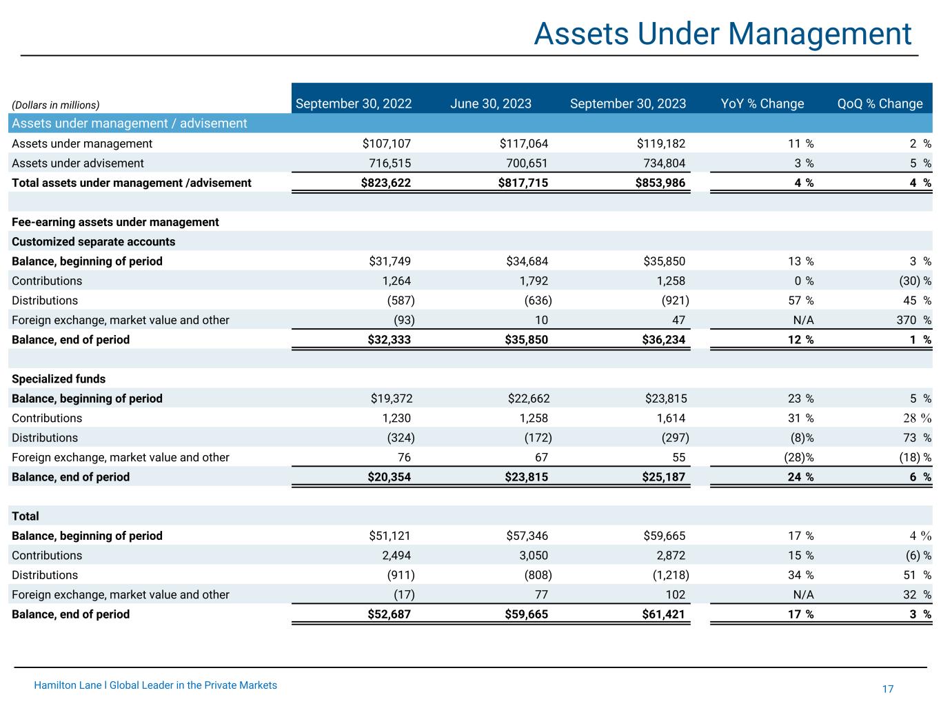 16Hamilton Lane l Global Leader in the Private Markets Incentive Fees Three Months Ended September 30, Six Months Ended September 30, (Dollars in thousands) 2022 2023 % Change 2022 2023 % Change Incentive fees Direct equity funds $27,609 $1,113 (96) % $52,460 $3,444 (93) % Secondary funds 14,988 3,969 (74) % 26,947 12,046 (55) % Direct credit funds 5,507 (42) (101) % 7,633 4,725 (38) % Evergreen funds 42 1,790 4,162 % 997 3,005 201 % Other specialized funds 5,048 7,446 48 % 7,405 9,442 28 % Customized separate accounts 7,308 3,416 (53) % 14,623 4,660 (68) % Incentive fees $60,502 $17,692 (71) % $110,065 $37,322 (66) % As of September 30, 2022 June 30, 2023 September 30, 2023 YoY % Change QoQ % Change Allocated carried interest Secondary Fund II $369 $320 $199 (46) % (38) % Secondary Fund III 32,591 29,212 28,369 (13) % (3) % Secondary Fund IV 126,602 122,416 121,113 (4) % (1) % Secondary Fund V 144,199 145,126 153,399 6 % 6 % Secondary Fund VI — 13,439 14,855 N/A 11 % Co-investment Fund II 18,871 16,363 16,679 (12) % 2 % Co-investment Fund III 59,703 50,810 49,930 (16) % (2) % Co-investment Fund IV 104,421 127,496 131,502 26 % 3 % Equity Opportunities Fund V 6,358 20,624 28,270 345 % 37 % Evergreen funds 56,671 115,135 128,946 128 % 12 % Other specialized funds 111,772 116,776 117,390 5 % 1 % Customized separate accounts 322,973 342,874 360,099 11 % 5 % Total allocated carried interest $984,530 $1,100,591 $1,150,751 17 % 5 %