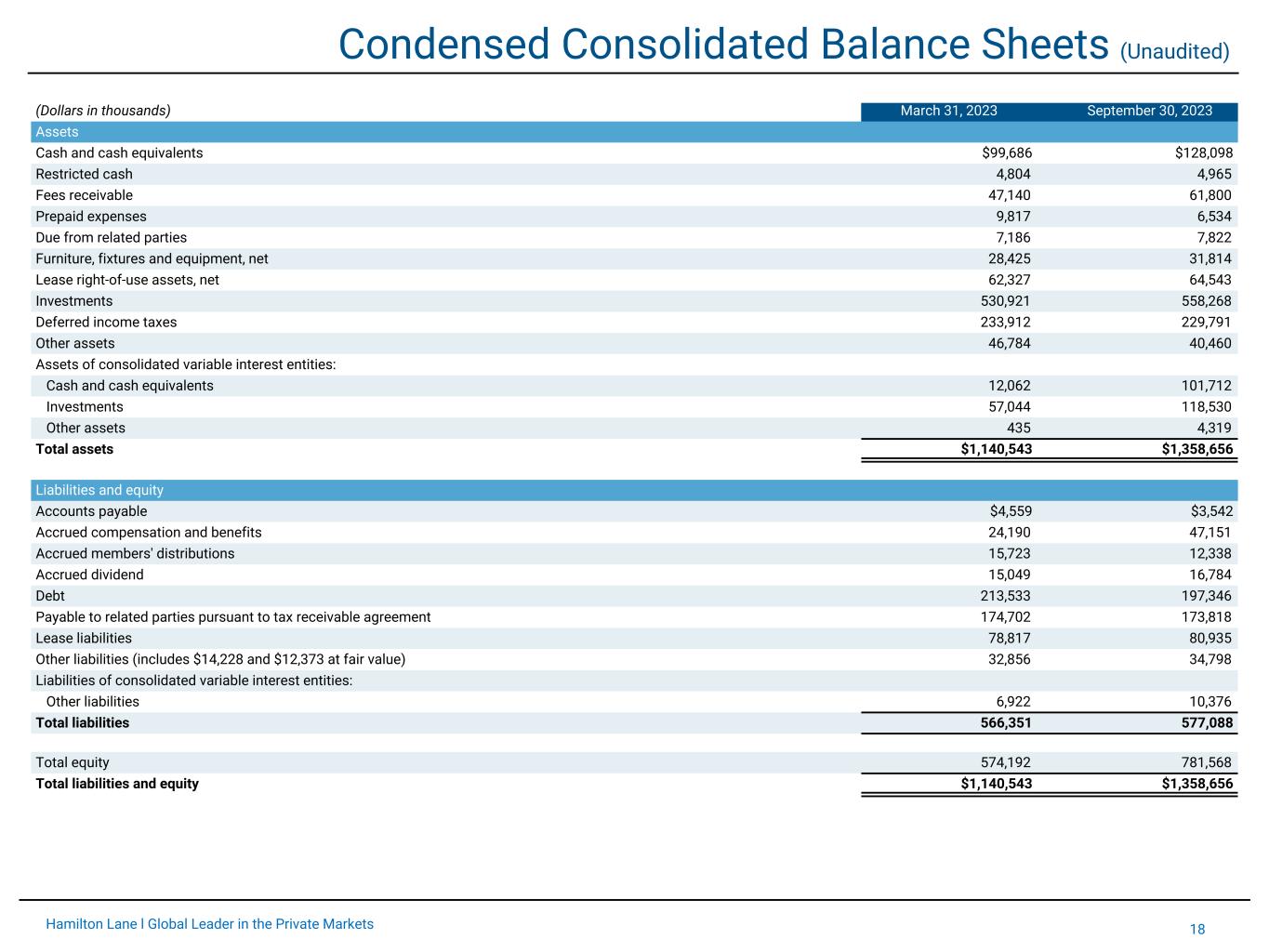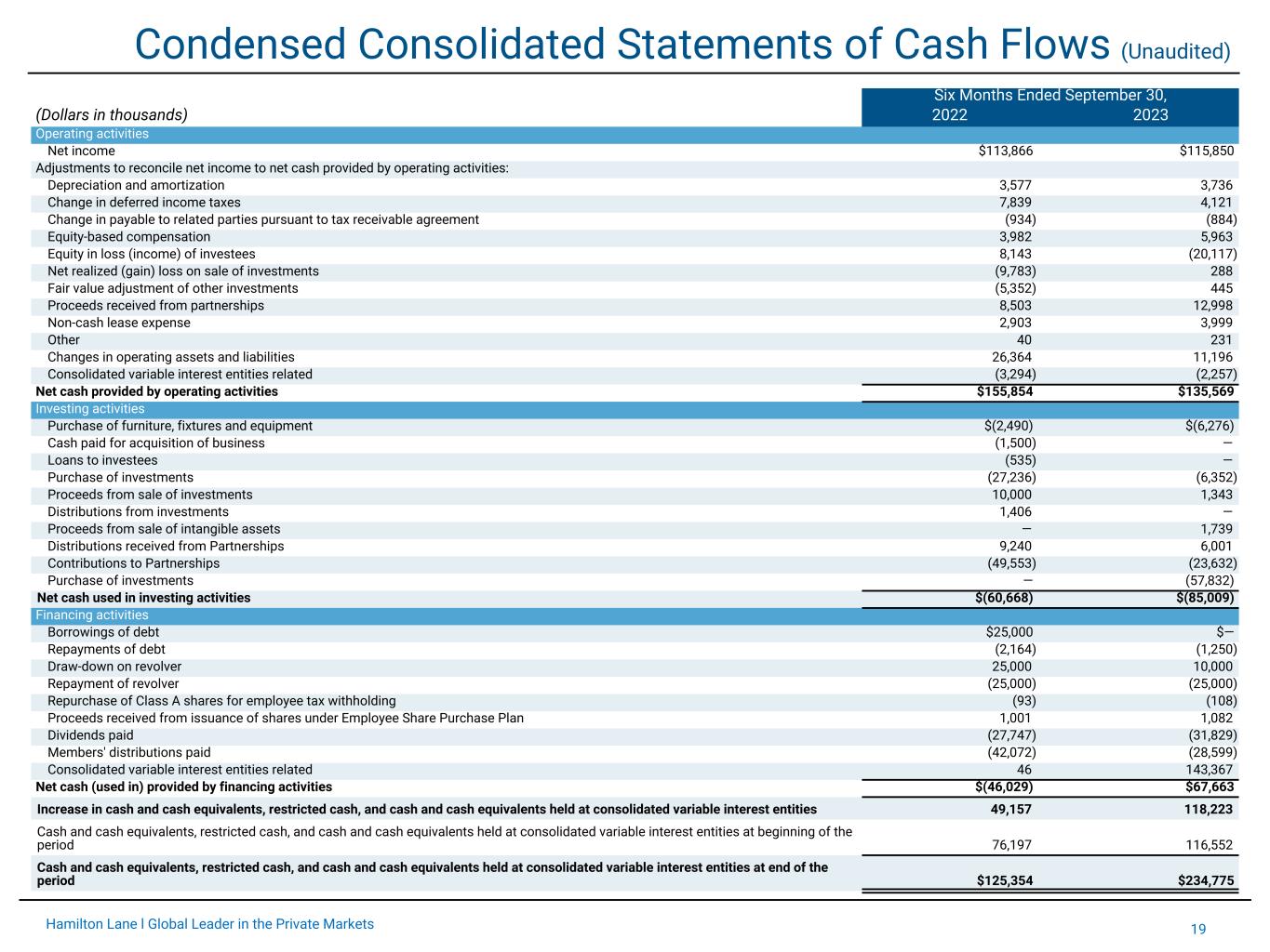 19Hamilton Lane l Global Leader in the Private Markets Condensed Consolidated Statements of Cash Flows (Unaudited) Six Months Ended September 30, (Dollars in thousands) 2022 2023 Operating activities Net income $113,866 $115,850 Adjustments to reconcile net income to net cash provided by operating activities: Depreciation and amortization 3,577 3,736 Change in deferred income taxes 7,839 4,121 Change in payable to related parties pursuant to tax receivable agreement (934) (884) Equity-based compensation 3,982 5,963 Equity in loss (income) of investees 8,143 (20,117) Net realized (gain) loss on sale of investments (9,783) 288 Fair value adjustment of other investments (5,352) 445 Proceeds received from partnerships 8,503 12,998 Non-cash lease expense 2,903 3,999 Other 40 231 Changes in operating assets and liabilities 26,364 11,196 Consolidated variable interest entities related (3,294) (2,257) Net cash provided by operating activities $155,854 $135,569 Investing activities Purchase of furniture, fixtures and equipment $(2,490) $(6,276) Cash paid for acquisition of business (1,500) — Loans to investees (535) — Purchase of investments (27,236) (6,352) Proceeds from sale of investments 10,000 1,343 Distributions from investments 1,406 — Proceeds from sale of intangible assets — 1,739 Distributions received from Partnerships 9,240 6,001 Contributions to Partnerships (49,553) (23,632) Purchase of investments — (57,832) Net cash used in investing activities $(60,668) $(85,009) Financing activities Borrowings of debt $25,000 $— Repayments of debt (2,164) (1,250) Draw-down on revolver 25,000 10,000 Repayment of revolver (25,000) (25,000) Repurchase of Class A shares for employee tax withholding (93) (108) Proceeds received from issuance of shares under Employee Share Purchase Plan 1,001 1,082 Dividends paid (27,747) (31,829) Members' distributions paid (42,072) (28,599) Consolidated variable interest entities related 46 143,367 Net cash (used in) provided by financing activities $(46,029) $67,663 Increase in cash and cash equivalents, restricted cash, and cash and cash equivalents held at consolidated variable interest entities 49,157 118,223 Cash and cash equivalents, restricted cash, and cash and cash equivalents held at consolidated variable interest entities at beginning of the period 76,197 116,552 Cash and cash equivalents, restricted cash, and cash and cash equivalents held at consolidated variable interest entities at end of the period $125,354 $234,775