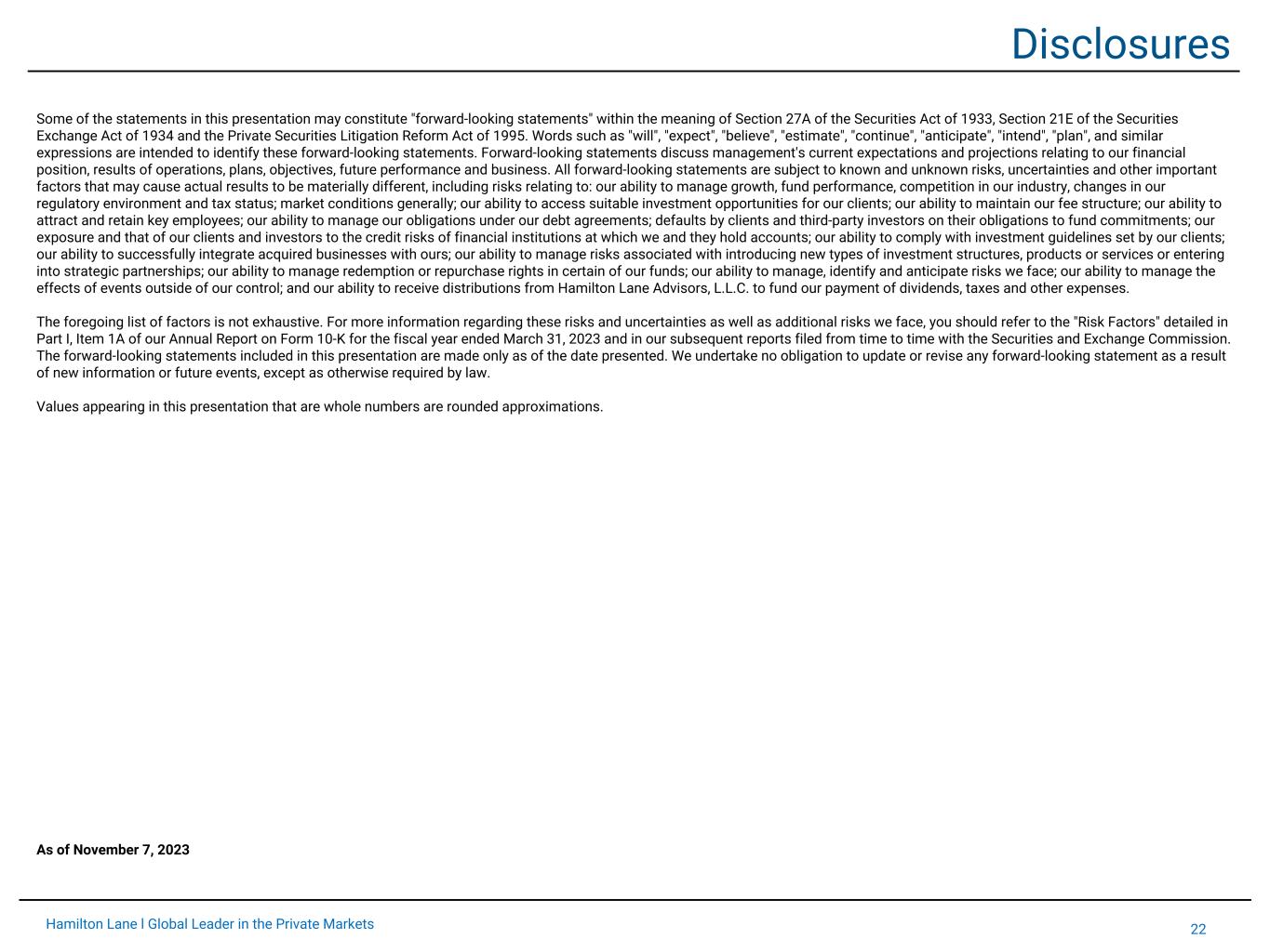 22Hamilton Lane l Global Leader in the Private Markets Disclosures Some of the statements in this presentation may constitute "forward-looking statements" within the meaning of Section 27A of the Securities Act of 1933, Section 21E of the Securities Exchange Act of 1934 and the Private Securities Litigation Reform Act of 1995. Words such as "will", "expect", "believe", "estimate", "continue", "anticipate", "intend", "plan", and similar expressions are intended to identify these forward-looking statements. Forward-looking statements discuss management's current expectations and projections relating to our financial position, results of operations, plans, objectives, future performance and business. All forward-looking statements are subject to known and unknown risks, uncertainties and other important factors that may cause actual results to be materially different, including risks relating to: our ability to manage growth, fund performance, competition in our industry, changes in our regulatory environment and tax status; market conditions generally; our ability to access suitable investment opportunities for our clients; our ability to maintain our fee structure; our ability to attract and retain key employees; our ability to manage our obligations under our debt agreements; defaults by clients and third-party investors on their obligations to fund commitments; our exposure and that of our clients and investors to the credit risks of financial institutions at which we and they hold accounts; our ability to comply with investment guidelines set by our clients; our ability to successfully integrate acquired businesses with ours; our ability to manage risks associated with introducing new types of investment structures, products or services or entering into strategic partnerships; our ability to manage redemption or repurchase rights in certain of our funds; our ability to manage, identify and anticipate risks we face; our ability to manage the effects of events outside of our control; and our ability to receive distributions from Hamilton Lane Advisors, L.L.C. to fund our payment of dividends, taxes and other expenses. The foregoing list of factors is not exhaustive. For more information regarding these risks and uncertainties as well as additional risks we face, you should refer to the "Risk Factors" detailed in Part I, Item 1A of our Annual Report on Form 10-K for the fiscal year ended March 31, 2023 and in our subsequent reports filed from time to time with the Securities and Exchange Commission. The forward-looking statements included in this presentation are made only as of the date presented. We undertake no obligation to update or revise any forward-looking statement as a result of new information or future events, except as otherwise required by law. Values appearing in this presentation that are whole numbers are rounded approximations. As of November 7, 2023