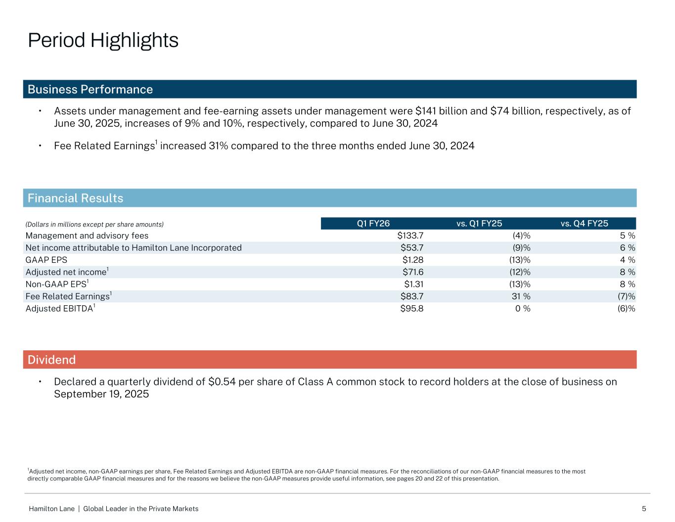 ハミルトン・レーンは、2025年9月19日営業終了時点の記録保持者に対し、クラスA普通株式1株当たり0.54ドルの四半期配当を宣言し、2025年10月6日に支払う。通期配当目標額は2.16ドルで、前年度配当から10%の増配となる。