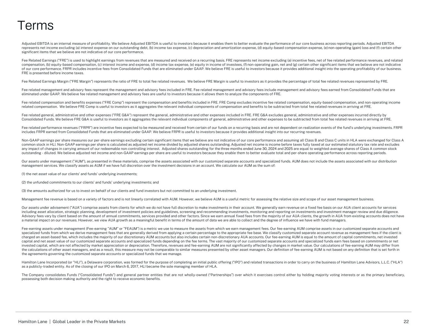 本リリース中の記述の一部は、1933年証券法第27A条、1934年証券取引法第21E条および1995年私募証券訴訟改革法の意味における「将来予想に関する記述」に該当する可能性があります。予定」、「期待」、「確信」、「推定」、「継続」、「予想」、「意図」、「計画」および類似の表現、またはこれらの言葉の否定バージョン、あるいはその他の類似の言葉は、これらの将来の見通しに関する記述を特定するためのものです。将来予想に関する記述は、当社の財政状態、経営成績、計画、目標、将来の業績および事業に関する経営陣の現在の予想および予測について述べたものです。すべての将来見通しに関する記述は、既知および未知のリスク、不確実性およびその他の重要な要因の影響を受けるため、実際の結果は以下のように大きく異なる可能性があります:当社の投資の過去の実績は、将来の実績や当社A種普通株式の将来のリターンを示すものとみなされるべきではありません。当社の顧客にとって利用可能で適切な投資機会を特定する当社の能力、当社が顧客のために行う投資ファンドやその他の投資へのアクセスをめぐる競争の激化;カスタマイズ・セパレート・アカウントおよびアドバイザリー・アカウントの手数料収入は長期的な契約収益源ではなく、激しい競争にさらされること、利益相反に適切に対処できないこと、上級管理職を維持し、さらに有能な投資専門家を惹きつける能力、事業を拡大し、新たな事業戦略を策定する能力、債務契約に基づく債務を管理する能力;不安定な市場、経済、地政学的情勢が当社の事業および当社のファンドまたは口座による投資に悪影響を及ぼす可能性、顧客および第三者投資家による資金コミットメントに対する義務の不履行、顧客によって設定された投資ガイドラインを遵守する当社の能力、当社の一部ファンドの投資家による償還権または買戻し権の行使;広範な政府規制、コンプライアンス違反、法律や規制の変更により、当社に悪影響が及ぶ可能性があること、当社が希望する手数料体系を維持する能力、当社の情報技術ネットワークや第三者サービスプロバイダーのセキュリティ維持の失敗、またはデータセキュリティ侵害、当社の唯一の重要資産はHamilton Lane Advisors, L.C.の持分であること、Hamilton Lane Advisors, L.C., Inc.L.C、したがって、配当金、税金、その他の経費の支払いは、ハミルトン・レーン・アドバイザーズからの分配金に依存しています。