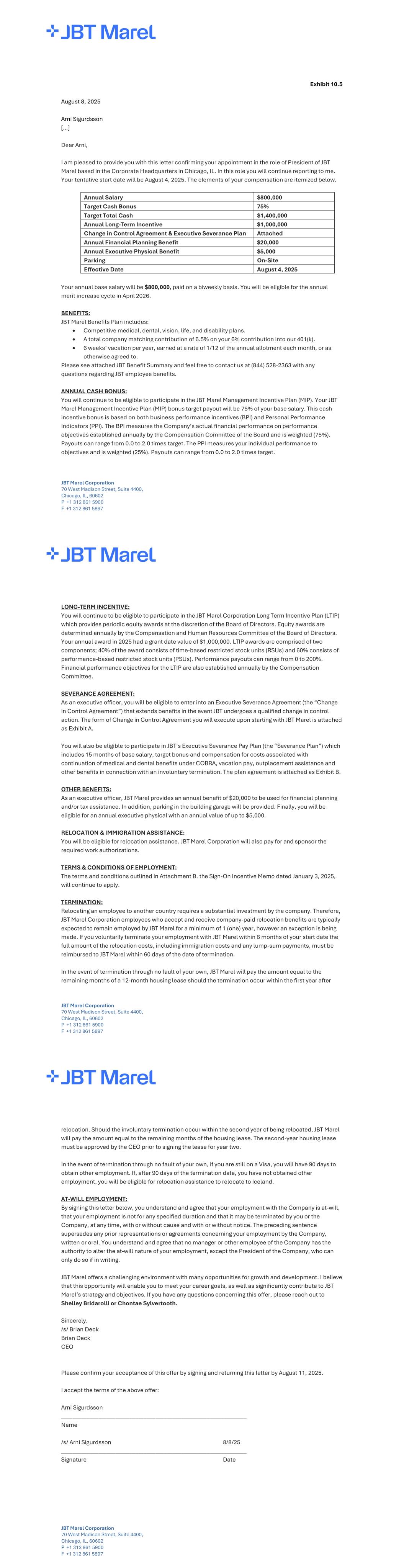 JBT Marel Corporation 70 West Madison Street, Suite 4400, Chicago, IL, 60602 P +1 312 861 5900 F +1 312 861 5897 Exhibit 10.5 August 8, 2025 Arni Sigurdsson […] Dear Arni, I am pleased to provide you with this letter confirming your appointment in the role of President of JBT Marel based in the Corporate Headquarters in Chicago, IL. In this role you will continue reporting to me. Your tentative start date will be August 4, 2025. The elements of your compensation are itemized below. Annual Salary $800,000 Target Cash Bonus 75% Target Total Cash $1,400,000 Annual Long-Term Incentive $1,000,000 Change in Control Agreement & Executive Severance Plan Attached Annual Financial Planning Benefit $20,000 Annual Executive Physical Benefit $5,000 Parking On-Site Effective Date August 4, 2025 Your annual base salary will be $800,000, paid on a biweekly basis. You will be eligible for the annual merit increase cycle in April 2026. BENEFITS: JBT Marel Benefits Plan includes: Competitive medical, dental, vision, life, and disability plans. A total company matching contribution of 6.5% on your 6% contribution into our 401(k). 6 weeks’ vacation per year, earned at a rate of 1/12 of the annual allotment each month, or as otherwise agreed to. Please see attached JBT Benefit Summary and feel free to contact us at (844) 528-2363 with any questions regarding JBT employee benefits. ANNUAL CASH BONUS: You will continue to be eligible to participate in the JBT Marel Management Incentive Plan (MIP). Your JBT Marel Management Incentive Plan (MIP) bonus target payout will be 75% of your base salary. This cash incentive bonus is based on both business performance incentives (BPI) and Personal Performance Indicators (PPI). The BPI measures the Company’s actual financial performance on performance objectives established annually by the Compensation Committee of the Board and is weighted (75%). Payouts can range from 0.0 to 2.0 times target. The PPI measures your individual performance to objectives and is weighted (25%). Payouts can range from 0.0 to 2.0 times target. JBT Marel Corporation 70 West Madison Street, Suite 4400, Chicago, IL, 60602 P +1 312 861 5900 F +1 312 861 5897 LONG-TERM INCENTIVE: You will continue to be eligible to participate in the JBT Marel Corporation Long Term Incentive Plan (LTIP) which provides periodic equity awards at the discretion of the Board of Directors. Equity awards are determined annually by the Compensation and Human Resources Committee of the Board of Directors. Your annual award in 2025 had a grant date value of $1,000,000. LTIP awards are comprised of two components; 40% of the award consists of time-based restricted stock units (RSUs) and 60% consists of performance-based restricted stock units (PSUs). Performance payouts can range from 0 to 200%. Financial performance objectives for the LTIP are also established annually by the Compensation Committee. SEVERANCE AGREEMENT: As an executive officer, you will be eligible to enter into an Executive Severance Agreement (the “Change in Control Agreement”) that extends benefits in the event JBT undergoes a qualified change in control action. The form of Change in Control Agreement you will execute upon starting with JBT Marel is attached as Exhibit A. You will also be eligible to participate in JBT’s Executive Severance Pay Plan (the “Severance Plan”) which includes 15 months of base salary, target bonus and compensation for costs associated with continuation of medical and dental benefits under COBRA, vacation pay, outplacement assistance and other benefits in connection with an involuntary termination. The plan agreement is attached as Exhibit B. OTHER BENEFITS: As an executive officer, JBT Marel provides an annual benefit of $20,000 to be used for financial planning and/or tax assistance. In addition, parking in the building garage will be provided. Finally, you will be eligible for an annual executive physical with an annual value of up to $5,000. RELOCATION & IMMIGRATION ASSISTANCE: You will be eligible for relocation assistance. JBT Marel Corporation will also pay for and sponsor the required work authorizations. TERMS & CONDITIONS OF EMPLOYMENT: The terms and conditions outlined in Attachment B. the Sign-On Incentive Memo dated January 3, 2025, will continue to apply. TERMINATION: Relocating an employee to another country requires a substantial investment by the company. Therefore, JBT Marel Corporation employees who accept and receive company-paid relocation benefits are typically expected to remain employed by JBT Marel for a minimum of 1 (one) year, however an exception is being made. If you voluntarily terminate your employment with JBT Marel within 6 months of your start date the full amount of the relocation costs, including immigration costs and any lump-sum payments, must be reimbursed to JBT Marel within 60 days of the date of termination. In the event of termination through no fault of your own, JBT Marel will pay the amount equal to the remaining months of a 12-month housing lease should the termination occur within the first year after JBT Marel Corporation 70 West Madison Street, Suite 4400, Chicago, IL, 60602 P +1 312 861 5900 F +1 312 861 5897 relocation. Should the involuntary termination occur within the second year of being relocated, JBT Marel will pay the amount equal to the remaining months of the housing lease. The second-year housing lease must be approved by the CEO prior to signing the lease for year two. In the event of termination through no fault of your own, if you are still on a Visa, you will have 90 days to obtain other employment. If, after 90 days of the termination date, you have not obtained other employment, you will be eligible for relocation assistance to relocate to Iceland. AT-WILL EMPLOYMENT: By signing this letter below, you understand and agree that your employment with the Company is at-will, that your employment is not for any specified duration and that it may be t