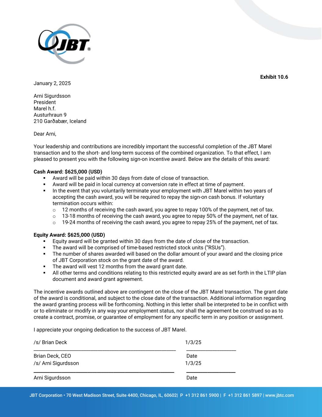 JBT Corporation • 70 West Madison Street, Suite 4400, Chicago, IL, 60602| P +1 312 861 5900 | F +1 312 861 5897 | www.jbtc.com Exhibit 10.6 January 2, 2025 Arni Sigurdsson President Marel h.f. Austurhraun 9 210 Garðabær, Iceland Dear Arni, Your leadership and contributions are incredibly important the successful completion of the JBT Marel transaction and to the short- and long-term success of the combined organization. To that effect, I am pleased to present you with the following sign-on incentive award. Below are the details of this award: Cash Award: $625,000 (USD) Award will be paid within 30 days from date of close of transaction. Award will be paid in local currency at conversion rate in effect at time of payment. In the event that you voluntarily terminate your employment with JBT Marel within two years of accepting the cash award, you will be required to repay the sign-on cash bonus. If voluntary termination occurs within: o 12 months of receiving the cash award, you agree to repay 100% of the payment, net of tax. o 13-18 months of receiving the cash award, you agree to repay 50% of the payment, net of tax. o 19-24 months of receiving the cash award, you agree to repay 25% of the payment, net of tax. Equity Award: $625,000 (USD) Equity award will be granted within 30 days from the date of close of the transaction. The award will be comprised of time-based restricted stock units (“RSUs”). The number of shares awarded will based on the dollar amount of your award and the closing price of JBT Corporation stock on the grant date of the award. The award will vest 12 months from the award grant date. All other terms and conditions relating to this restricted equity award are as set forth in the LTIP plan document and award grant agreement. The incentive awards outlined above are contingent on the close of the JBT Marel transaction. The grant date of the award is conditional, and subject to the close date of the transaction. Additional information regarding the award granting process will be forthcoming. Nothing in this letter shall be interpreted to be in conflict with or to eliminate or modify in any way your employment status, nor shall the agreement be construed so as to create a contract, promise, or guarantee of employment for any specific term in any position or assignment. I appreciate your ongoing dedication to the success of JBT Marel. /s/ Brian Deck 1/3/25 ____________________________________________________________ _____________________ Brian Deck, CEO Date /s/ Arni Sigurdsson 1/3/25 ____________________________________________________________ _____________________ Arni Sigurdsson Date
