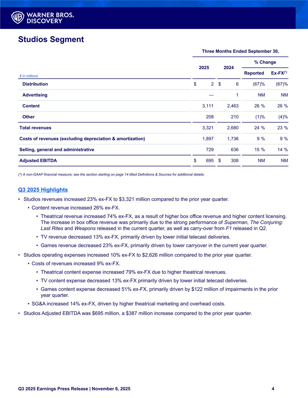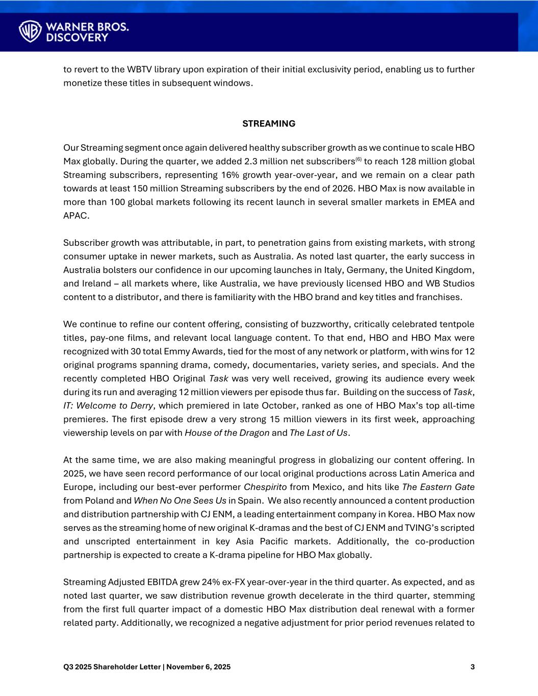 Streaming Segment Three Months Ended September 30, 2025 2024 % Change $ in millions Reported Ex-FX(*) Distribution $ 2,317 $ 2,320 — % — % Advertising 235 205 15 % 14 % Subscriber-related revenues(*) 2,552 2,525 1 % 1 % Content 79 107 (26) % (27) % Other 2 2 — % — % Total revenues 2,633 2,634 — % — % Costs of revenues (excluding depreciation & amortization) 1,789 1,776 1 % — % Selling, general and administrative 499 569 (12) % (13) % Adjusted EBITDA $ 345 $ 289 19 % 24 % In millions Q3 2025 Q2 2025 Q3 2024 ARPU in $ Q3 2025 Q2 2025 Q3 2024 Domestic subscribers 58.0 57.8 52.6 Domestic ARPU $ 10.40 $ 11.16 $ 11.99 International subscribers 70.0 67.9 57.9 International ARPU $ 3.70 $ 3.85 $ 4.05 Global streaming subscribers 128.0 125.7 110.5 Global ARPU $ 6.64 $ 7.14 $ 7.84 (*) A non-GAAP financial measure; see the section starting on page 14 titled Definitions & Sources for additional details. Domestic includes the U.S. and Canada. Subscriber counts in the above table are rounded and minor differences in totals may exist. Q3 2025 Highlights • Global streaming subscribers were 128.0 million, an increase of 2.3 million global subscribers vs. Q2. • Streaming revenues were relatively unchanged compared to the prior year quarter. Subscriber-related revenues(9)(*) increased 1% ex-FX compared to the prior year quarter. • Distribution revenue was flat, as a result of a 16% increase in subscribers following the continued growth and global expansion of HBO Max, including new distribution deals, partially offset by the first full quarter impact of the domestic distribution deal renewal with a former related party previously disclosed in Q2. Additionally, distribution revenue was negatively impacted by an offset to international revenue associated with a legal ruling that may require adjustments to prior customer billings. • Advertising revenue increased 14% ex-FX, primarily driven by an increase in ad-lite subscribers, partially offset by domestic pricing pressures. • Global streaming ARPU(10) decreased 16% ex-FX to $6.64, primarily attributable to growth in lower ARPU international markets, an offset to international revenue associated with a legal ruling that may require adjustments to prior customer billings, and a 13% decrease in domestic streaming ARPU to $10.40. The decrease in domestic streaming ARPU was primarily driven by the first full quarter impact of the domestic distribution deal renewal with a former related party previously disclosed in Q2. • Content revenue decreased 27% ex-FX, driven by the launch of HBO Max in new international markets which resulted in lower third-party licensing. • Streaming operating expenses decreased 3% ex-FX to $2,288 million compared to the prior year quarter. • Costs of revenues were relatively unchanged as higher international content costs to support the global expansion of HBO Max were offset by the broadcast of the Olympics in Europe in the prior year. • SG&A decreased 13% ex-FX, largely due to lower marketing costs. • Streaming Adjusted EBITDA increased 24% ex-FX to $345 million compared to the prior year quarter. Q3 2025 Earnings Press Release | November 6, 2025 3