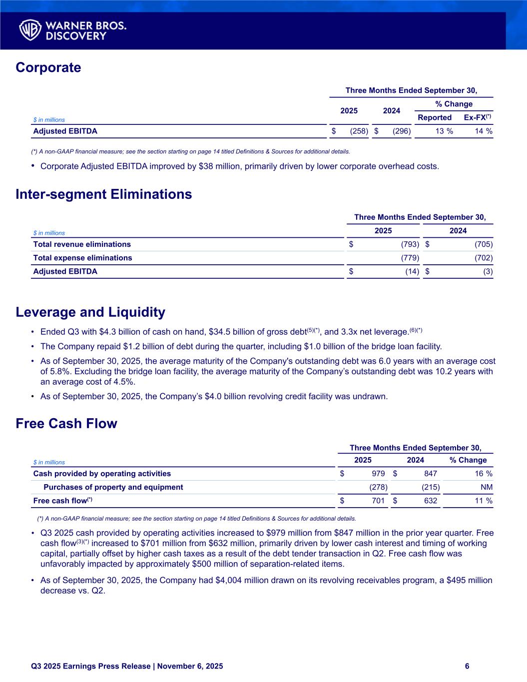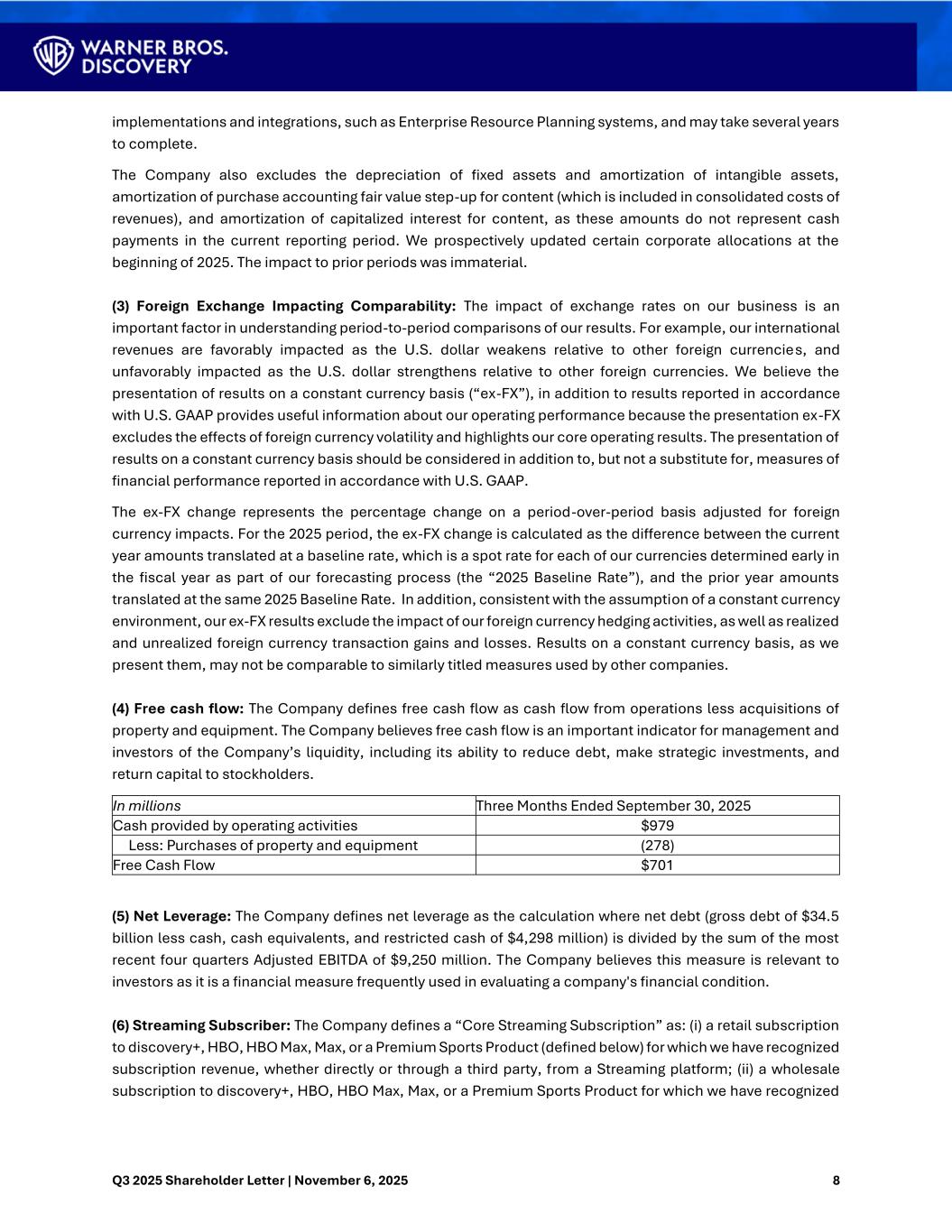 Definitions and Sources for Warner Bros. Discovery, Inc. (1) Foreign Exchange Impacting Comparability: The impact of exchange rates on our business is an important factor in understanding period-to- period comparisons of our results. For example, our international revenues are favorably impacted as the U.S. dollar weakens relative to other foreign currencies, and unfavorably impacted as the U.S. dollar strengthens relative to other foreign currencies. We believe the presentation of results on a constant currency basis (“ex-FX”), in addition to results reported in accordance with U.S. GAAP provides useful information about our operating performance because the presentation ex-FX excludes the effects of foreign currency volatility and highlights our core operating results. The presentation of results on a constant currency basis should be considered in addition to, but not a substitute for, measures of financial performance reported in accordance with U.S. GAAP. The ex-FX change represents the percentage change on a period-over-period basis adjusted for foreign currency impacts. For the 2025 period, the ex- FX change is calculated as the difference between the current year amounts translated at a baseline rate, which is a spot rate for each of our currencies determined early in the fiscal year as part of our forecasting process (the “2025 Baseline Rate”), and the prior year amounts translated at the same 2025 Baseline Rate. In addition, consistent with the assumption of a constant currency environment, our ex-FX results exclude the impact of our foreign currency hedging activities, as well as realized and unrealized foreign currency transaction gains and losses. Results on a constant currency basis, as we present them, may not be comparable to similarly titled measures used by other companies. (2) Revenues/Costs of Revenues Excluding the Impact of the 2024 Olympics in Europe: The Company defines revenues/costs of revenues excluding the impact of the 2024 Olympics in Europe as total revenues/costs of revenues less revenues/costs of revenues from the Olympics in Europe. The Company may exclude revenues/costs of revenues from the Olympics in Europe at the consolidated level, segment level, or both. The Company believes this measure is relevant to investors because it allows them to analyze our operating performance on businesses that the Company continues to operate on an ongoing basis. (3) Adjusted EBITDA: The Company evaluates the operating performance of its operating segments based on financial measures such as revenues and Adjusted EBITDA. Adjusted EBITDA is defined as operating income excluding: (i) employee share-based compensation, (ii) depreciation and amortization, (iii) restructuring and facility consolidation, (iv) certain impairment charges, (v) gains and losses on business and asset dispositions, (vi) third-party transaction and integration costs, (vii) amortization of purchase accounting fair value step-up for content, (viii) amortization of capitalized interest for content, and (ix) other items impacting comparability. The Company uses this measure to assess the operating results and performance of the segments, perform analytical comparisons, identify strategies to improve performance, and allocate resources to each segment. The Company believes Adjusted EBITDA is relevant to investors because it allows them to analyze the operating performance of each segment using the same metric management uses. The Company excludes employee share-based compensation, restructuring, certain impairment charges, gains and losses on business and asset dispositions, and transaction and integration costs from the calculation of Adjusted EBITDA due to their impact on comparability between periods. Integration costs include transformative system implementations and integrations, such as Enterprise Resource Planning systems, and may take several years to complete. The Company also excludes the depreciation of fixed assets and amortization of intangible assets, amortization of purchase accounting fair value step- up for content (which is included in consolidated costs of revenues), and amortization of capitalized interest for content, as these amounts do not represent cash payments in the current reporting period. We prospectively updated certain corporate allocations at the beginning of 2025. The impact to prior periods was immaterial. (4) Free cash flow: The Company defines free cash flow as cash flow from operations less acquisitions of property and equipment. The Company believes free cash flow is an important indicator for management and investors of the Company’s liquidity, including its ability to reduce debt, make strategic investments, and return capital to stockholders. (5) Gross debt: The Company defines gross debt of $34.5 billion as total debt of $33.8 billion, plus finance leases of $682 million. The Company believes this measure is relevant to investors as it is a financial measure frequently used in evaluating a company's financial condition. (6) Net leverage: The Company defines net leverage as the calculation where net debt (gross debt of $34.5 billion, less cash, cash equivalents, and restricted cash of $4,298 million) is divided by the sum of the most recent four quarters Adjusted EBITDA of $9,250 million. The Company believes this measure is relevant to investors as it is a financial measure frequently used in evaluating a company's financial condition. Q3 2025 Earnings Press Release | November 6, 2025 14