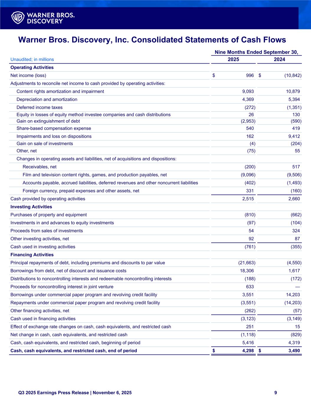 Warner Bros. Discovery, Inc. Consolidated Statements of Cash Flows Nine Months Ended September 30, Unaudited; in millions 2025 2024 Operating Activities Net income (loss) $ 996 $ (10,842) Adjustments to reconcile net income to cash provided by operating activities: Content rights amortization and impairment 9,093 10,879 Depreciation and amortization 4,369 5,394 Deferred income taxes (272) (1,351) Equity in losses of equity method investee companies and cash distributions 26 130 Gain on extinguishment of debt (2,953) (590) Share-based compensation expense 540 419 Impairments and loss on dispositions 162 9,412 Gain on sale of investments (4) (204) Other, net (75) 55 Changes in operating assets and liabilities, net of acquisitions and dispositions: Receivables, net (200) 517 Film and television content rights, games, and production payables, net (9,096) (9,506) Accounts payable, accrued liabilities, deferred revenues and other noncurrent liabilities (402) (1,493) Foreign currency, prepaid expenses and other assets, net 331 (160) Cash provided by operating activities 2,515 2,660 Investing Activities Purchases of property and equipment (810) (662) Investments in and advances to equity investments (97) (104) Proceeds from sales of investments 54 324 Other investing activities, net 92 87 Cash used in investing activities (761) (355) Financing Activities Principal repayments of debt, including premiums and discounts to par value (21,663) (4,550) Borrowings from debt, net of discount and issuance costs 18,306 1,617 Distributions to noncontrolling interests and redeemable noncontrolling interests (188) (172) Proceeds for noncontrolling interest in joint venture 633 — Borrowings under commercial paper program and revolving credit facility 3,551 14,203 Repayments under commercial paper program and revolving credit facility (3,551) (14,203) Other financing activities, net (262) (57) Cash used in financing activities (3,123) (3,149) Effect of exchange rate changes on cash, cash equivalents, and restricted cash 251 15 Net change in cash, cash equivalents, and restricted cash (1,118) (829) Cash, cash equivalents, and restricted cash, beginning of period 5,416 4,319 Cash, cash equivalents, and restricted cash, end of period $ 4,298 $ 3,490 Q3 2025 Earnings Press Release | November 6, 2025 9