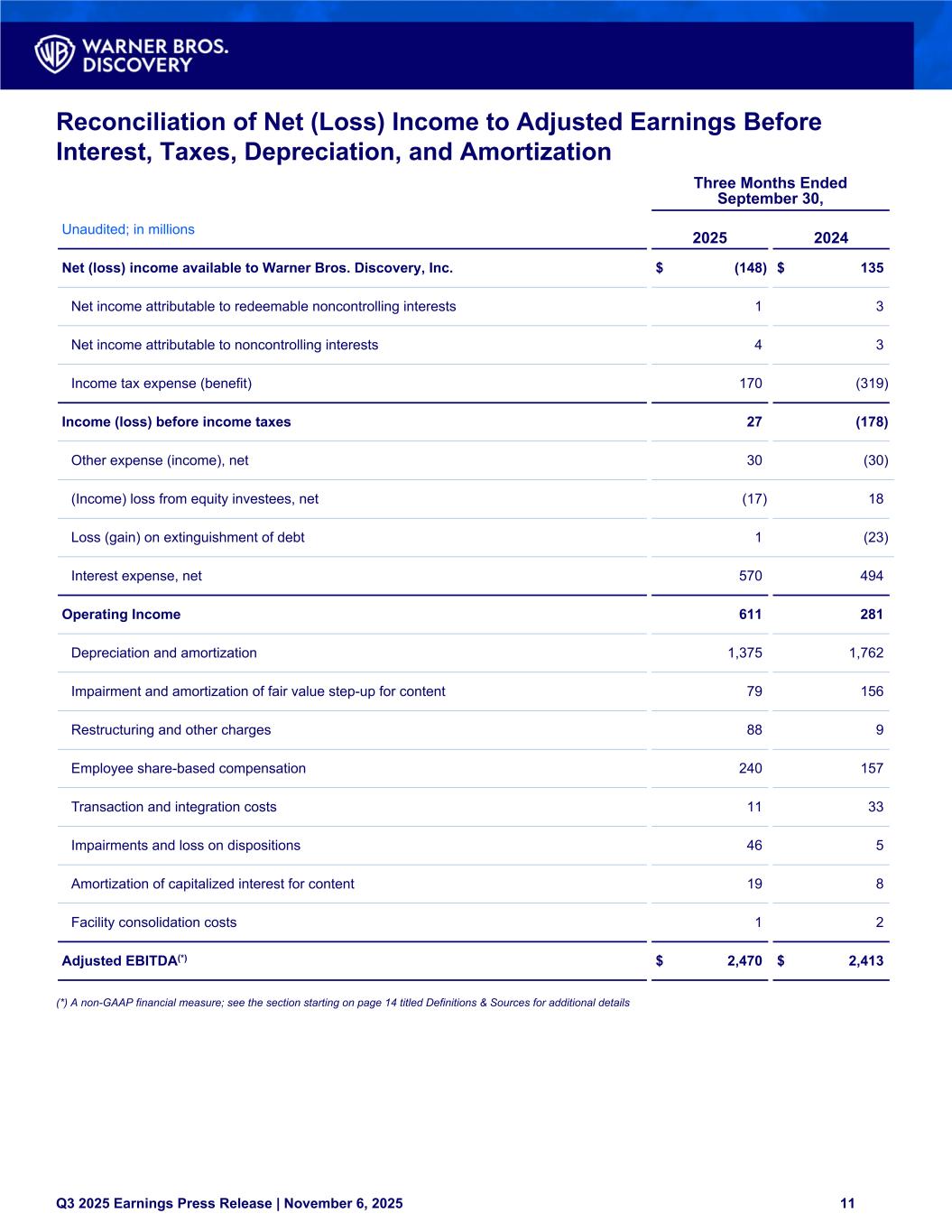Reconciliation of Net (Loss) Income to Adjusted Earnings Before Interest, Taxes, Depreciation, and Amortization Three Months Ended September 30, Unaudited; in millions 2025 2024 Net (loss) income available to Warner Bros. Discovery, Inc. $ (148) $ 135 Net income attributable to redeemable noncontrolling interests 1 3 Net income attributable to noncontrolling interests 4 3 Income tax expense (benefit) 170 (319) Income (loss) before income taxes 27 (178) Other expense (income), net 30 (30) (Income) loss from equity investees, net (17) 18 Loss (gain) on extinguishment of debt 1 (23) Interest expense, net 570 494 Operating Income 611 281 Depreciation and amortization 1,375 1,762 Impairment and amortization of fair value step-up for content 79 156 Restructuring and other charges 88 9 Employee share-based compensation 240 157 Transaction and integration costs 11 33 Impairments and loss on dispositions 46 5 Amortization of capitalized interest for content 19 8 Facility consolidation costs 1 2 Adjusted EBITDA(*) $ 2,470 $ 2,413 (*) A non-GAAP financial measure; see the section starting on page 14 titled Definitions & Sources for additional details Q3 2025 Earnings Press Release | November 6, 2025 11