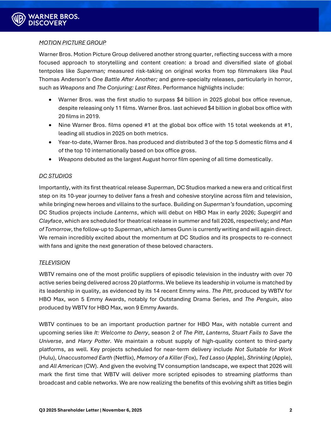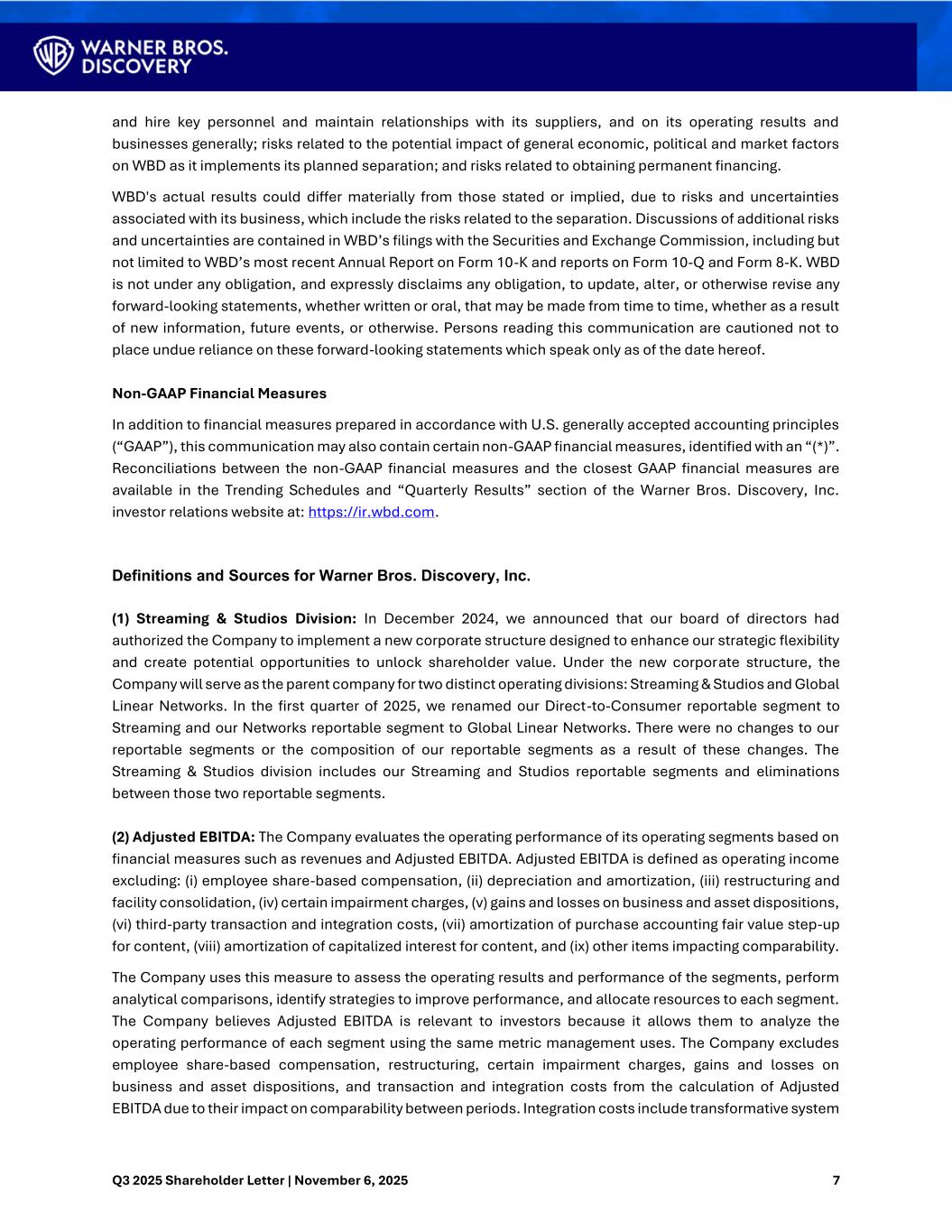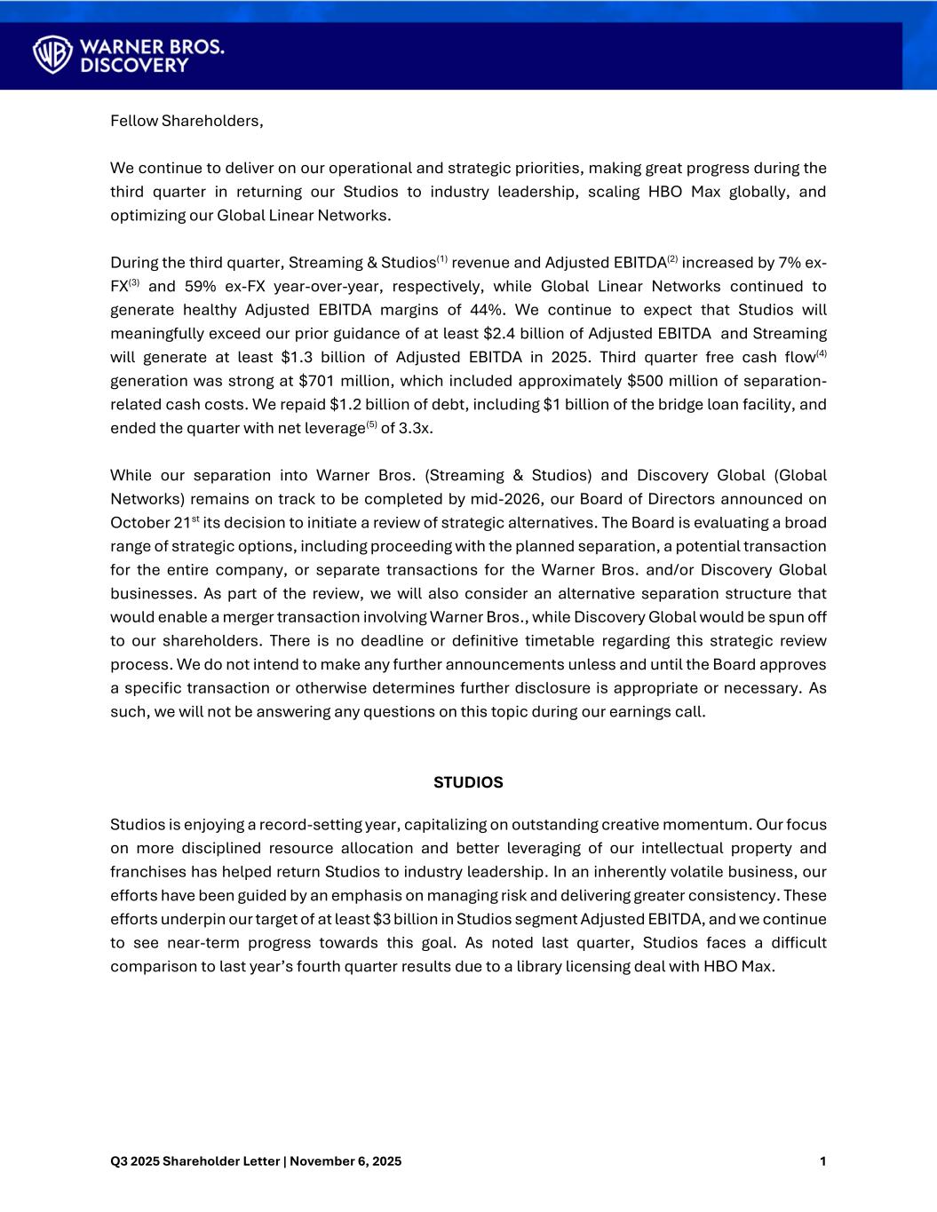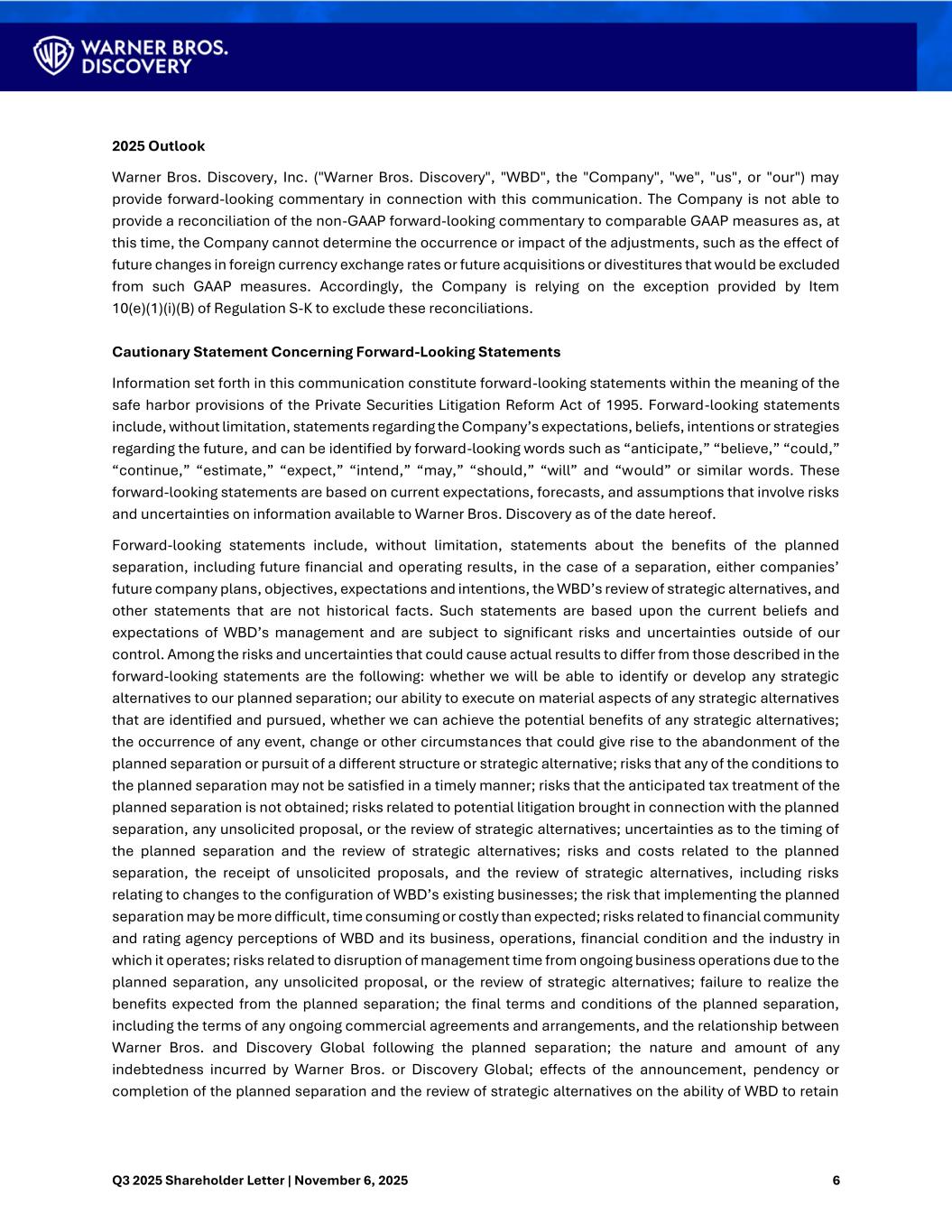2025 Outlook Warner Bros. Discovery, Inc. ("Warner Bros. Discovery", "WBD", the "Company", "we", "us", or "our" ) may provide forward-looking commentary in connection with this earnings announcement on its quarterly earnings conference call. Details on how to access the audio webcast are included below. Q3 2025 Prepared Earnings Remarks Conference Call Information In conjunction with this release, Warner Bros. Discovery will post a Shareholder Letter and host a conference call today, November 6, 2025 at 8:00 a.m. ET, to discuss its third quarter 2025 financial results. To access the Shareholder Letter and webcast of the earnings call, please visit the Investor Relations section of the Company's website at www.wbd.com. Cautionary Statement Concerning Forward-Looking Statements Information set forth in this communication constitute forward-looking statements within the meaning of the safe harbor provisions of the Private Securities Litigation Reform Act of 1995. Forward-looking statements include, without limitation, statements regarding the Company’s expectations, beliefs, intentions or strategies regarding the future, and can be identified by forward-looking words such as “anticipate,” “believe,” “could,” “continue,” “estimate,” “expect,” “intend,” “may,” “should,” “will” and “would” or similar words. These forward-looking statements are based on current expectations, forecasts, and assumptions that involve risks and uncertainties and on information available to Warner Bros. Discovery as of the date hereof. Forward-looking statements include, without limitation, statements about the benefits of the planned separation, including future financial and operating results, in the case of a separation, either companies’ future company plans, objectives, expectations and intentions, the WBD’s review of strategic alternatives, and other statements that are not historical facts. Such statements are based upon the current beliefs and expectations of WBD’s management and are subject to significant risks and uncertainties outside of our control. Among the risks and uncertainties that could cause actual results to differ from those described in the forward-looking statements are the following: whether we will be able to identify or develop any strategic alternatives to our planned separation; our ability to execute on material aspects of any strategic alternatives that are identified and pursued, whether we can achieve the potential benefits of any strategic alternatives; the occurrence of any event, change or other circumstances that could give rise to the abandonment of the planned separation or pursuit of a different structure or strategic alternative; risks that any of the conditions to the planned separation may not be satisfied in a timely manner; risks that the anticipated tax treatment of the planned separation is not obtained; risks related to potential litigation brought in connection with the planned separation, any unsolicited proposal, or the review of strategic alternatives; uncertainties as to the timing of the planned separation and the review of strategic alternatives; risks and costs related to the planned separation, the receipt of unsolicited proposals, and the review of strategic alternatives, including risks relating to changes to the configuration of WBD’s existing businesses; the risk that implementing the planned separation may be more difficult, time consuming or costly than expected; risks related to financial community and rating agency perceptions of WBD and its business, operations, financial condition and the industry in which it operates; risks related to disruption of management time from ongoing business operations due to the planned separation, any unsolicited proposal, or the review of strategic alternatives; failure to realize the benefits expected from the planned separation; the final terms and conditions of the planned separation, including the terms of any ongoing commercial agreements and arrangements, and the relationship between Warner Bros. and Discovery Global following the planned separation; the nature and amount of any indebtedness incurred by Warner Bros. or Discovery Global; effects of the announcement, pendency or completion of the planned separation and the review of strategic alternatives on the ability of WBD to retain and hire key personnel and maintain relationships with its suppliers, and on its operating results and businesses generally; risks related to the potential impact of general economic, political and market factors on WBD as it implements its planned separation; and risks related to obtaining permanent financing. WBD's actual results could differ materially from those stated or implied, due to risks and uncertainties associated with its business, which include the risks related to the separation. Discussions of additional risks and uncertainties are contained in WBD’s filings with the Securities and Exchange Commission, including but not limited to WBD’s most recent Annual Report on Form 10-K and reports on Form 10-Q and Form 8-K. WBD is not under any obligation, and expressly disclaims any obligation, to update, alter, or otherwise revise any forward-looking statements, whether written or oral, that may be made from time to time, whether as a result of new information, future events, or otherwise. Persons reading this communication are cautioned not to place undue reliance on these forward-looking statements which speak only as of the date hereof. Non-GAAP Financial Measures In addition to financial measures prepared in accordance with U.S. generally accepted accounting principles (“GAAP”), this communication may also contain certain non-GAAP financial measures, identified with an "(*)". Reconciliations between the non-GAAP financial measures and the closest GAAP financial measures are available in the financial schedules in this release and in the "Quarterly Results" sect