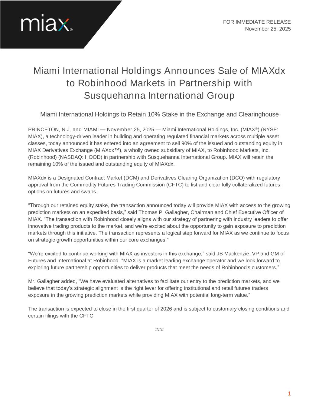 FOR IMMEDIATE RELEASE November 25, 2025 1 Miami International Holdings Announces Sale of MIAXdx to Robinhood Markets in Partnership with Susquehanna International Group Miami International Holdings to Retain 10% Stake in the Exchange and Clearinghouse PRINCETON, N.J. and MIAMI — November 25, 2025 — Miami International Holdings, Inc. (MIAX®) (NYSE: MIAX), a technology-driven leader in building and operating regulated financial markets across multiple asset classes, today announced it has entered into an agreement to sell 90% of the issued and outstanding equity in MIAX Derivatives Exchange (MIAXdx™), a wholly owned subsidiary of MIAX, to Robinhood Markets, Inc. (Robinhood) (NASDAQ: HOOD) in partnership with Susquehanna International Group. MIAX will retain the remaining 10% of the issued and outstanding equity of MIAXdx. MIAXdx is a Designated Contract Market (DCM) and Derivatives Clearing Organization (DCO) with regulatory approval from the Commodity Futures Trading Commission (CFTC) to list and clear fully collateralized futures, options on futures and swaps. “Through our retained equity stake, the transaction announced today will provide MIAX with access to the growing prediction markets on an expedited basis,” said Thomas P. Gallagher, Chairman and Chief Executive Officer of MIAX. “The transaction with Robinhood closely aligns with our strategy of partnering with industry leaders to offer innovative trading products to the market, and we’re excited about the opportunity to gain exposure to prediction markets through this initiative. The transaction represents a logical step forward for MIAX as we continue to focus on strategic growth opportunities within our core exchanges.” “We’re excited to continue working with MIAX as investors in this exchange,” said JB Mackenzie, VP and GM of Futures and International at Robinhood. “MIAX is a market leading exchange operator and we look forward to exploring future partnership opportunities to deliver products that meet the needs of Robinhood's customers.” Mr. Gallagher added, “We have evaluated alternatives to facilitate our entry to the prediction markets, and we believe that today’s strategic alignment is the right lever for offering institutional and retail futures traders exposure in the growing prediction markets while providing MIAX with potential long-term value.” The transaction is expected to close in the first quarter of 2026 and is subject to customary closing conditions and certain filings with the CFTC. ###