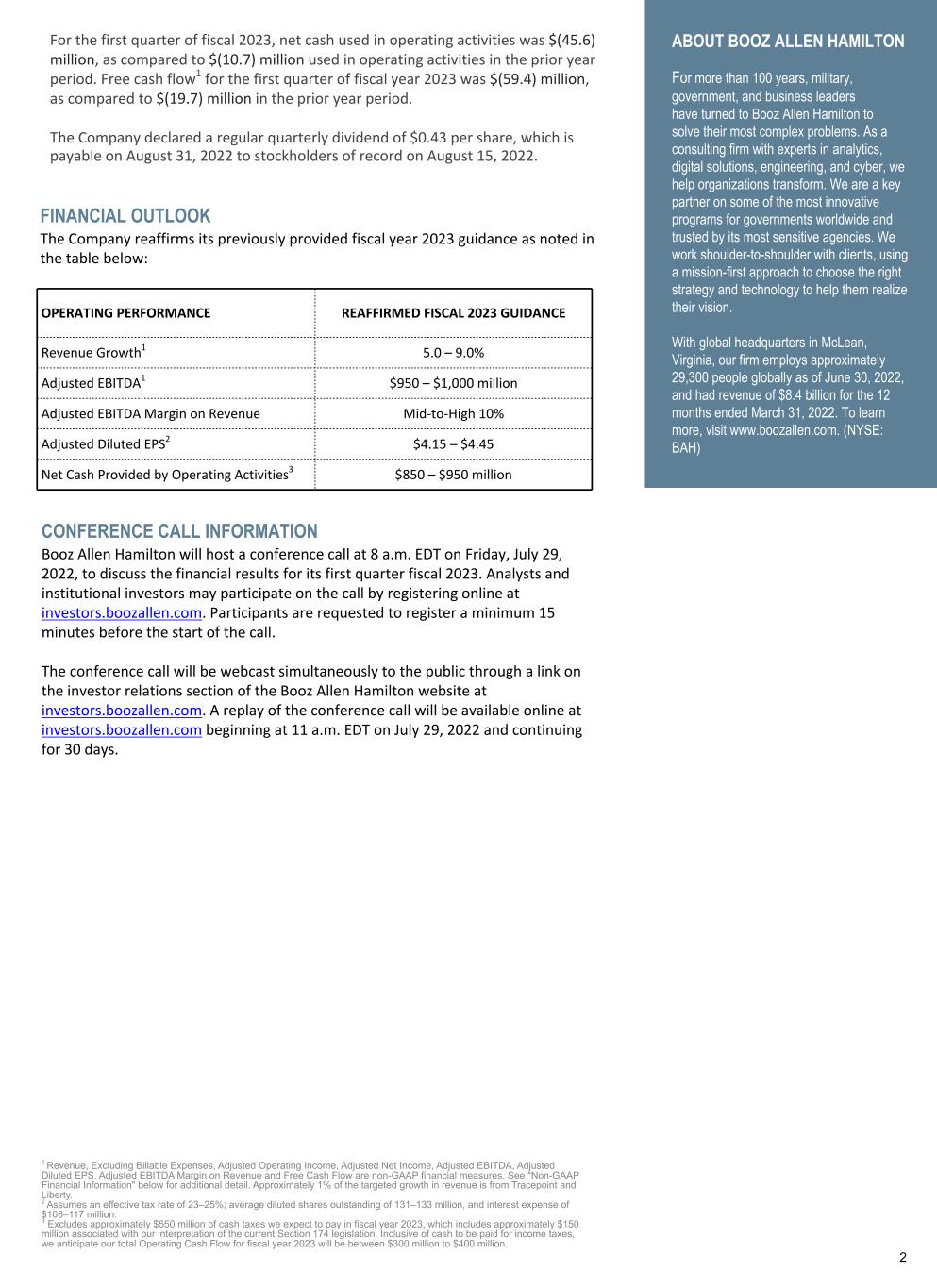 FINANCIAL OUTLOOK The Company reaffirms its previously provided fiscal year 2023 guidance as noted in the table below: CONFERENCE CALL INFORMATION Booz Allen Hamilton will host a conference call at 8 a.m. EDT on Friday, July 29, 2022, to discuss the financial results for its first quarter fiscal 2023. Analysts and institutional investors may participate on the call by registering online at investors.boozallen.com. Participants are requested to register a minimum 15 minutes before the start of the call. The conference call will be webcast simultaneously to the public through a link on the investor relations section of the Booz Allen Hamilton website at investors.boozallen.com. A replay of the conference call will be available online at investors.boozallen.com beginning at 11 a.m. EDT on July 29, 2022 and continuing for 30 days. 1 Revenue, Excluding Billable Expenses, Adjusted Operating Income, Adjusted Net Income, Adjusted EBITDA, Adjusted Diluted EPS, Adjusted EBITDA Margin on Revenue and Free Cash Flow are non-GAAP financial measures. See "Non-GAAP Financial Information" below for additional detail. Approximately 1% of the targeted growth in revenue is from Tracepoint and Liberty. 2 Assumes an effective tax rate of 23–25%; average diluted shares outstanding of 131–133 million, and interest expense of $108–117 million. 3 Excludes approximately $550 million of cash taxes we expect to pay in fiscal year 2023, which includes approximately $150 million associated with our interpretation of the current Section 174 legislation. Inclusive of cash to be paid for income taxes, we anticipate our total Operating Cash Flow for fiscal year 2023 will be between $300 million to $400 million. 2 For the first quarter of fiscal 2023, net cash used in operating activities was $(45.6) million, as compared to $(10.7) million used in operating activities in the prior year period. Free cash flow1 for the first quarter of fiscal year 2023 was $(59.4) million, as compared to $(19.7) million in the prior year period. The Company declared a regular quarterly dividend of $0.43 per share, which is payable on August 31, 2022 to stockholders of record on August 15, 2022. ABOUT BOOZ ALLEN HAMILTON For more than 100 years, military, government, and business leaders have turned to Booz Allen Hamilton to solve their most complex problems. As a consulting firm with experts in analytics, digital solutions, engineering, and cyber, we help organizations transform. We are a key partner on some of the most innovative programs for governments worldwide and trusted by its most sensitive agencies. We work shoulder-to-shoulder with clients, using a mission-first approach to choose the right strategy and technology to help them realize their vision. With global headquarters in McLean, Virginia, our firm employs approximately 29,300 people globally as of June 30, 2022, and had revenue of $8.4 billion for the 12 months ended March 31, 2022. To learn more, visit www.boozallen.com. (NYSE: BAH) OPERATING PERFORMANCE REAFFIRMED FISCAL 2023 GUIDANCE Revenue Growth1 5.0 – 9.0% Adjusted EBITDA1 $950 – $1,000 million Adjusted EBITDA Margin on Revenue Mid-to-High 10% Adjusted Diluted EPS2 $4.15 – $4.45 Net Cash Provided by Operating Activities3 $850 – $950 million