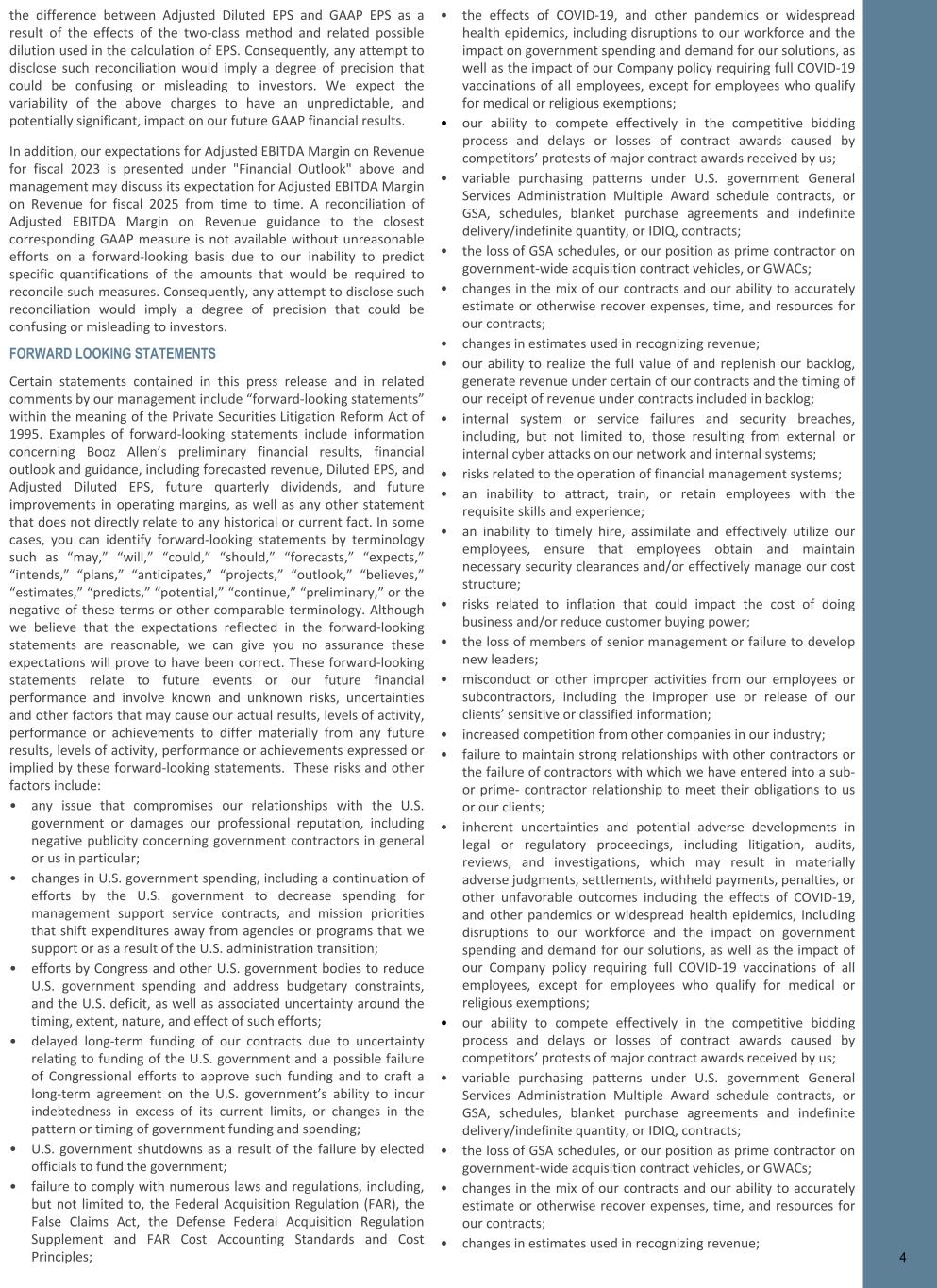 the difference between Adjusted Diluted EPS and GAAP EPS as a result of the effects of the two-class method and related possible dilution used in the calculation of EPS. Consequently, any attempt to disclose such reconciliation would imply a degree of precision that could be confusing or misleading to investors. We expect the variability of the above charges to have an unpredictable, and potentially significant, impact on our future GAAP financial results. In addition, our expectations for Adjusted EBITDA Margin on Revenue for fiscal 2023 is presented under "Financial Outlook" above and management may discuss its expectation for Adjusted EBITDA Margin on Revenue for fiscal 2025 from time to time. A reconciliation of Adjusted EBITDA Margin on Revenue guidance to the closest corresponding GAAP measure is not available without unreasonable efforts on a forward-looking basis due to our inability to predict specific quantifications of the amounts that would be required to reconcile such measures. Consequently, any attempt to disclose such reconciliation would imply a degree of precision that could be confusing or misleading to investors. FORWARD LOOKING STATEMENTS Certain statements contained in this press release and in related comments by our management include “forward-looking statements” within the meaning of the Private Securities Litigation Reform Act of 1995. Examples of forward-looking statements include information concerning Booz Allen’s preliminary financial results, financial outlook and guidance, including forecasted revenue, Diluted EPS, and Adjusted Diluted EPS, future quarterly dividends, and future improvements in operating margins, as well as any other statement that does not directly relate to any historical or current fact. In some cases, you can identify forward-looking statements by terminology such as “may,” “will,” “could,” “should,” “forecasts,” “expects,” “intends,” “plans,” “anticipates,” “projects,” “outlook,” “believes,” “estimates,” “predicts,” “potential,” “continue,” “preliminary,” or the negative of these terms or other comparable terminology. Although we believe that the expectations reflected in the forward-looking statements are reasonable, we can give you no assurance these expectations will prove to have been correct. These forward-looking statements relate to future events or our future financial performance and involve known and unknown risks, uncertainties and other factors that may cause our actual results, levels of activity, performance or achievements to differ materially from any future results, levels of activity, performance or achievements expressed or implied by these forward-looking statements. These risks and other factors include: • any issue that compromises our relationships with the U.S. government or damages our professional reputation, including negative publicity concerning government contractors in general or us in particular; • changes in U.S. government spending, including a continuation of efforts by the U.S. government to decrease spending for management support service contracts, and mission priorities that shift expenditures away from agencies or programs that we support or as a result of the U.S. administration transition; • efforts by Congress and other U.S. government bodies to reduce U.S. government spending and address budgetary constraints, and the U.S. deficit, as well as associated uncertainty around the timing, extent, nature, and effect of such efforts; • delayed long-term funding of our contracts due to uncertainty relating to funding of the U.S. government and a possible failure of Congressional efforts to approve such funding and to craft a long-term agreement on the U.S. government’s ability to incur indebtedness in excess of its current limits, or changes in the pattern or timing of government funding and spending; • U.S. government shutdowns as a result of the failure by elected officials to fund the government; • failure to comply with numerous laws and regulations, including, but not limited to, the Federal Acquisition Regulation (FAR), the False Claims Act, the Defense Federal Acquisition Regulation Supplement and FAR Cost Accounting Standards and Cost Principles; • the effects of COVID-19, and other pandemics or widespread health epidemics, including disruptions to our workforce and the impact on government spending and demand for our solutions, as well as the impact of our Company policy requiring full COVID-19 vaccinations of all employees, except for employees who qualify for medical or religious exemptions; • our ability to compete effectively in the competitive bidding process and delays or losses of contract awards caused by competitors’ protests of major contract awards received by us; • variable purchasing patterns under U.S. government General Services Administration Multiple Award schedule contracts, or GSA, schedules, blanket purchase agreements and indefinite delivery/indefinite quantity, or IDIQ, contracts; • the loss of GSA schedules, or our position as prime contractor on government-wide acquisition contract vehicles, or GWACs; • changes in the mix of our contracts and our ability to accurately estimate or otherwise recover expenses, time, and resources for our contracts; • changes in estimates used in recognizing revenue; • our ability to realize the full value of and replenish our backlog, generate revenue under certain of our contracts and the timing of our receipt of revenue under contracts included in backlog; • internal system or service failures and security breaches, including, but not limited to, those resulting from external or internal cyber attacks on our network and internal systems; • risks related to the operation of financial management systems; • an inability to attract, train, or retain employees with the requisite skills and experience; • an inability to timely hir