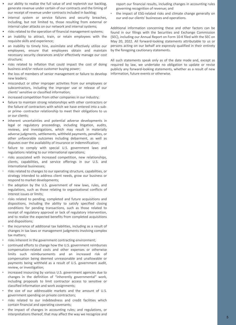5 • our ability to realize the full value of and replenish our backlog, generate revenue under certain of our contracts and the timing of our receipt of revenue under contracts included in backlog; • internal system or service failures and security breaches, including, but not limited to, those resulting from external or internal cyber attacks on our network and internal systems; • risks related to the operation of financial management systems; • an inability to attract, train, or retain employees with the requisite skills and experience; • an inability to timely hire, assimilate and effectively utilize our employees, ensure that employees obtain and maintain necessary security clearances and/or effectively manage our cost structure; • risks related to inflation that could impact the cost of doing business and/or reduce customer buying power; • the loss of members of senior management or failure to develop new leaders; • misconduct or other improper activities from our employees or subcontractors, including the improper use or release of our clients’ sensitive or classified information; • increased competition from other companies in our industry; • failure to maintain strong relationships with other contractors or the failure of contractors with which we have entered into a sub- or prime- contractor relationship to meet their obligations to us or our clients; • inherent uncertainties and potential adverse developments in legal or regulatory proceedings, including litigation, audits, reviews, and investigations, which may result in materially adverse judgments, settlements, withheld payments, penalties, or other unfavorable outcomes including debarment, as well as disputes over the availability of insurance or indemnification; ◦ failure to comply with special U.S. government laws and regulations relating to our international operations; ◦ risks associated with increased competition, new relationships, clients, capabilities, and service offerings in our U.S. and international businesses; ◦ risks related to changes to our operating structure, capabilities, or strategy intended to address client needs, grow our business or respond to market developments; ◦ the adoption by the U.S. government of new laws, rules, and regulations, such as those relating to organizational conflicts of interest issues or limits; ◦ risks related to pending, completed and future acquisitions and dispositions, including the ability to satisfy specified closing conditions for pending transactions, such as those related to receipt of regulatory approval or lack of regulatory intervention, and to realize the expected benefits from completed acquisitions and dispositions; ◦ the incurrence of additional tax liabilities, including as a result of changes in tax laws or management judgments involving complex tax matters; ▪ risks inherent in the government contracting environment; ▪ continued efforts to change how the U.S. government reimburses compensation-related costs and other expenses or otherwise limits such reimbursements and an increased risk of compensation being deemed unreasonable and unallowable or payments being withheld as a result of U.S. government audit, review, or investigation; ▪ increased insourcing by various U.S. government agencies due to changes in the definition of “inherently governmental” work, including proposals to limit contractor access to sensitive or classified information and work assignments; ▪ the size of our addressable markets and the amount of U.S. government spending on private contractors; ▪ risks related to our indebtedness and credit facilities which contain financial and operating covenants; ▪ the impact of changes in accounting rules; and regulations, or interpretations thereof, that may affect the way we recognize and report our financial results, including changes in accounting rules governing recognition of revenue; and ▪ the impact of ESG-related risks and climate change generally on our and our clients' businesses and operations. Additional information concerning these and other factors can be found in our filings with the Securities and Exchange Commission (SEC), including our Annual Report on Form 10-K filed with the SEC on May 20, 2022. All forward-looking statements attributable to us or persons acting on our behalf are expressly qualified in their entirety by the foregoing cautionary statements. All such statements speak only as of the date made and, except as required by law, we undertake no obligation to update or revise publicly any forward-looking statements, whether as a result of new information, future events or otherwise. 5