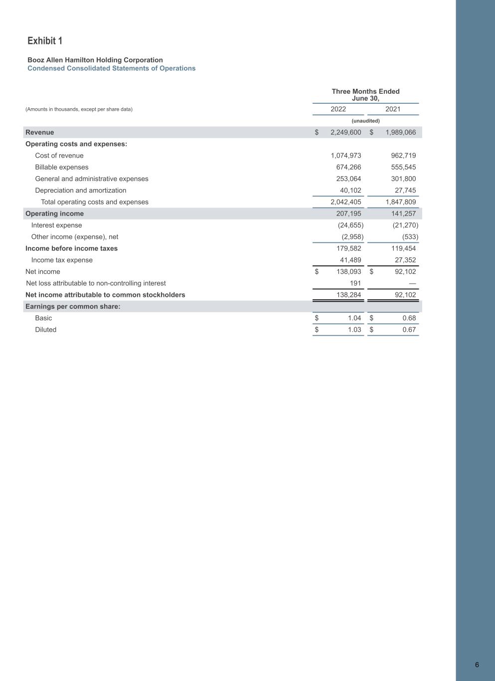 Exhibit 1 Booz Allen Hamilton Holding Corporation Condensed Consolidated Statements of Operations 6 Three Months Ended June 30, (Amounts in thousands, except per share data) 2022 2021 (unaudited) Revenue $ 2,249,600 $ 1,989,066 Operating costs and expenses: Cost of revenue 1,074,973 962,719 Billable expenses 674,266 555,545 General and administrative expenses 253,064 301,800 Depreciation and amortization 40,102 27,745 Total operating costs and expenses 2,042,405 1,847,809 Operating income 207,195 141,257 Interest expense (24,655) (21,270) Other income (expense), net (2,958) (533) Income before income taxes 179,582 119,454 Income tax expense 41,489 27,352 Net income $ 138,093 $ 92,102 Net loss attributable to non-controlling interest 191 — Net income attributable to common stockholders 138,284 92,102 Earnings per common share: Basic $ 1.04 $ 0.68 Diluted $ 1.03 $ 0.67 6