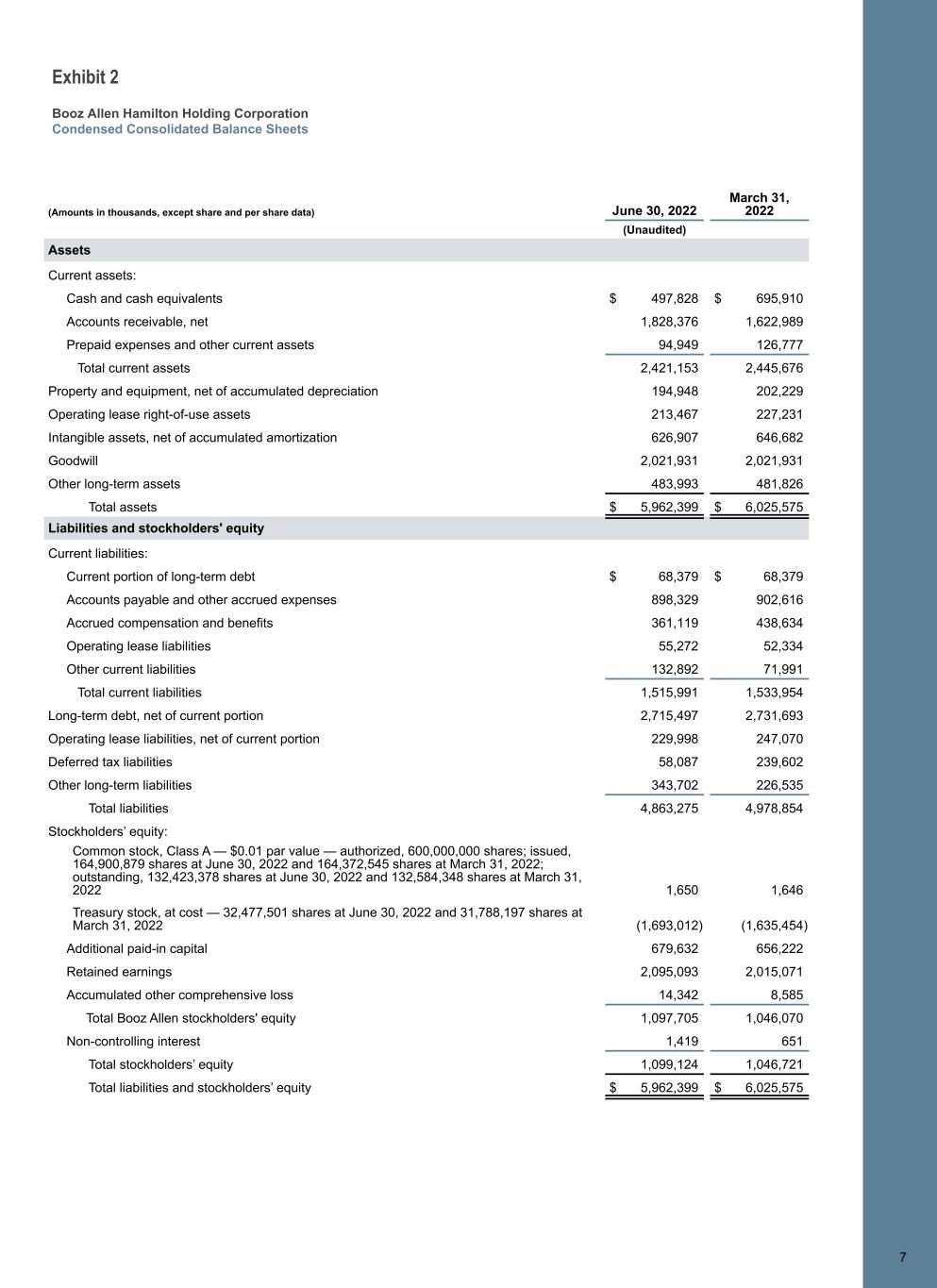 Exhibit 2 Booz Allen Hamilton Holding Corporation Condensed Consolidated Balance Sheets (Amounts in thousands, except share and per share data) June 30, 2022 March 31, 2022 (Unaudited) Assets Current assets: Cash and cash equivalents $ 497,828 $ 695,910 Accounts receivable, net 1,828,376 1,622,989 Prepaid expenses and other current assets 94,949 126,777 Total current assets 2,421,153 2,445,676 Property and equipment, net of accumulated depreciation 194,948 202,229 Operating lease right-of-use assets 213,467 227,231 Intangible assets, net of accumulated amortization 626,907 646,682 Goodwill 2,021,931 2,021,931 Other long-term assets 483,993 481,826 Total assets $ 5,962,399 $ 6,025,575 Liabilities and stockholders' equity Current liabilities: Current portion of long-term debt $ 68,379 $ 68,379 Accounts payable and other accrued expenses 898,329 902,616 Accrued compensation and benefits 361,119 438,634 Operating lease liabilities 55,272 52,334 Other current liabilities 132,892 71,991 Total current liabilities 1,515,991 1,533,954 Long-term debt, net of current portion 2,715,497 2,731,693 Operating lease liabilities, net of current portion 229,998 247,070 Deferred tax liabilities 58,087 239,602 Other long-term liabilities 343,702 226,535 Total liabilities 4,863,275 4,978,854 Stockholders’ equity: Common stock, Class A — $0.01 par value — authorized, 600,000,000 shares; issued, 164,900,879 shares at June 30, 2022 and 164,372,545 shares at March 31, 2022; outstanding, 132,423,378 shares at June 30, 2022 and 132,584,348 shares at March 31, 2022 1,650 1,646 Treasury stock, at cost — 32,477,501 shares at June 30, 2022 and 31,788,197 shares at March 31, 2022 (1,693,012) (1,635,454) Additional paid-in capital 679,632 656,222 Retained earnings 2,095,093 2,015,071 Accumulated other comprehensive loss 14,342 8,585 Total Booz Allen stockholders' equity 1,097,705 1,046,070 Non-controlling interest 1,419 651 Total stockholders’ equity 1,099,124 1,046,721 Total liabilities and stockholders’ equity $ 5,962,399 $ 6,025,575 77