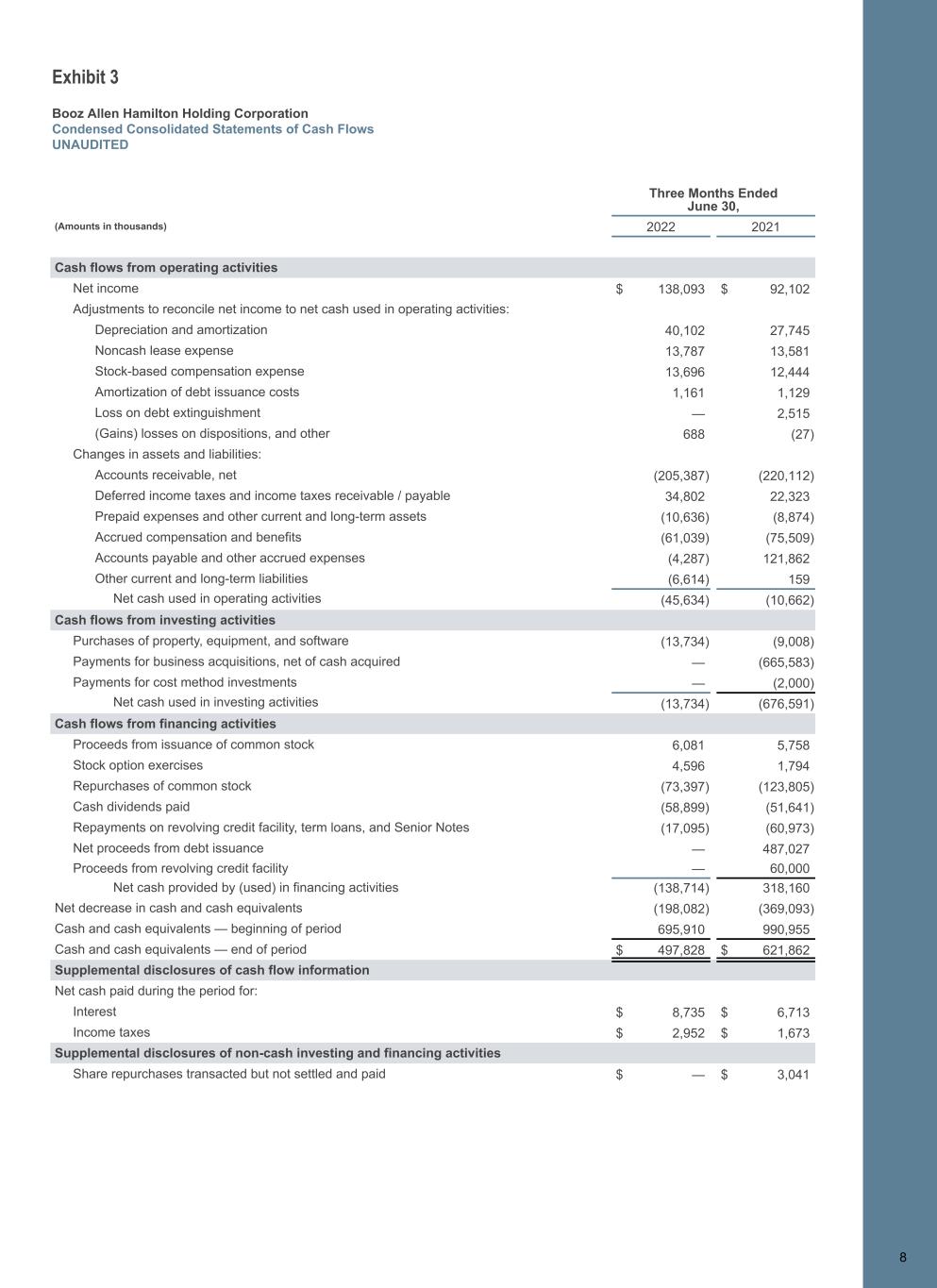 Exhibit 3 Booz Allen Hamilton Holding Corporation Condensed Consolidated Statements of Cash Flows UNAUDITED 8 Three Months Ended June 30, (Amounts in thousands) 2022 2021 Cash flows from operating activities Net income $ 138,093 $ 92,102 Adjustments to reconcile net income to net cash used in operating activities: Depreciation and amortization 40,102 27,745 Noncash lease expense 13,787 13,581 Stock-based compensation expense 13,696 12,444 Amortization of debt issuance costs 1,161 1,129 Loss on debt extinguishment — 2,515 (Gains) losses on dispositions, and other 688 (27) Changes in assets and liabilities: Accounts receivable, net (205,387) (220,112) Deferred income taxes and income taxes receivable / payable 34,802 22,323 Prepaid expenses and other current and long-term assets (10,636) (8,874) Accrued compensation and benefits (61,039) (75,509) Accounts payable and other accrued expenses (4,287) 121,862 Other current and long-term liabilities (6,614) 159 Net cash used in operating activities (45,634) (10,662) Cash flows from investing activities Purchases of property, equipment, and software (13,734) (9,008) Payments for business acquisitions, net of cash acquired — (665,583) Payments for cost method investments — (2,000) Net cash used in investing activities (13,734) (676,591) Cash flows from financing activities Proceeds from issuance of common stock 6,081 5,758 Stock option exercises 4,596 1,794 Repurchases of common stock (73,397) (123,805) Cash dividends paid (58,899) (51,641) Repayments on revolving credit facility, term loans, and Senior Notes (17,095) (60,973) Net proceeds from debt issuance — 487,027 Proceeds from revolving credit facility — 60,000 Net cash provided by (used) in financing activities (138,714) 318,160 Net decrease in cash and cash equivalents (198,082) (369,093) Cash and cash equivalents — beginning of period 695,910 990,955 Cash and cash equivalents — end of period $ 497,828 $ 621,862 Supplemental disclosures of cash flow information Net cash paid during the period for: Interest $ 8,735 $ 6,713 Income taxes $ 2,952 $ 1,673 Supplemental disclosures of non-cash investing and financing activities Share repurchases transacted but not settled and paid $ — $ 3,041 8