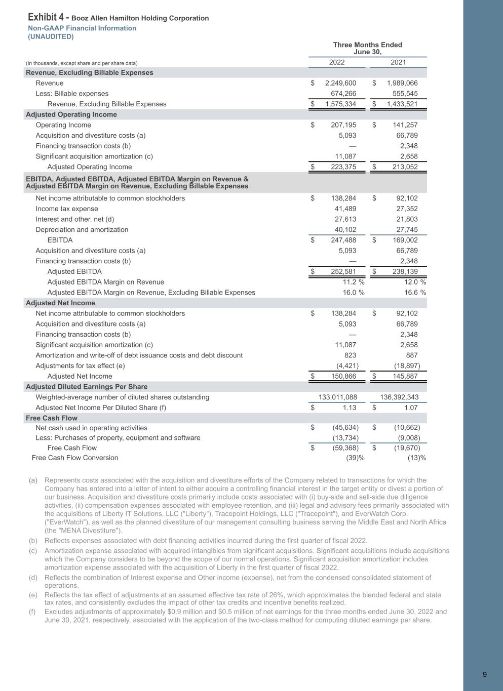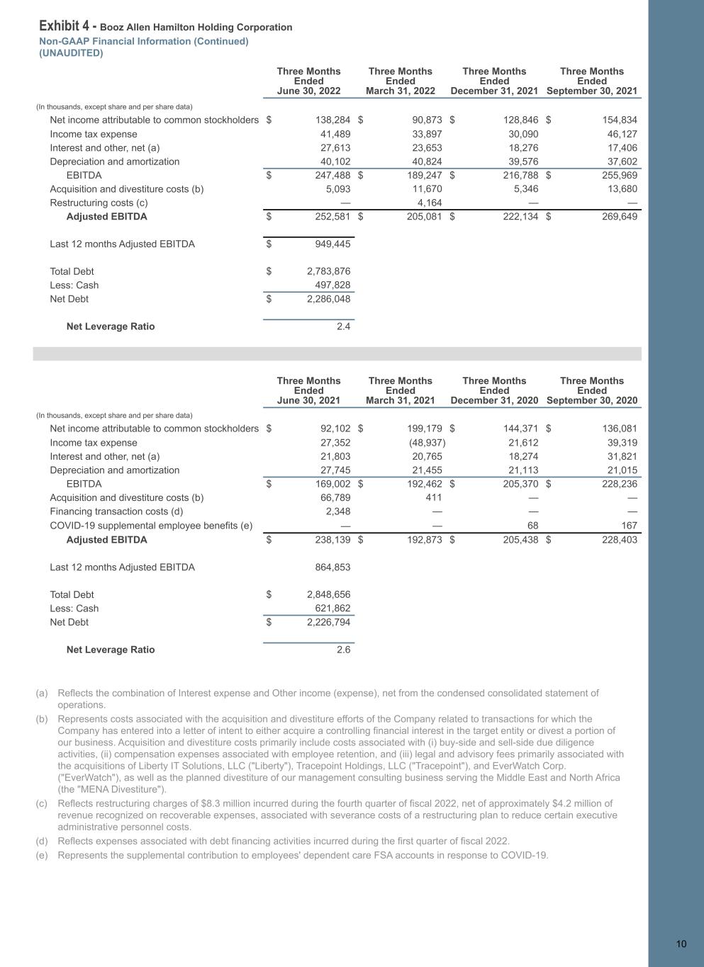 Exhibit 4 - Booz Allen Hamilton Holding Corporation Non-GAAP Financial Information (UNAUDITED) 9 Three Months Ended June 30, (In thousands, except share and per share data) 2022 2021 Revenue, Excluding Billable Expenses Revenue $ 2,249,600 $ 1,989,066 Less: Billable expenses 674,266 555,545 Revenue, Excluding Billable Expenses $ 1,575,334 $ 1,433,521 Adjusted Operating Income Operating Income $ 207,195 $ 141,257 Acquisition and divestiture costs (a) 5,093 66,789 Financing transaction costs (b) — 2,348 Significant acquisition amortization (c) 11,087 2,658 Adjusted Operating Income $ 223,375 $ 213,052 EBITDA, Adjusted EBITDA, Adjusted EBITDA Margin on Revenue & Adjusted EBITDA Margin on Revenue, Excluding Billable Expenses Net income attributable to common stockholders $ 138,284 $ 92,102 Income tax expense 41,489 27,352 Interest and other, net (d) 27,613 21,803 Depreciation and amortization 40,102 27,745 EBITDA $ 247,488 $ 169,002 Acquisition and divestiture costs (a) 5,093 66,789 Financing transaction costs (b) — 2,348 Adjusted EBITDA $ 252,581 $ 238,139 Adjusted EBITDA Margin on Revenue 11.2 % 12.0 % Adjusted EBITDA Margin on Revenue, Excluding Billable Expenses 16.0 % 16.6 % Adjusted Net Income Net income attributable to common stockholders $ 138,284 $ 92,102 Acquisition and divestiture costs (a) 5,093 66,789 Financing transaction costs (b) — 2,348 Significant acquisition amortization (c) 11,087 2,658 Amortization and write-off of debt issuance costs and debt discount 823 887 Adjustments for tax effect (e) (4,421) (18,897) Adjusted Net Income $ 150,866 $ 145,887 Adjusted Diluted Earnings Per Share Weighted-average number of diluted shares outstanding 133,011,088 136,392,343 Adjusted Net Income Per Diluted Share (f) $ 1.13 $ 1.07 Free Cash Flow Net cash used in operating activities $ (45,634) $ (10,662) Less: Purchases of property, equipment and software (13,734) (9,008) Free Cash Flow $ (59,368) $ (19,670) Free Cash Flow Conversion (39) % (13) % 9 (a) Represents costs associated with the acquisition and divestiture efforts of the Company related to transactions for which the Company has entered into a letter of intent to either acquire a controlling financial interest in the target entity or divest a portion of our business. Acquisition and divestiture costs primarily include costs associated with (i) buy-side and sell-side due diligence activities, (ii) compensation expenses associated with employee retention, and (iii) legal and advisory fees primarily associated with the acquisitions of Liberty IT Solutions, LLC ("Liberty"), Tracepoint Holdings, LLC ("Tracepoint"), and EverWatch Corp. ("EverWatch"), as well as the planned divestiture of our management consulting business serving the Middle East and North Africa (the "MENA Divestiture"). (b) Reflects expenses associated with debt financing activities incurred during the first quarter of fiscal 2022. (c) Amortization expense associated with acquired intangibles from significant acquisitions. Significant acquisitions include acquisitions which the Company considers to be beyond the scope of our normal operations. Significant acquisition amortization includes amortization expense associated with the acquisition of Liberty in the first quarter of fiscal 2022. (d) Reflects the combination of Interest expense and Other income (expense), net from the condensed consolidated statement of operations. (e) Reflects the tax effect of adjustments at an assumed effective tax rate of 26%, which approximates the blended federal and state tax rates, and consistently excludes the impact of other tax credits and incentive benefits realized. (f) Excludes adjustments of approximately $0.9 million and $0.5 million of net earnings for the three months ended June 30, 2022 and June 30, 2021, respectively, associated with the application of the two-class method for computing diluted earnings per share.